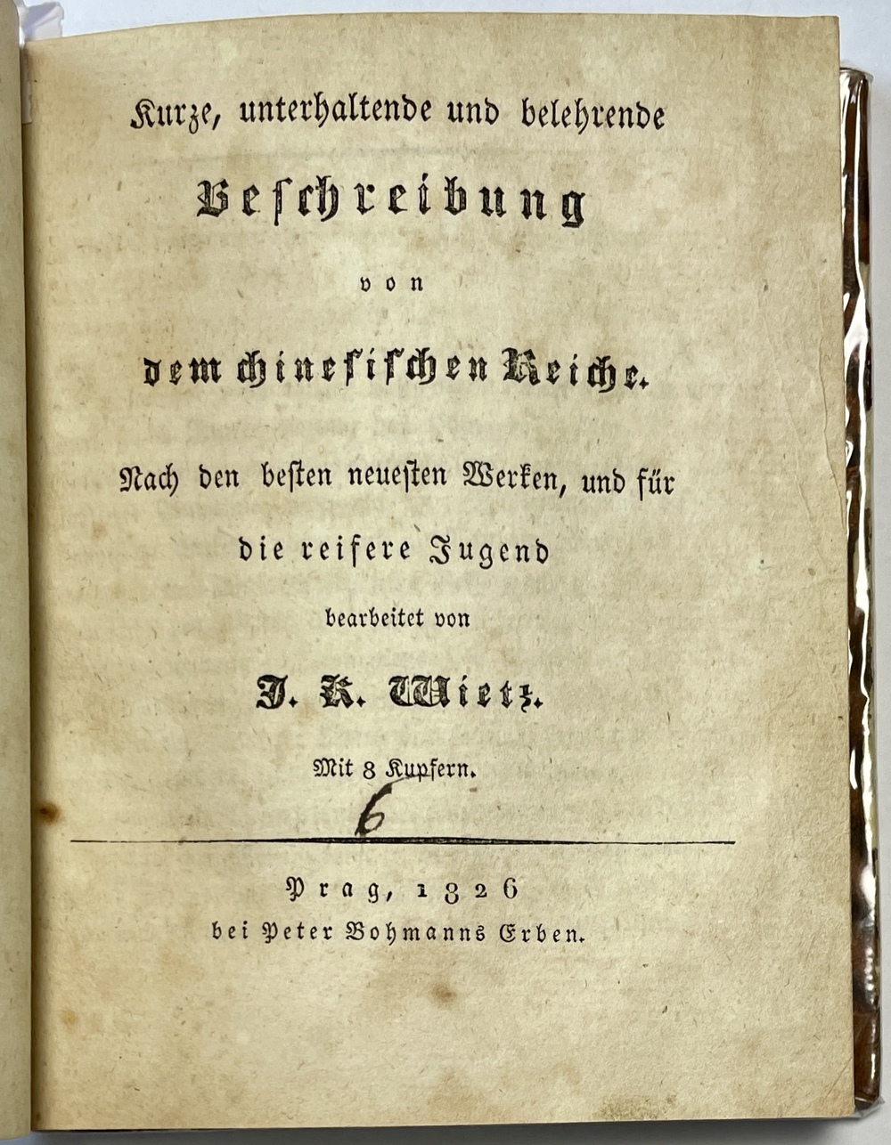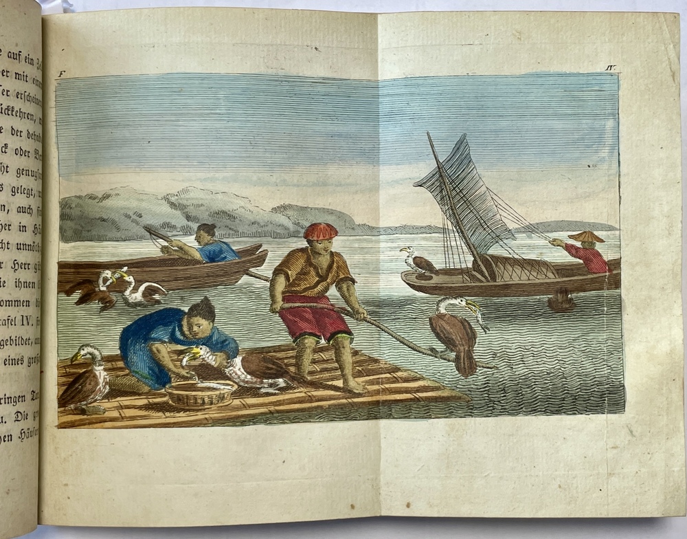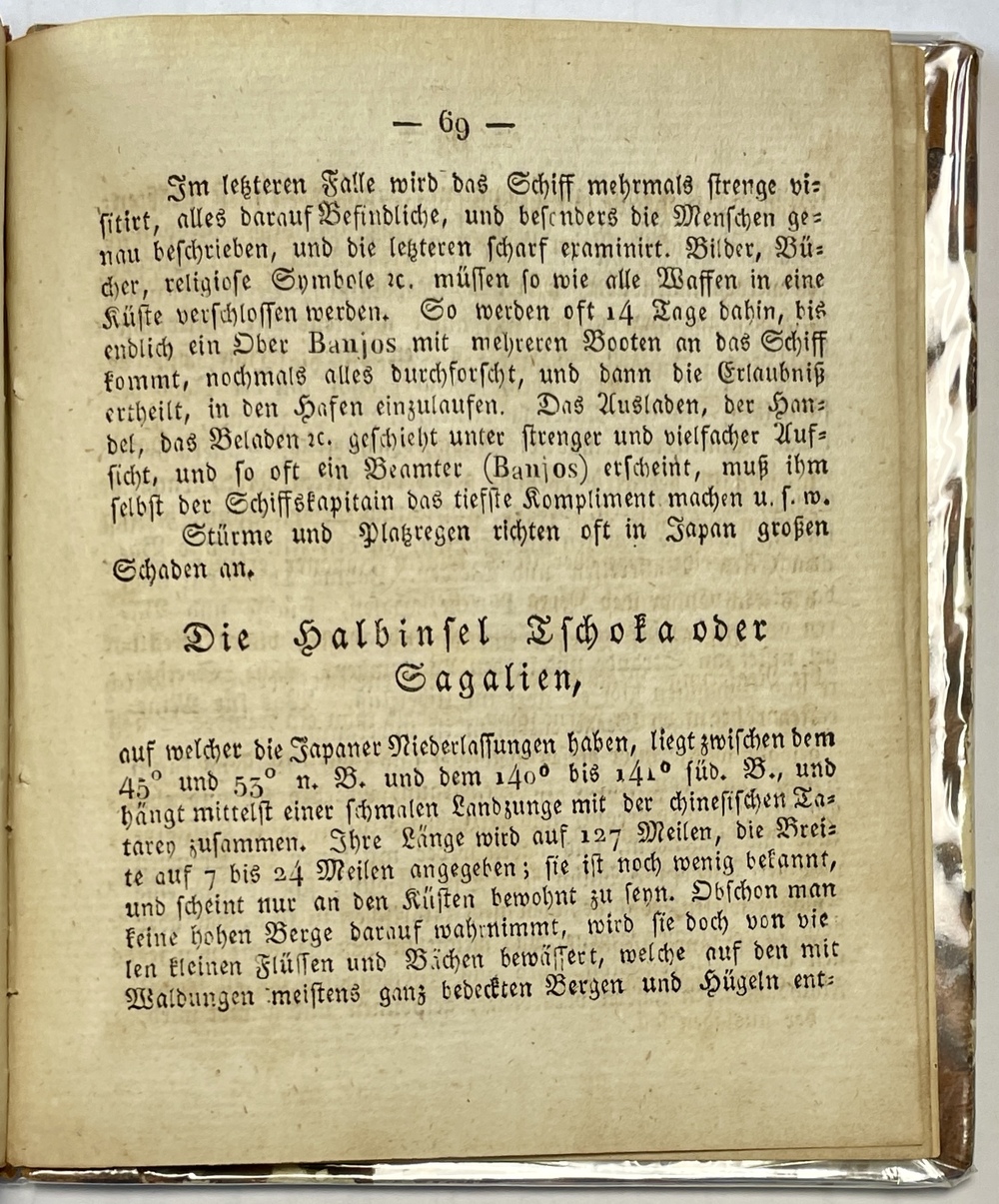 この作品はプラハで刊行されたということもあってか、これまで日本関係欧文図書としては、その存在すらほとんど知られることがなかったものと思われ、国内でも所蔵を確認することができません。また、現在の古書市場でも流通することが少ないように見受けられます。本書は残念ながら、本来収録されていたであろう日本に関する図版1枚(クルーゼンシュテルンあたりの作品から転用したと思われる日本の人々を描いた図)を欠いてしまってい流用ですが、テキストは完備しており、日本関係欧文図書として貴重な1冊と言えるでしょう。