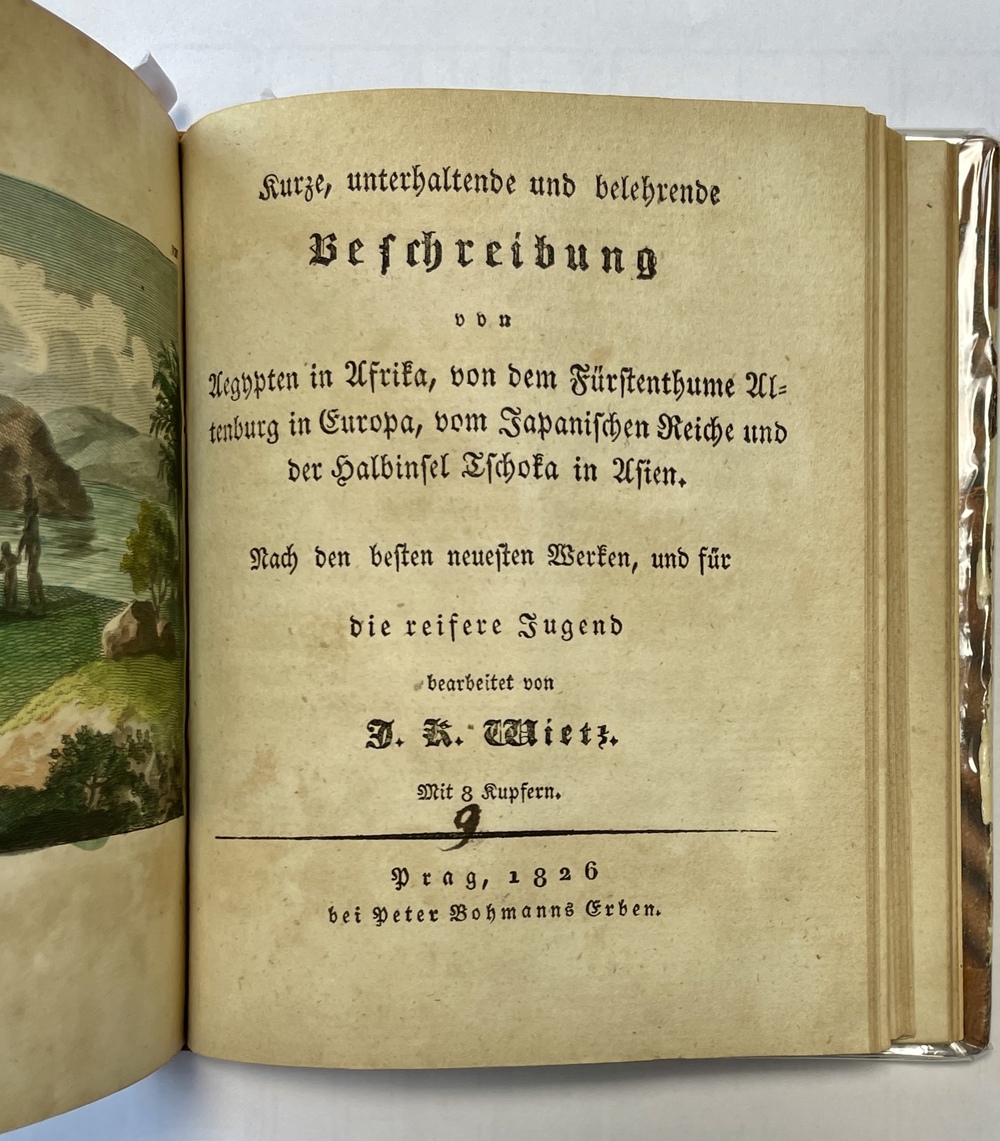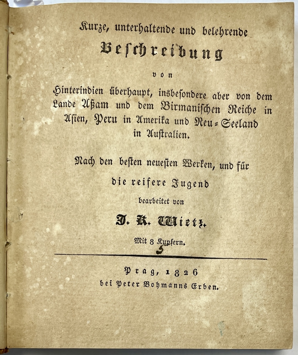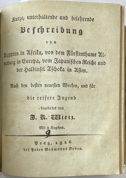 著者ヴィーツについての詳しいことはわかっていませんが、この叢書は少なくとも10巻以上が刊行されていることが確認できることに鑑みると、19世紀初めのプラハにおいて非常に精力的に活動していた著作家であると思われます。この叢書が全体で何作品が刊行されたのかを正確に確認することは困難ですが、おそらくヨーロッパ、アジア、アフリカ、アメリカの各国、各地についてその人々と風習、歴史などを平易な文章に図版を添えて紹介するという基本構成はいずれの巻であっても同様だったたようです。ヴィーツによるこの叢書作品は、地理的なまとまりを考慮せずに任意の国や地域を(ほとんどランダムに)各巻で紹介していることがその特徴の一つで、例えば本書の最初に収録されている巻では、インド、ビルマ、ペルー、ニュージーランドが論じられ、2番目の巻では全て中国に、3番目の巻(タイトルページなし)ではフランス、そして最後の4番目の巻では、エジプト、アルテンブルク、日本、サハリンが論じられています。本書に収録されている4作品各巻のタイトルと書誌情報を記すと下記の通りとなります。