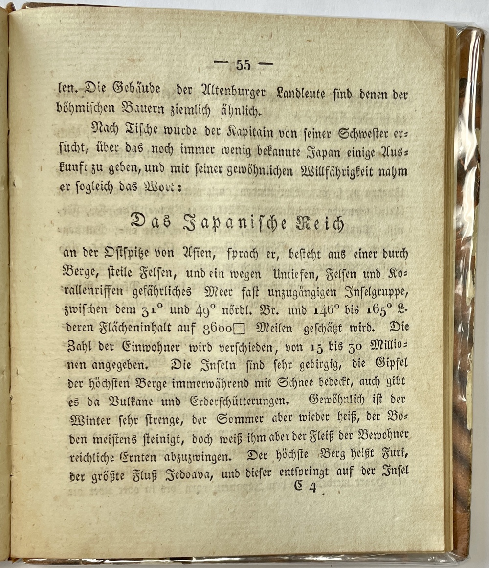 本書は、19世紀前半のプラハで活躍した著作家ヴィーツ(J. K. Wietz, 1791 - 1844)が10代の若者向けに書いた作品で、世界各国地域の人々とその風俗、歴史などを解説した叢書作品のうち4作品を1冊にまとめたものです。4作品目には日本を論じた章が含まれており、15ページほどのまとまった日本関係記事を確認することができます。