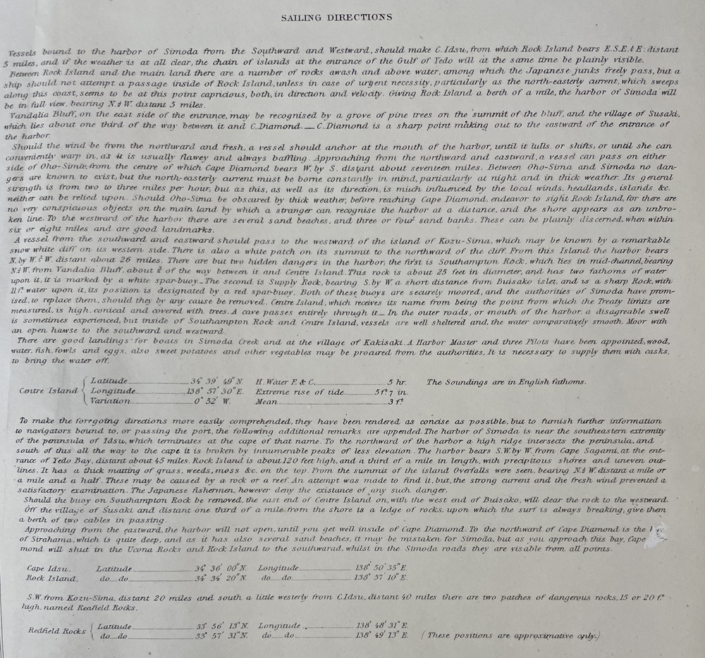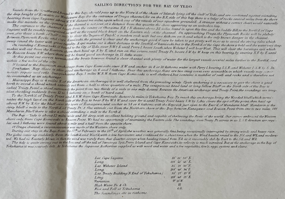 いずれにしましても、ペリーの日本遠征時の測量調査に基づいて、それまで西洋諸国の間で未知の海域となっていた日本近海の海図や水路情報を世界に向けて初めて公開し、日本の「開国」をより一層進める原動力になったという点において、本書は日本近代史において画期的な意義を有する重要な海図集と言えるでしょう。