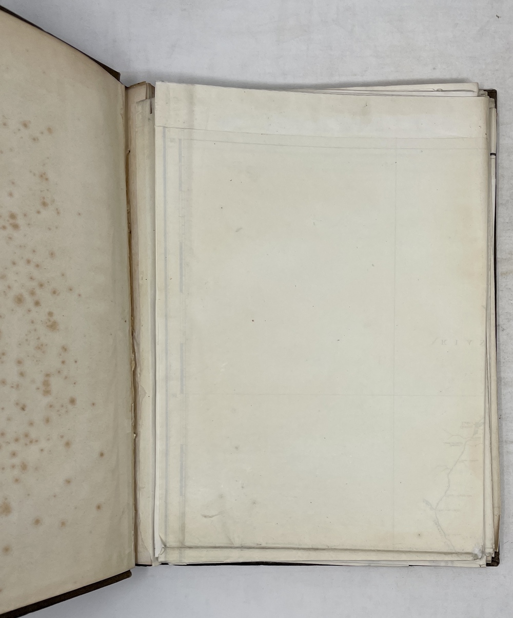 本書は上記で言及されている「水路図を別冊とする4冊本」のうちの水路図巻と思われるもので、現存するものが非常に少ない大変貴重な1冊です。『日本遠征記』は、非常にボリュームのある書物であったことも災いしてか、製本が破損してしまうことが非常に多く、現存するものの多くが改装が施されたものとなっています。特に海図を14点も巻末に収録している第2巻は製本が破損してしまうことが多く、改装される際に海図だけを別綴じとして、もともと全3巻であったものを全4巻構成に変えてしまうという事例もよく見られます。したがって、原装丁でない改装本については、たとえ海図が独立巻としてあっても、それが当初からのものなのか、後年になって綴じ直されたものであったのかを特定することは非常に困難です。その意味では、本書は『日本遠征記』刊行当時の出版社による現装丁が保たれていることから、間違いなく刊行当時から海図のみを別巻として刊行した希少本であることを確認することができます。