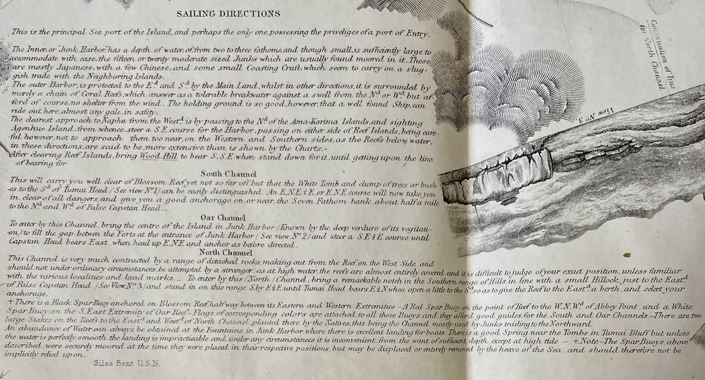 THE HARBOR of NAPHA LEW CHEW ID. Surveyed by order of COMMODORE M.C.PERRY U.S.N. by Lieut. S.Bent assisted by F.S.Conver, J.W.Bennet, and D.Ochiltree, Actg. Masters; J.H.March, E.H.Grey, Pd. Midshipmen: O.F.Stanton, W.F.Boardman, Midshipmen 1853.