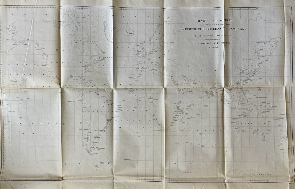 CHART OF THE WORLD Shwing the TRACK of the U.S. Steam Frigates MISSISSIPPI, SUSQUEHANNA AND POWHATAN. As FLAGSHIPS OF THE JAPAN SQUADORON. Under command of COMMODORE M.C.PERRY. U.S.N. 1853-54.