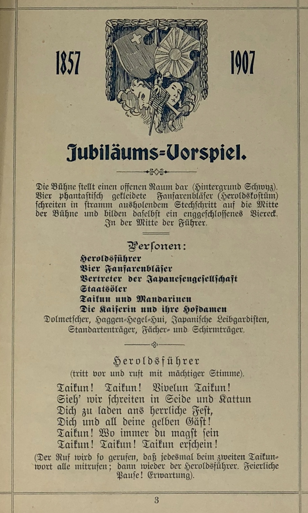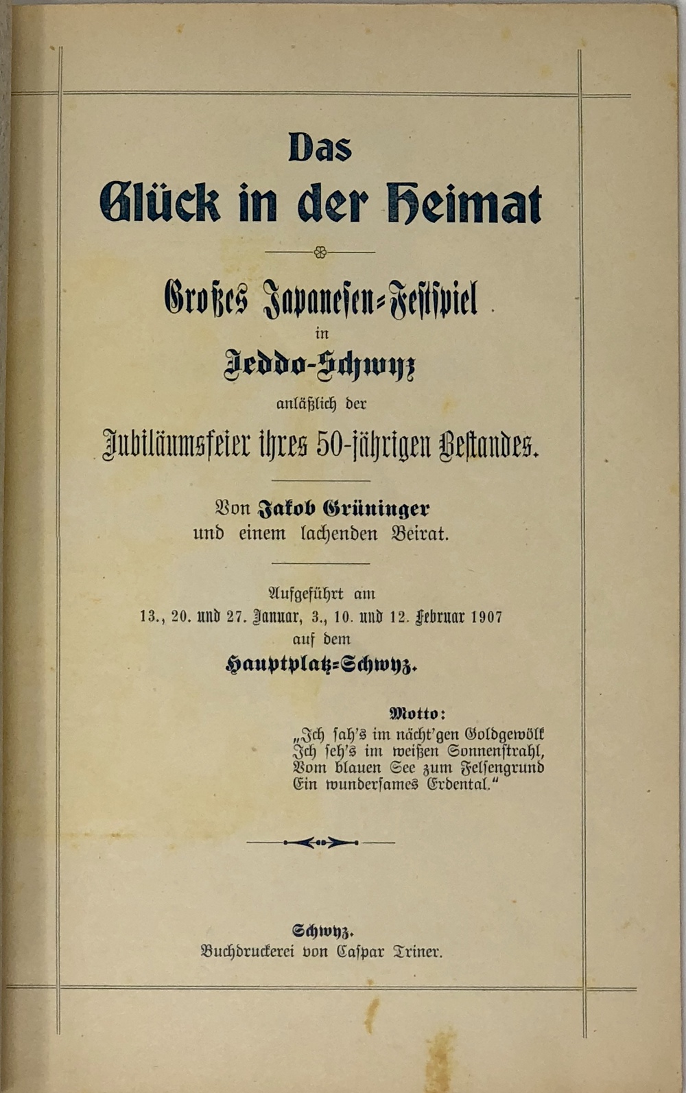 Das Glück in der Heimat. Großes volksschauspiel der Japanesen=Gesellschaft in Jeddo-Schwyz anläßlich der Jubiläumsfeier ihres 50=jährigen Bestandes.