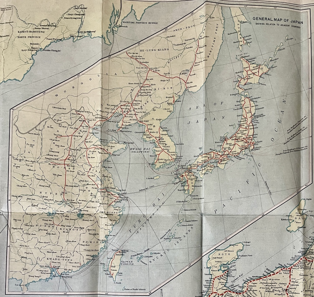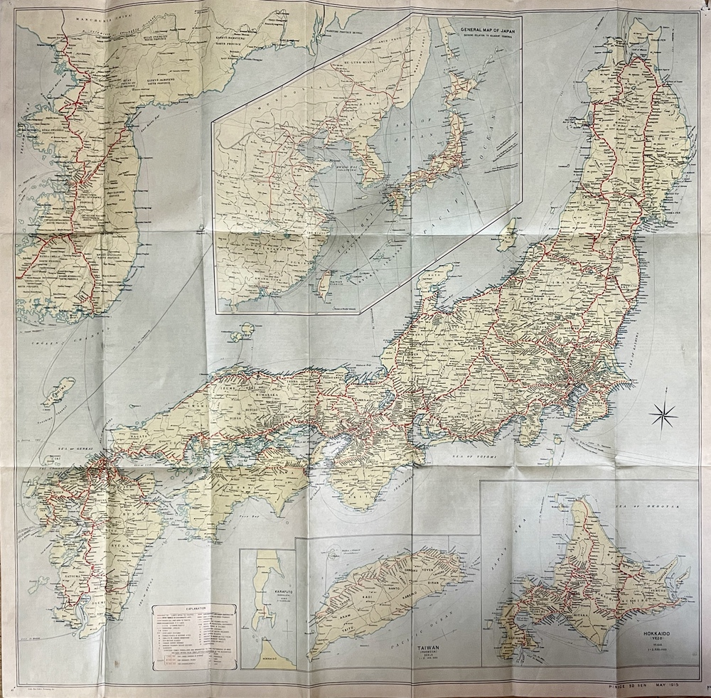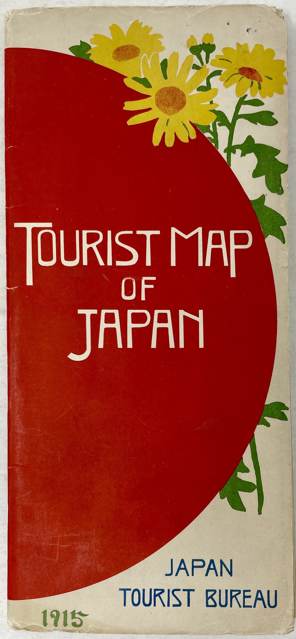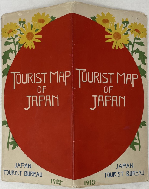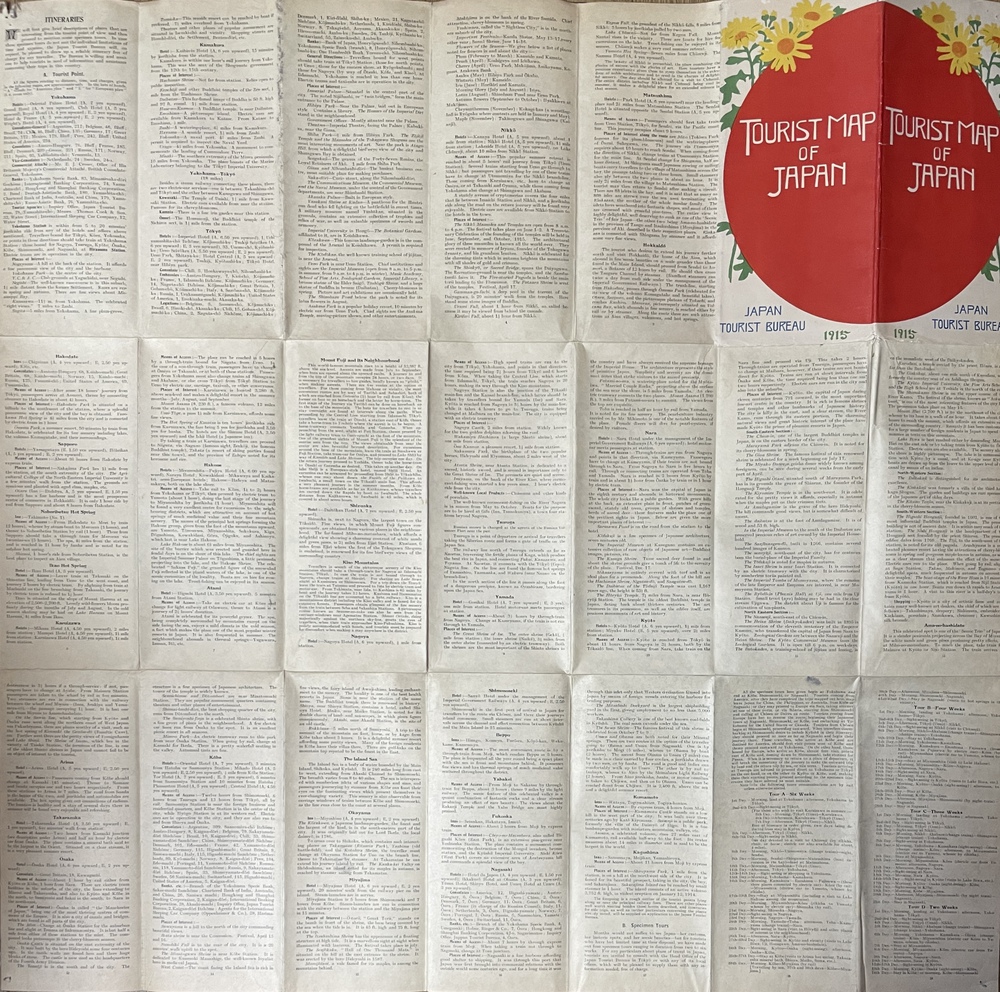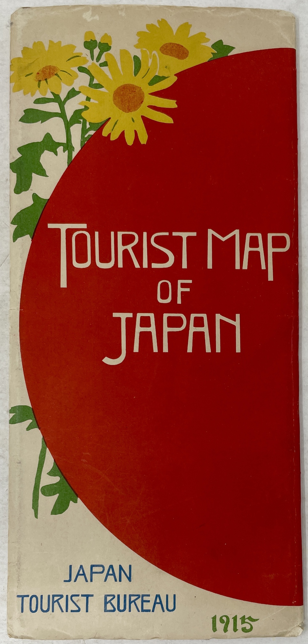 このガイドマップはジャパン・ツーリスト・ビューローが発行、発売していた最初期の「英文日本地図」で1915年5月に発行されたものです。ビューロは、1913年11月に最初の「英文日本案内」(JAPAN)の発行、配布に続いて、最初の販売印刷物として「京都案内」(Map & Guide of Kyoto and Environs)を1915年頃に発行、販売しましたが、「これと前後して」(後掲)発売されたのが「英文日本地図」であるとされています。 「これ(「英文京都案内」の販売を指す:引用者注)と前後して英文日本地図が発売された。これは全国主要遊覧地を網羅し、鉄道は官私線のほか予定線をも挙げ、各遊覧地の交通、旅館、名勝の案内を附したもので杉野敬次郎氏が担当作成された。これが現在ビューローで発売している「英文日本案内地図」の初版である。杉野氏は技術出身で地図の作成には第一人者で、当時世間から模範とされたビューローの案内地図は大抵同氏の手によったものである。」 (山中忠雄(編)『回顧録』ジャパン・ツーリスト・ビューロー、1937年、82、83ページより) このガイドマップはここに記されている特徴と合致する内容で、ビューローによる「英文日本地図」初版に限りなく近いものではないかと思われます。鮮やかな表紙デザインは、その名前こそ明記されていませんが、最初期からビューローによる出版物のデザインを手がけた杉浦非水によるものと思われ、その印刷も最初の「英文日本案内」を手がけた東京印刷が担っています。地図裏面のテキストでは、上掲記述に合致して、外国汽船の発着拠点であった横浜から始まり、鎌倉、東京、日光、松島、北海道、函館、札幌、登別温泉、伊香保温泉、軽井沢、箱根、熱海、富士山とその近郊、静岡、木曽山脈、名古屋、敦賀、山田、奈良、京都、天橋立、有馬、宝塚、大阪、神戸、瀬戸内海、岡山、宮島、下関、別府、耶馬溪、福岡、長崎、熊本、鹿児島、という順で各地の「交通、旅館、名所の案内」が記されています。また、末尾には6週間、4週間、3週間、2週間という4パターンの日本周遊プラン例が掲載されているほか、ここに挙げた日程や予算がうまく当てはまらない旅行者に対してビューローは旅行プランの作成を無償で喜んで請け負う旨が冒頭に記されています。 地図面は「当時世間から模範とされた」と上でも述べられているように、すぐに全体を見渡すことのできる簡潔さを備えながらも旅行者にとって必要な情報がしっかりと盛り込まれており、建設予定も含めた鉄道路線や主要駅、汽船の発着地などがわかりやすくリトグラフ印刷で表現されています。本州、四国、九州を中央に朝鮮半島や大陸部を図郭におさめて描き、上下の別図には、樺太、台湾、北海道、そして汽船航路のつながりを一望できるよう日本と周辺地域全体の図が描かれています。地図右下の余白には「PIRCE 50 SEN MAY 1915」と印字されており、冒頭の「PIRCE」は、正しくは「PRICE」とするべきところを誤ったものと思われます。この50銭という価格は、上述した「英文京都案内」の30銭よりも20銭高い価格設定です。 このガイドマップがビューローによる「英文日本案内地図」の初版であるかどうかを断定するにはさらなる調査が必要ですが、のちに改訂を重ねながら繰り返し発行されることになる「英文日本案内地図」の原型に極めて近い特徴を備えていることは確かであると思われます。後年の「英文日本案内地図」は地図の周囲に写真を配すなど様々な工夫が加えられていきましたが、このガイドマップはその最初期の姿を伝えてくれる貴重な1点であると言えるでしょう。
