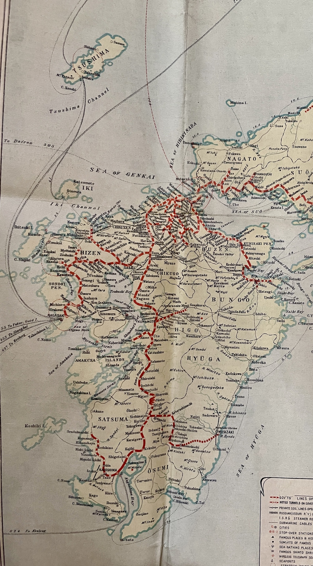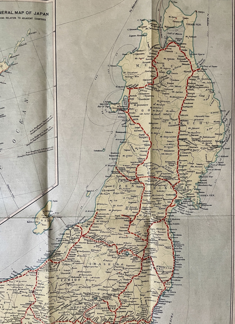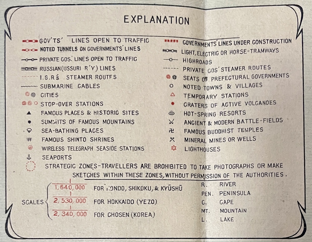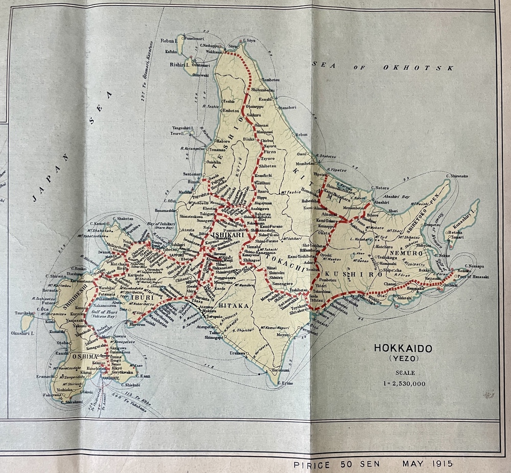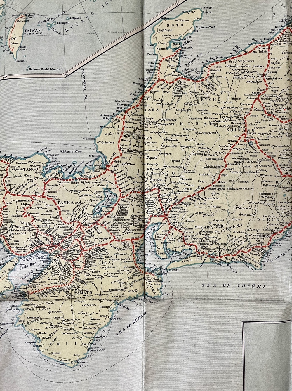 このガイドマップはジャパン・ツーリスト・ビューローが発行、発売していた最初期の「英文日本地図」で1915年5月に発行されたものです。ビューロは、1913年11月に最初の「英文日本案内」(JAPAN)の発行、配布に続いて、最初の販売印刷物として「京都案内」(Map & Guide of Kyoto and Environs)を1915年頃に発行、販売しましたが、「これと前後して」(後掲)発売されたのが「英文日本地図」であるとされています。 「これ(「英文京都案内」の販売を指す:引用者注)と前後して英文日本地図が発売された。これは全国主要遊覧地を網羅し、鉄道は官私線のほか予定線をも挙げ、各遊覧地の交通、旅館、名勝の案内を附したもので杉野敬次郎氏が担当作成された。これが現在ビューローで発売している「英文日本案内地図」の初版である。杉野氏は技術出身で地図の作成には第一人者で、当時世間から模範とされたビューローの案内地図は大抵同氏の手によったものである。」 (山中忠雄(編)『回顧録』ジャパン・ツーリスト・ビューロー、1937年、82、83ページより) このガイドマップはここに記されている特徴と合致する内容で、ビューローによる「英文日本地図」初版に限りなく近いものではないかと思われます。鮮やかな表紙デザインは、その名前こそ明記されていませんが、最初期からビューローによる出版物のデザインを手がけた杉浦非水によるものと思われ、その印刷も最初の「英文日本案内」を手がけた東京印刷が担っています。地図裏面のテキストでは、上掲記述に合致して、外国汽船の発着拠点であった横浜から始まり、鎌倉、東京、日光、松島、北海道、函館、札幌、登別温泉、伊香保温泉、軽井沢、箱根、熱海、富士山とその近郊、静岡、木曽山脈、名古屋、敦賀、山田、奈良、京都、天橋立、有馬、宝塚、大阪、神戸、瀬戸内海、岡山、宮島、下関、別府、耶馬溪、福岡、長崎、熊本、鹿児島、という順で各地の「交通、旅館、名所の案内」が記されています。また、末尾には6週間、4週間、3週間、2週間という4パターンの日本周遊プラン例が掲載されているほか、ここに挙げた日程や予算がうまく当てはまらない旅行者に対してビューローは旅行プランの作成を無償で喜んで請け負う旨が冒頭に記されています。 地図面は「当時世間から模範とされた」と上でも述べられているように、すぐに全体を見渡すことのできる簡潔さを備えながらも旅行者にとって必要な情報がしっかりと盛り込まれており、建設予定も含めた鉄道路線や主要駅、汽船の発着地などがわかりやすくリトグラフ印刷で表現されています。本州、四国、九州を中央に朝鮮半島や大陸部を図郭におさめて描き、上下の別図には、樺太、台湾、北海道、そして汽船航路のつながりを一望できるよう日本と周辺地域全体の図が描かれています。地図右下の余白には「PIRCE 50 SEN MAY 1915」と印字されており、冒頭の「PIRCE」は、正しくは「PRICE」とするべきところを誤ったものと思われます。この50銭という価格は、上述した「英文京都案内」の30銭よりも20銭高い価格設定です。 このガイドマップがビューローによる「英文日本案内地図」の初版であるかどうかを断定するにはさらなる調査が必要ですが、のちに改訂を重ねながら繰り返し発行されることになる「英文日本案内地図」の原型に極めて近い特徴を備えていることは確かであると思われます。後年の「英文日本案内地図」は地図の周囲に写真を配すなど様々な工夫が加えられていきましたが、このガイドマップはその最初期の姿を伝えてくれる貴重な1点であると言えるでしょう。