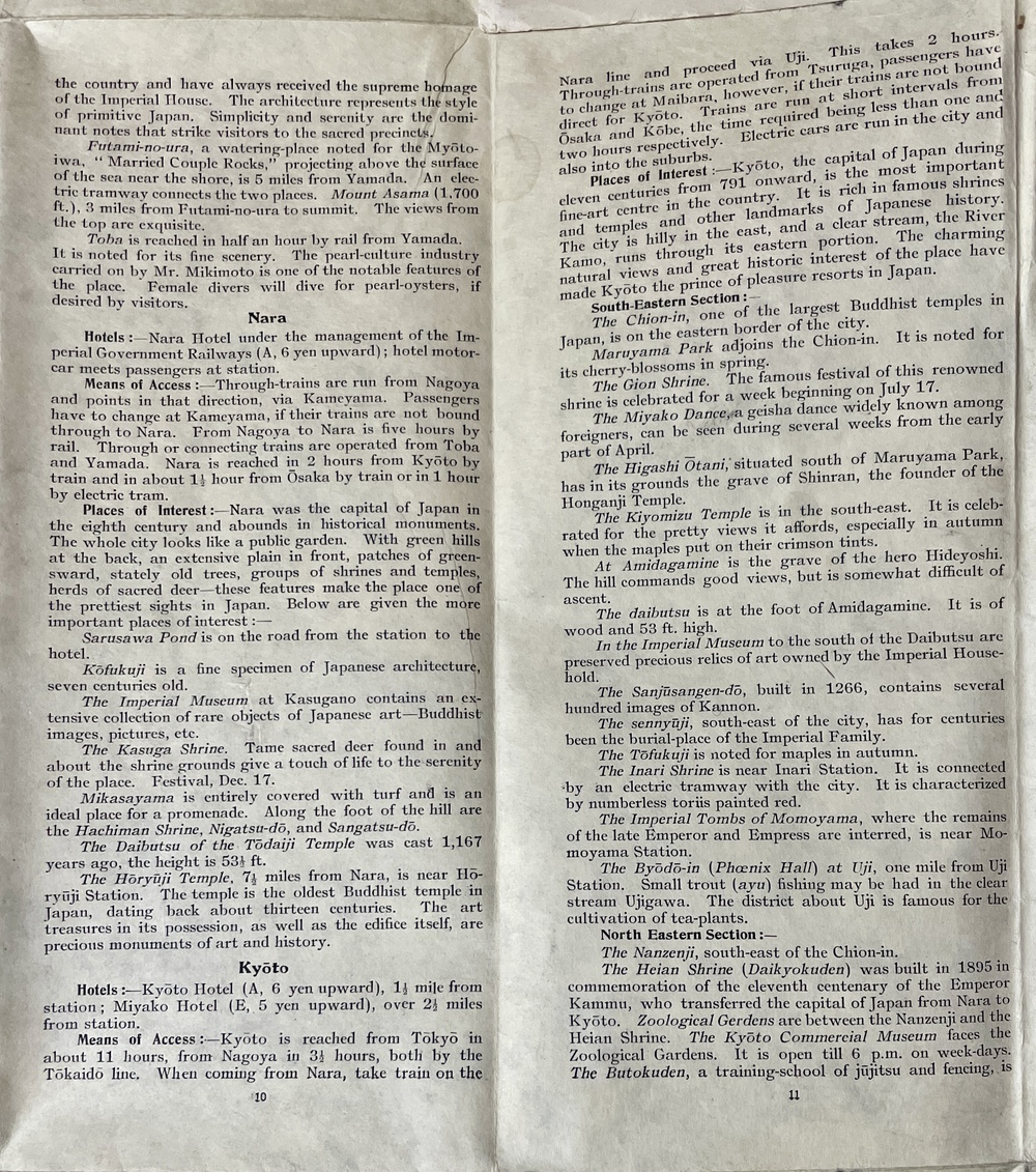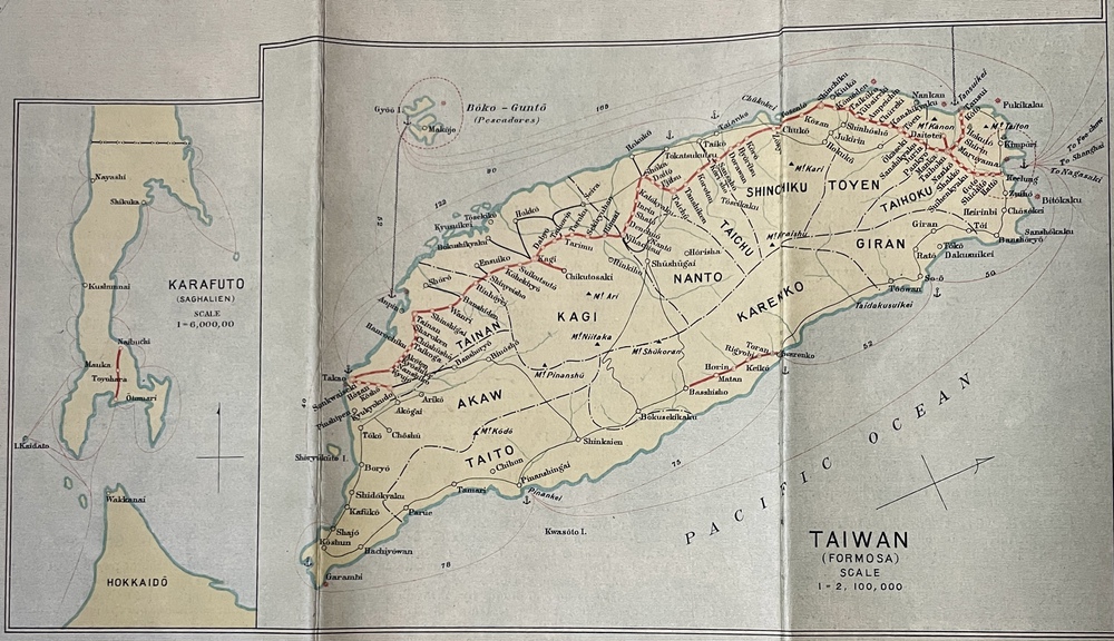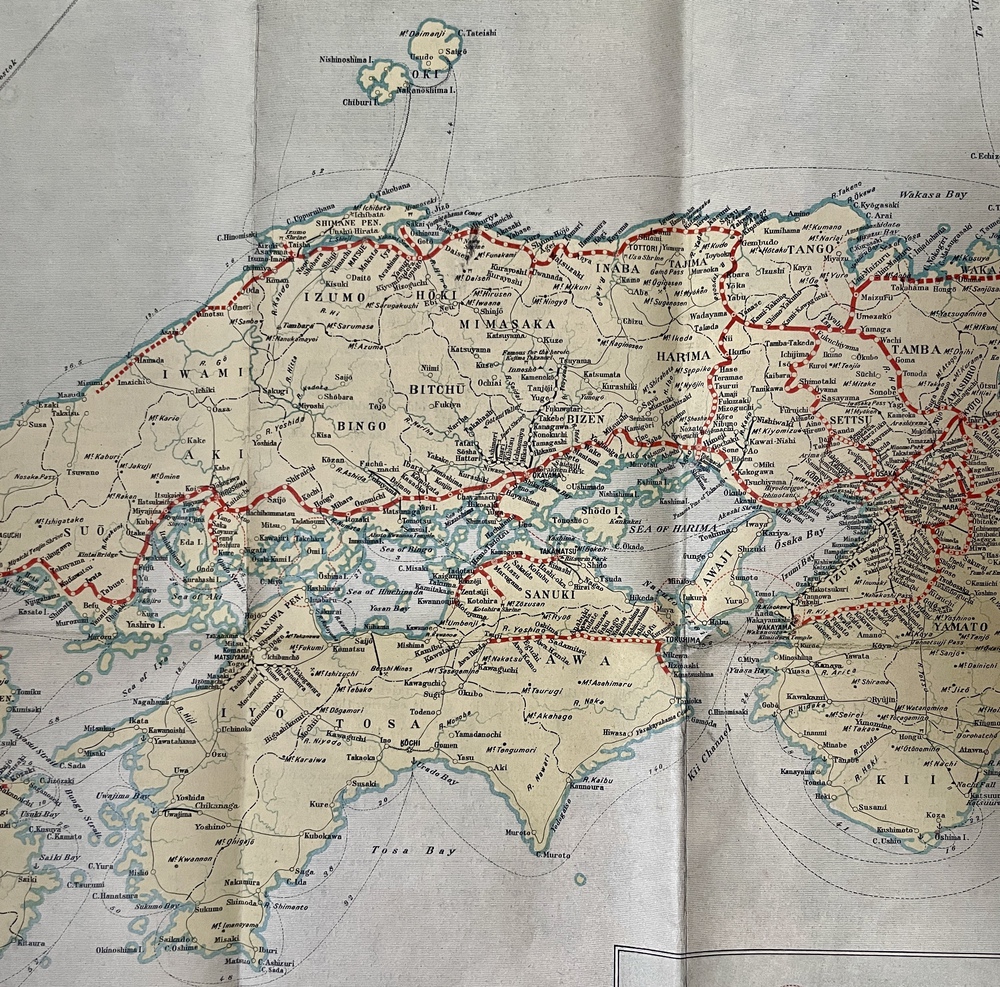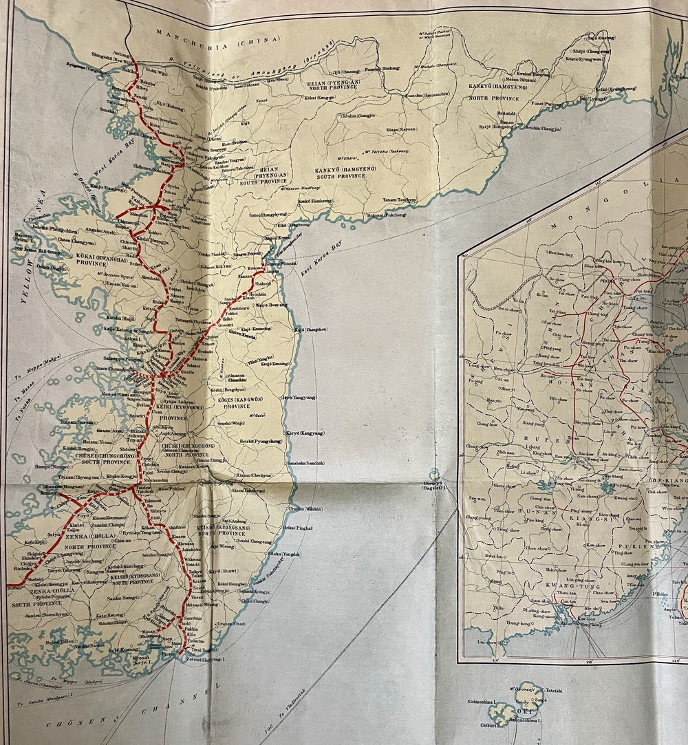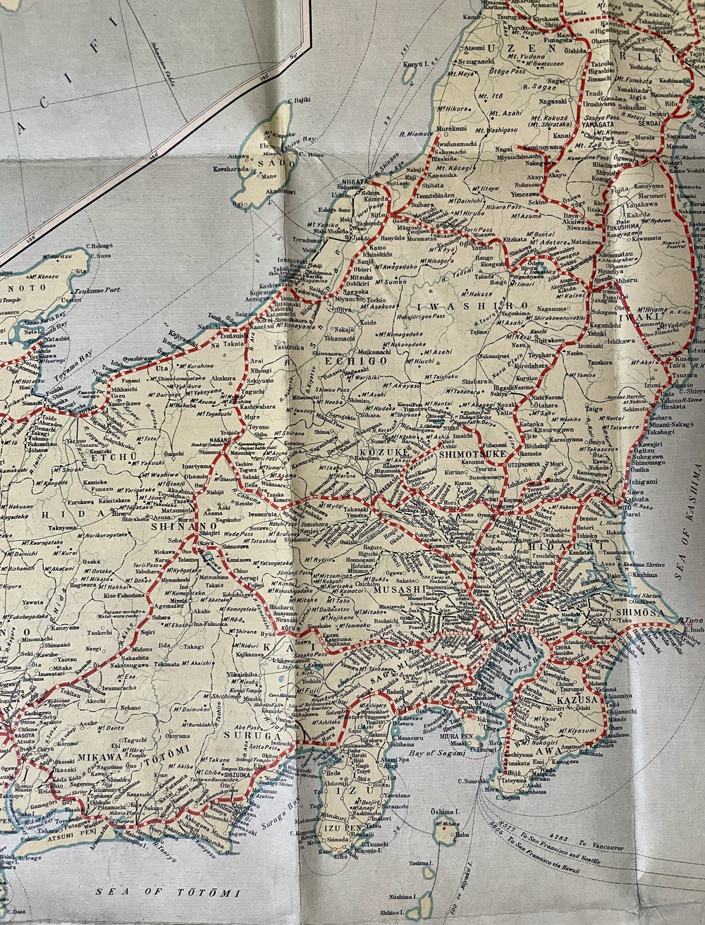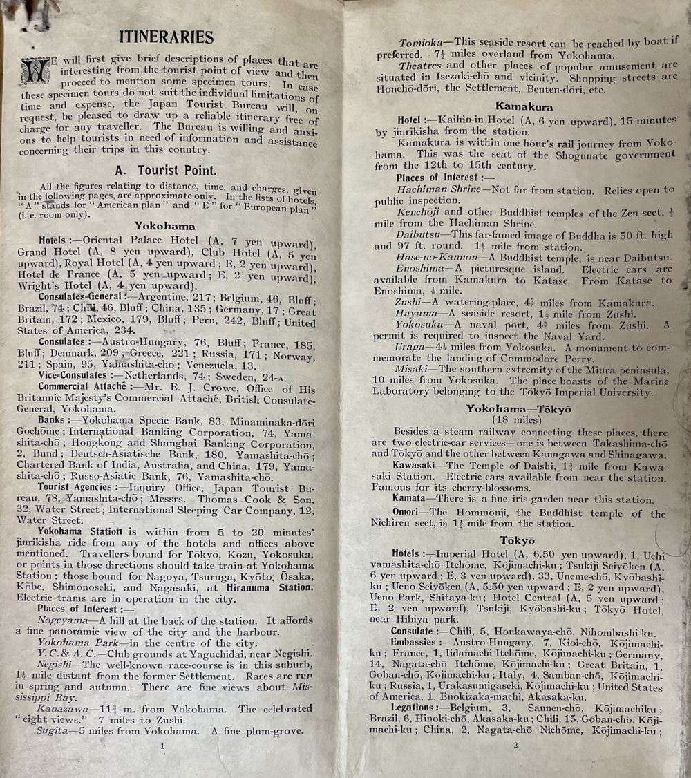 このガイドマップはジャパン・ツーリスト・ビューローが発行、発売していた最初期の「英文日本地図」で1915年5月に発行されたものです。ビューロは、1913年11月に最初の「英文日本案内」(JAPAN)の発行、配布に続いて、最初の販売印刷物として「京都案内」(Map & Guide of Kyoto and Environs)を1915年頃に発行、販売しましたが、「これと前後して」(後掲)発売されたのが「英文日本地図」であるとされています。 「これ(「英文京都案内」の販売を指す:引用者注)と前後して英文日本地図が発売された。これは全国主要遊覧地を網羅し、鉄道は官私線のほか予定線をも挙げ、各遊覧地の交通、旅館、名勝の案内を附したもので杉野敬次郎氏が担当作成された。これが現在ビューローで発売している「英文日本案内地図」の初版である。杉野氏は技術出身で地図の作成には第一人者で、当時世間から模範とされたビューローの案内地図は大抵同氏の手によったものである。」 (山中忠雄(編)『回顧録』ジャパン・ツーリスト・ビューロー、1937年、82、83ページより) このガイドマップはここに記されている特徴と合致する内容で、ビューローによる「英文日本地図」初版に限りなく近いものではないかと思われます。鮮やかな表紙デザインは、その名前こそ明記されていませんが、最初期からビューローによる出版物のデザインを手がけた杉浦非水によるものと思われ、その印刷も最初の「英文日本案内」を手がけた東京印刷が担っています。地図裏面のテキストでは、上掲記述に合致して、外国汽船の発着拠点であった横浜から始まり、鎌倉、東京、日光、松島、北海道、函館、札幌、登別温泉、伊香保温泉、軽井沢、箱根、熱海、富士山とその近郊、静岡、木曽山脈、名古屋、敦賀、山田、奈良、京都、天橋立、有馬、宝塚、大阪、神戸、瀬戸内海、岡山、宮島、下関、別府、耶馬溪、福岡、長崎、熊本、鹿児島、という順で各地の「交通、旅館、名所の案内」が記されています。また、末尾には6週間、4週間、3週間、2週間という4パターンの日本周遊プラン例が掲載されているほか、ここに挙げた日程や予算がうまく当てはまらない旅行者に対してビューローは旅行プランの作成を無償で喜んで請け負う旨が冒頭に記されています。 地図面は「当時世間から模範とされた」と上でも述べられているように、すぐに全体を見渡すことのできる簡潔さを備えながらも旅行者にとって必要な情報がしっかりと盛り込まれており、建設予定も含めた鉄道路線や主要駅、汽船の発着地などがわかりやすくリトグラフ印刷で表現されています。本州、四国、九州を中央に朝鮮半島や大陸部を図郭におさめて描き、上下の別図には、樺太、台湾、北海道、そして汽船航路のつながりを一望できるよう日本と周辺地域全体の図が描かれています。地図右下の余白には「PIRCE 50 SEN MAY 1915」と印字されており、冒頭の「PIRCE」は、正しくは「PRICE」とするべきところを誤ったものと思われます。この50銭という価格は、上述した「英文京都案内」の30銭よりも20銭高い価格設定です。 このガイドマップがビューローによる「英文日本案内地図」の初版であるかどうかを断定するにはさらなる調査が必要ですが、のちに改訂を重ねながら繰り返し発行されることになる「英文日本案内地図」の原型に極めて近い特徴を備えていることは確かであると思われます。後年の「英文日本案内地図」は地図の周囲に写真を配すなど様々な工夫が加えられていきましたが、このガイドマップはその最初期の姿を伝えてくれる貴重な1点であると言えるでしょう。