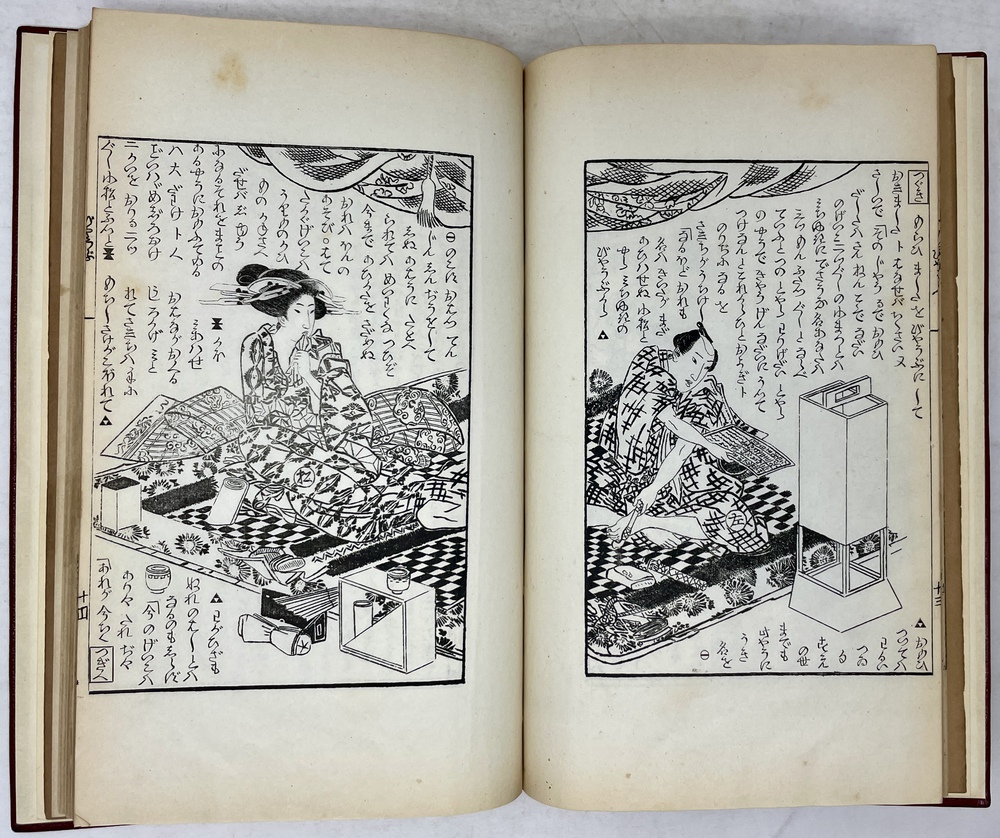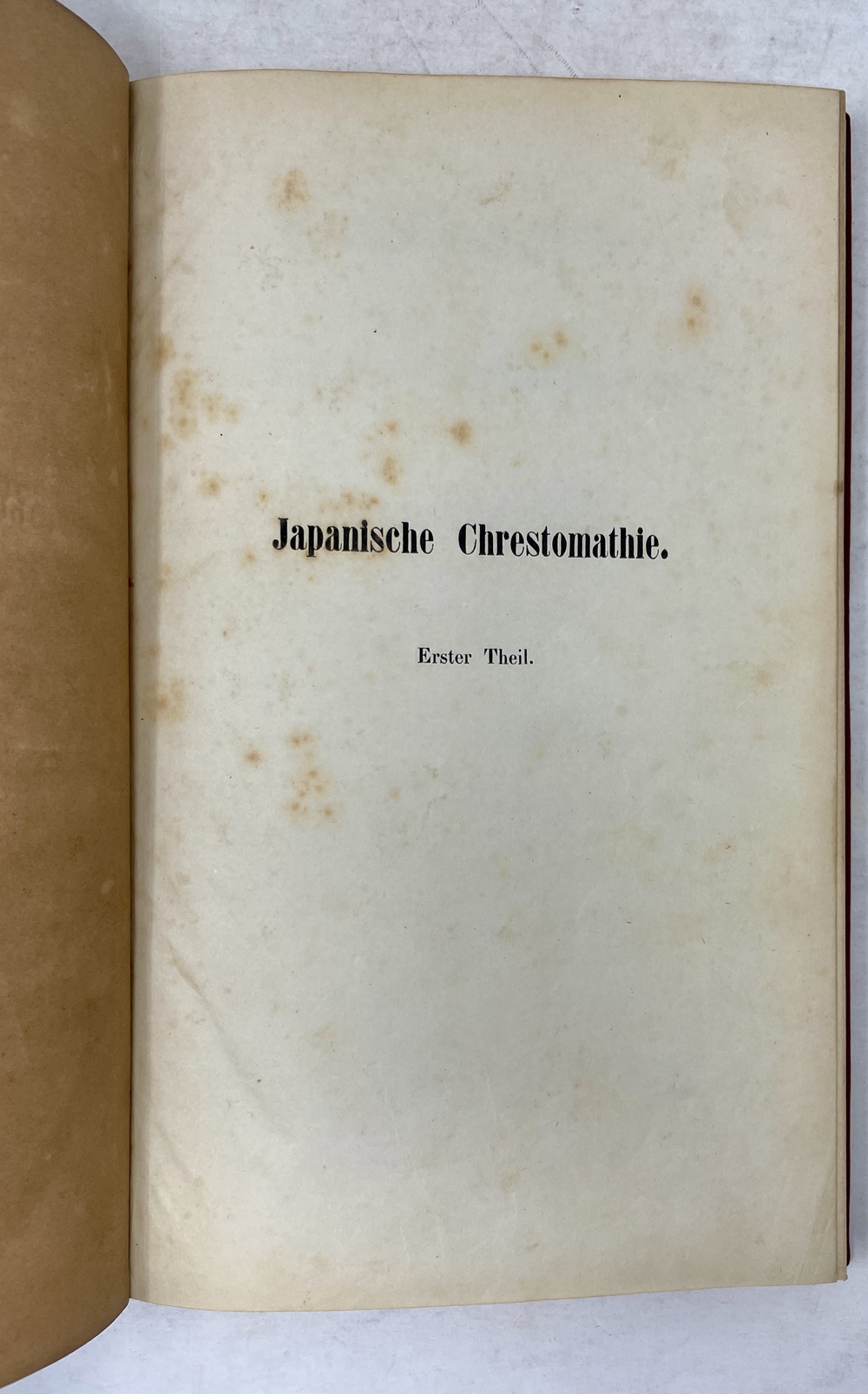 Original brown cover leaf, pp.[I(Half Title.)-III(Title.)-V], VI-XIV, [1], 2-40, 1 leaf(blank), 41 to 20 numbered (in Japanese) leaves, 1 leaf(Title. of 2nd vol.), 19 to 4 numbered (in Japanese) leaves, 3 leaves(introduction and 6 illustrated character,