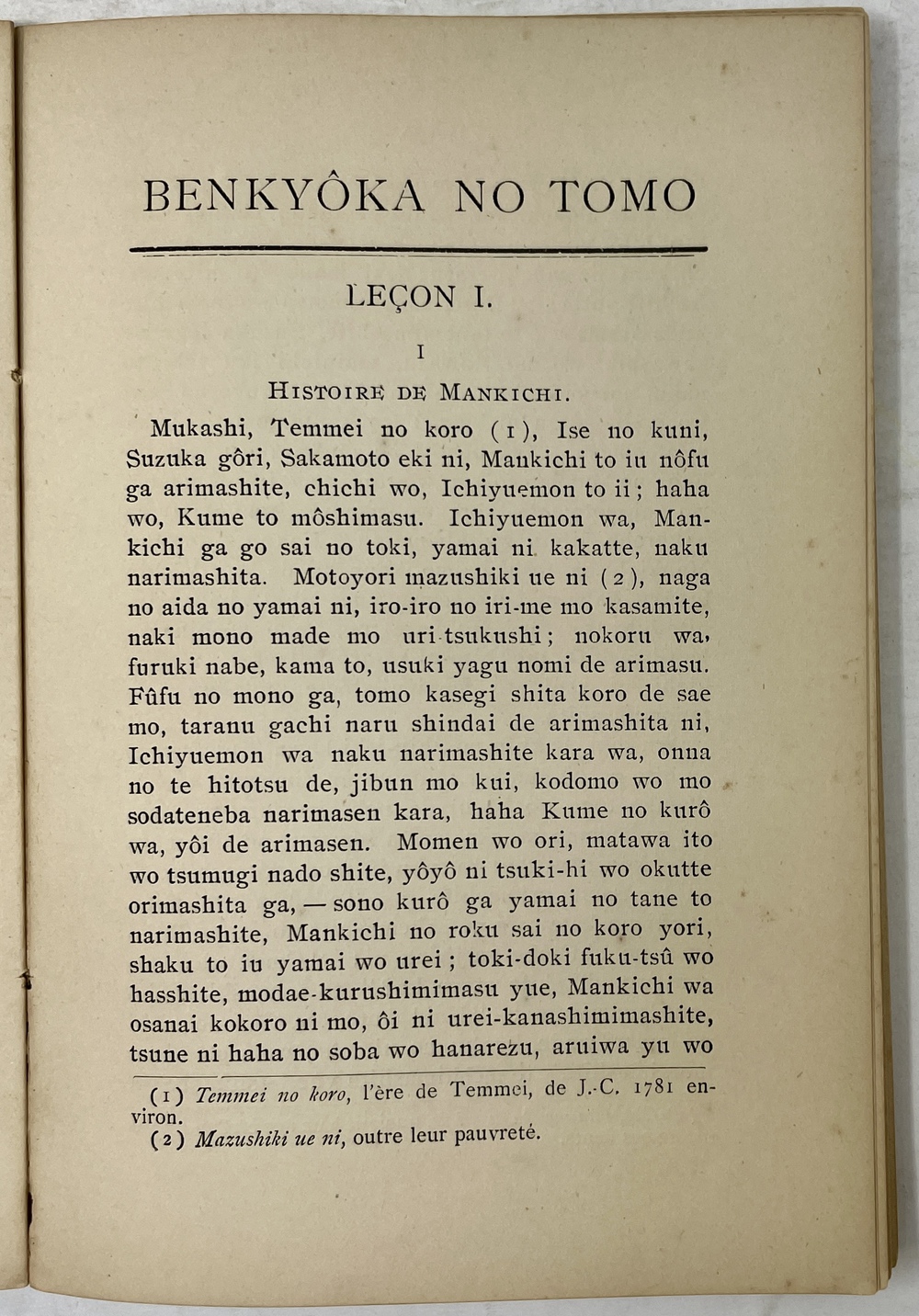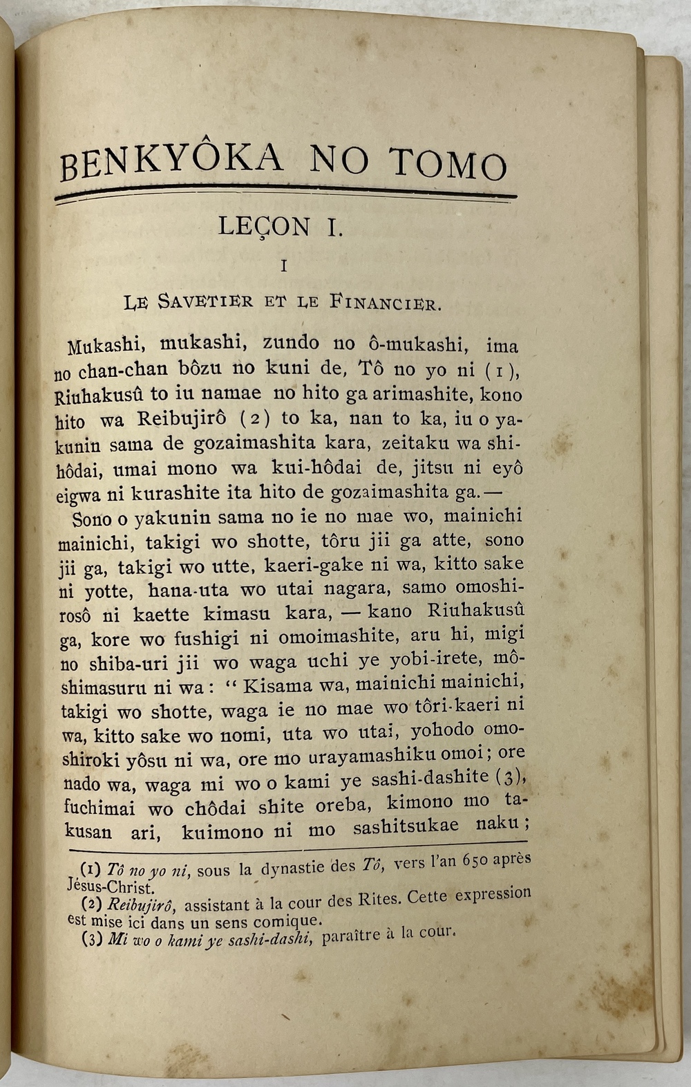BENKYOKA NO TOMO: "VADE-MECUM" DE L'ÉTUDIANT OU COMPILATION DE TEXTES AVEC NOTES EXPLICATIVES POUR SERVIR A LETUDE DE LA LANGUE JAPONAISE PARLEE.
