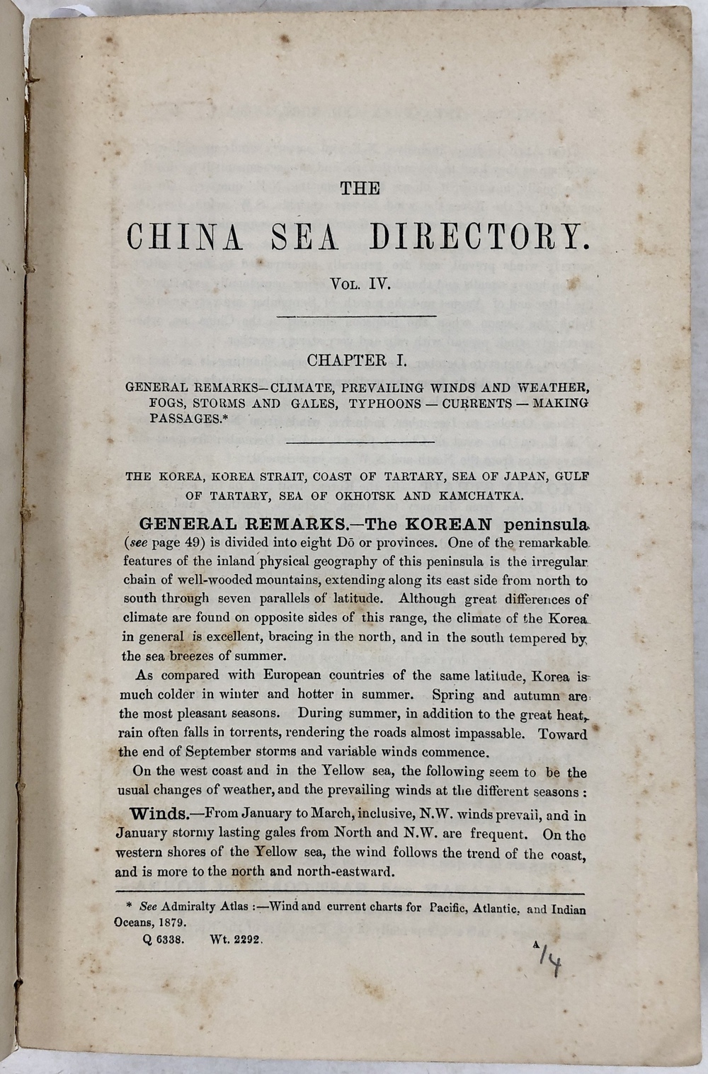 THE CHINA SEA DIRECTORY, VOL. IV. COMPRISING THE COASTS OF KOREA, RUSSIAN TARTARY, THE JAPAN ISLANDS, GULFS OF TARTARY AND AMÙR, AND THE SEA OF OKHOTSK; ALSO THE MEIACO, LIU-KIU, LINSCHOTEN, MARIANA, BONIN, SAGHALIN, AND KURIL ISLANDS.