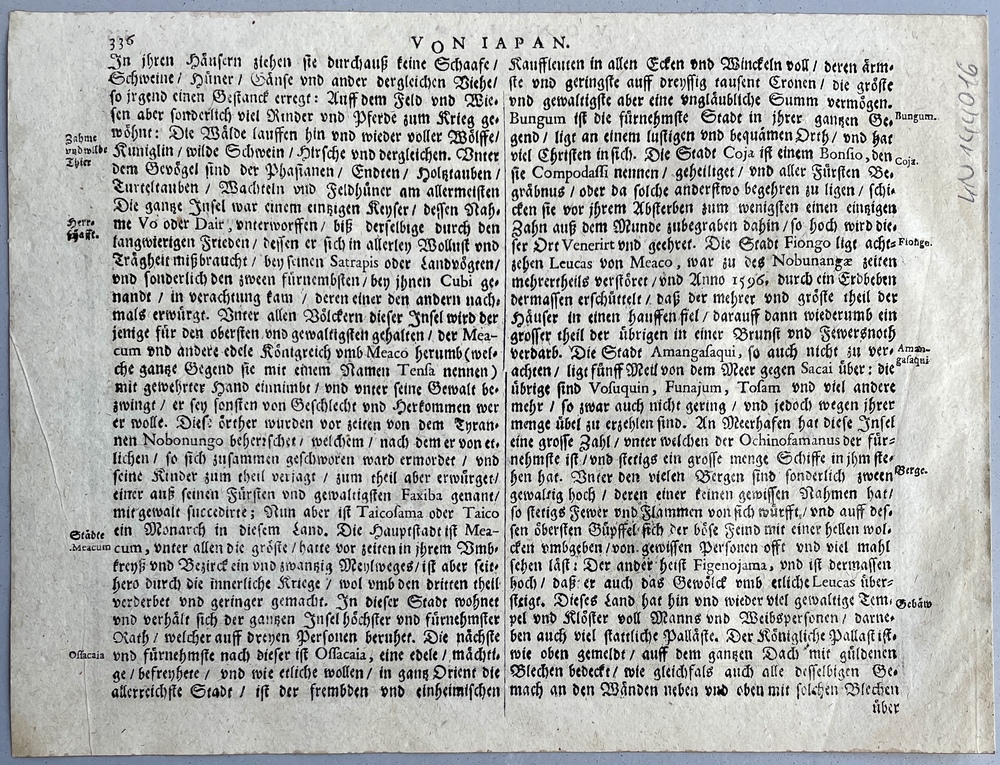 マーブル紙を用いた近年に施されたと思われる簡易装丁。折り込み図版1と2が欠落しているが、他本に見られない4枚目の折り込み図版あり。テキストは完備しており、概ね良好な状態。[NCID: BA34565295] [Landwehr: 372 (frist edition)] [Tiele(1884): 198 (first edition)]