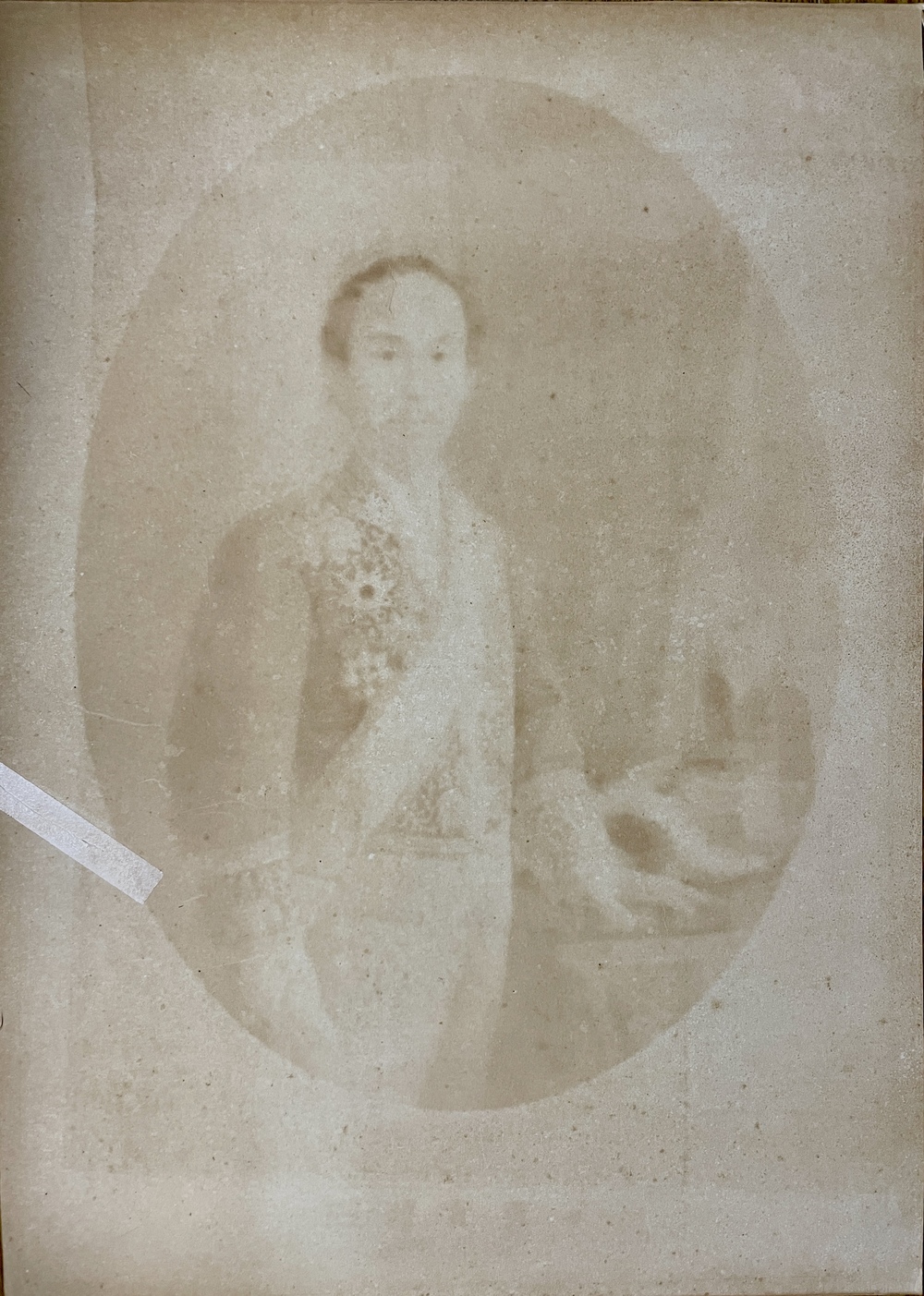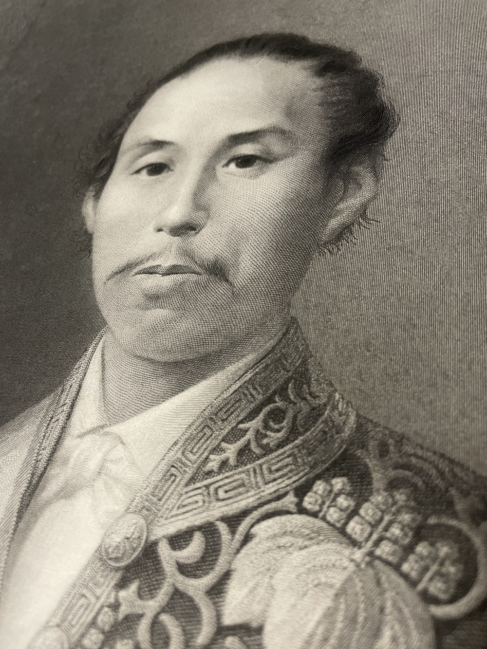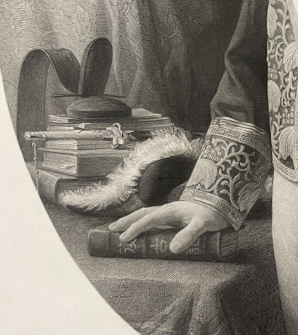 この大きな銅版画作品は、明治の御雇外国人として最大の貢献を成した人物の一人であるイタリア人キヨッソーネ(Edoardo Chiossone, 1833 - 1898)が手掛けたもので、彼を雇い入れていた大蔵省印刷局から1881年に刊行されています。キヨッソーネは高度な近代印刷技術を必要とする紙幣印刷技術の導入と向上のために招聘されたお雇い外国人で、日本の近代紙幣発行において多大な尽力を成した人物として知られています。キヨッソーネは紙幣印刷技術の導入に尽力する傍らで、本作品に見られるような明治政府の主要人物の肖像版画作品も手掛けており、本作品は、1879年に刊行された最初の銅版画作品である「大久保利通像」に続いて製作されたものです。 本作品に見られる当時最新の極めて高度で多彩な銅版画印刷技術は、キヨッソーネが最も得意としていたところで、彼のもたらしたこうした技術が日本の近代紙幣発行に大きな貢献をなしたことは非常によく知られています。すでに多くの研究が明らかにしているように、この作品では異なる銅版画印刷技法が自在に駆使されており、その細部を具に見ることで、彼の技術が当時の世界全体で見ても屈指のものであったことが見て取れる作品となっています。 また、キヨッソーネは印刷技術そのものだけでなく、その人物やモチーフを的確に把握して表現する才にも極めて長けており、この「三条実美」においては、キヨッソーネ自身が三条実美本人と面識があったことも活かされて、その豊かな表情や威厳、そしてテーブルに置かれた書物などのモチーフに至るまで、見事に同氏の特徴を鮮やかに描き出しているとして高く評価されています。 キヨッソーネによる明治政府の人物肖像銅版画作品は、記念品として製作される一方で、一般にも販売されたといわれており、また近年に至るまで何度も増刷が繰り返されたことでも知られています。本作品は、初版刊行に見られる刊行年が明記されている貴重なもので、別掲の「大久保利通像」とともにごく最近になってバルセロナにおいて発見されたというその来歴にも鑑みますと、おそらく初版刊行当時にヨーロッパに贈答品として贈られたものの一つではないかと思われます。 「(前略)キヨッソーネは明治14年(1881)に「太政大臣三条実美公を完成させている。キヨッソーネは三条実美とは面識もあり、その容貌をよく知っていたと見られるが、高貴な人物を長時間モデルとして拘束することができないため、印刷局の直営写真館において、礼服を着用してポーズをとった写真を撮影してもらい、それを元に凹版彫刻を行なったようである。 現存する三条実美の実際の写真は、はっきり言って貧相な容貌で一国の宰相には似つかないものであったが、キヨッソーネは三条実美の容貌を的確に捉えて、全体の印象を変えることなく、威厳を持った理知的で、貴族らしい温和な表情に彫刻している。目鼻などは柔らかい感じを出すために点線により彫刻しており、衣装の礼服は大久保利通の例と同様に、メゾチント、ビュラン直刻、腐食凹版など各種の技法を駆使している。また背景の小道具も、右手に『復古記』のタイトルが見え、明治の王政復古を象徴しており、さらにその背景には宮廷人のシンボルであった日本古来の剣や冠を描いており、それが西洋式のサーベルを付け、洋式の帽子と礼服、さらに勲章やリボンを着用した文明開花の代表とも言える近代的なスタイルに変化した様子を象徴的に描いている。この作品も一般に販売されたものであり、テーブルの左下部分に「Chiossone Tokio 1880」の銘が印刷されている。」 (植村峻「大蔵省印刷局におけるキヨッソーネの業績」明治美術学会 / (財)印刷局朝陽会(編)『お雇い外国人キヨッソーネ研究』中央公論美術出版、1999年所収、61-63ページより) 「(前略)キヨッソーネは大蔵省紙幣寮にあって、おもに紙幣印刷のための原版制作につとめた。周知のとおり、紙幣印刷にあっては、腐食銅版(エッチング)ではなく、直刻銅版(エングレーヴィング)によって、微細な紋様をほりこむか、あるいはメゾチントのような細密技法が望ましかった。キヨッソーネは、直刻ばかりかのちには電胎法などの新規の技法をも開発にむかった。 直刻法は、江戸時代この方、日本には存在しなかった。明治初年における銅版画は、その頂点としての玄々堂二台目の松田緑山にあってもエッチングであり、紙幣印刷には好適とはいいがたい。むろん、日本には江戸期以来、すでに藩札という根強い伝統が存在した。けれども、この藩札は和紙に木版で印刷する様式であり、近代貨幣社会における直刻銅版印刷に代替できるわけではない。こうして、キヨッソーネによって導入された紙幣印刷術は、紙幣寮において独占的に適用されて、日本の通貨制度をささえることになる。 一般に、日本の近代社会にあっては、金・銀や銅による通貨とならび、もしくはそれ以上に、発券銀行による安定した発行に信頼をよせるこ