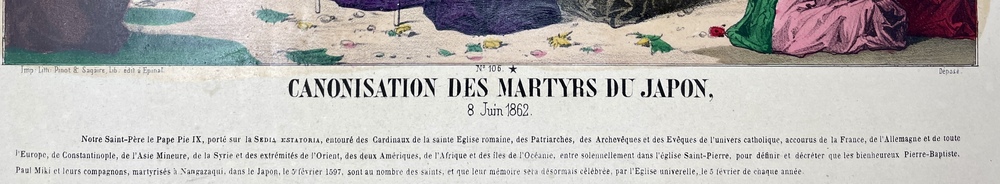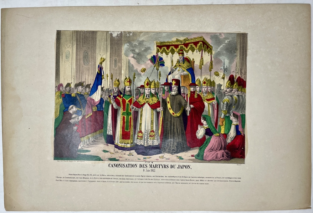 美しい手彩色が施されたこの石版画作品は、1862年6月8日にローマのサン・ピエトロ大聖堂において行われたいわゆる「日本二十六聖人」の列聖式の様子を描いたものです。この事件を主題とした芸術作品は銅版画や油彩画をはじめとして事件直後から数多く生み出されていますが、本図のように列聖式そのものの様子を描いた図はそれほど多くなく、一部の絵入週刊誌などの特集記事における挿絵以外にはほとんど知られていないことから、本図は非常にユニークで貴重な作品ではないかと思われます。 1597年2月15日に長崎の西坂の丘の上の刑場で26人のキリスト教信者が処刑されたいわゆる「日本二十六聖人殉教事件」は、豊臣秀吉による大規模なキリスト教迫害事件として、当時在日していた宣教師ルイス・フロイス(Luís Fróis, 1532 - 1597)による報告によって、当時からヨーロッパで広く知られ、また衝撃を与えました。事件から30年後の1627年に、殉教者26人は福者としてウルヴァノ8世によって列福されたことで、この事件はその後もヨーロッパで長く記憶されることになり、様々な出版物が生み出されています。 その後、1858年に江戸幕府が西洋諸国との通商条約を結び、再び外交関係が開かれるようになった1862年、26人は時の教皇ピウス9世によって、聖人として列聖されることになり、この事件に対する再注目と出版物の増加を呼びました。開国後の日本には数多くの宣教師が再来日を試みており、カソリック、プロテスタント双方からの活動が活発化していきますが、再びヨーロッパ諸国に開かれた日本におけるかつて殉教事件が再注目されたのは、こうしたことも背景にあったのではないかと思われます。日本の殉教者の列聖は当時のヨーロッパで大きな反響を呼んだようで、関連する書籍が各国語で相当数に上る数が出版されています。こうした作品の多くは、事件の場面を(想像で)描いた挿絵を収録していることが多く、銅版画や石版画を用いた数多くの視覚作品が生み出されることによって、より多くの一般の人々に事件のことが伝えられることになりました。 本図もこうした1862年の列聖を大きな契機として作成数多くの視覚芸術作品の一つに数えられるものですが、事件そのものではなく列聖式の場面を描いているという点で非常にユニークな作品で、図の下部にはフランス語のテキストが添えられており、世界各国各地から参集した使節や協会関係者たちに囲まれる中をピウス9世と枢機卿らが歩みを進めている場面を描いていることを説明しています。1862年6月8日にローマのサン・ピエトロ聖堂において盛大に執り行われた列聖式については、公式報告書(ACTA SACRORVM SOLEMNIVM QVIBVS SANCTISSIMVS DOMINVS NOSTER PIVS PAPA IX. XXVI MARTYRIBVS IAPONENSIBVS. Rome, 1864)をはじめとして、多くの刊行著作で紹介されていますが、本図のように列聖式の場面を描いた図版は非常に珍しく、当時欧米各国で流行していた絵入週刊誌の記事内における挿絵を除いては、ほとんど知られていないのではないかと思われます。 本図は縦約30センチ、横約45センチという石版画としても大型の作品で、タイトル上部に「106番」(No106)とあることから、何らかのシリーズ作品の一つだったのではないかと思われます。その大きさに鑑みると書物の中に綴じ込まれるものではなく、独立した一連の版画作品であったと考えることができそうです。いずれにしても、これまでの「二十六聖人殉教事件」に関する研究や展示などでもほとんど紹介されたことがないと思われる、大変貴重で重要な彩色石版画作品と言えるでしょう。 「1861年12月23日、教皇ピオ9世は1597年の長崎の殉教者のうち、フランシスコ会関係の23名の列聖を許可する旨宣告し、翌年3月25日、イエズス会の3人の殉教者に対しても同様の宣言が行われた。次いで同年6月8日、26殉教者の列聖式がサン・ピエトロ大聖堂において挙行された。列聖式の模様は当時の出版物によって知りうるが、大聖堂内部は殉教のエピソードを描いた多数の絵で飾られていたという。日本のカトリックの歴史を通じて初めて聖人に列せられたこれら26殉教者に対する崇敬はこの機会に再びにわかに高まり、1852年だけでもローマ・ブレダ・パリ・リール・ルツェルン・マドリード・ヴァレンシア・マインツ・トゥールーズ・ダブリンなどで17種以上の書物が刊行された。」 (越宏一「美術における日本26殉教者:その作品カタログ」『国立西洋美術館年報』第8巻、1975年所収論文、21ページより)