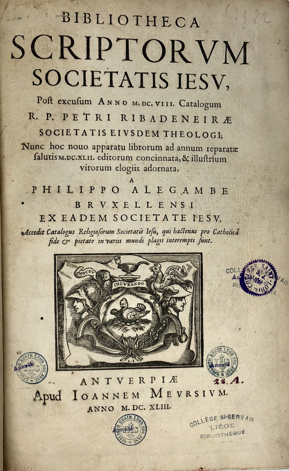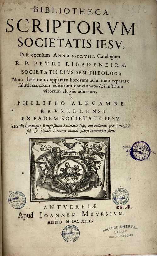 BIBLIOTHECA SCRIPTORVM SOCIETATIS IESV, Post excusum ANNO M.DC.VIII Catalogum R.P. PETRI RIBADENEIRAE SOCIETATIS EIVSDEM THEOLOGI;...