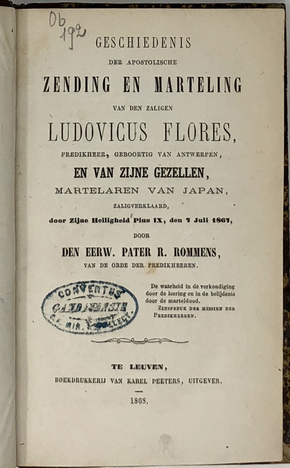 GESCHIEDENIS DER APOSTOLISCHE ZENDING EN MARTELING VANDEN ZAILIGEN LUDOVICUS FLORES,...
