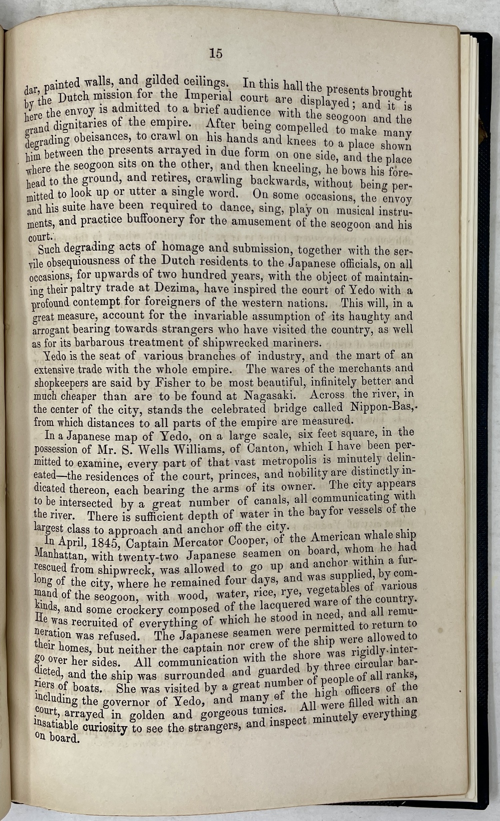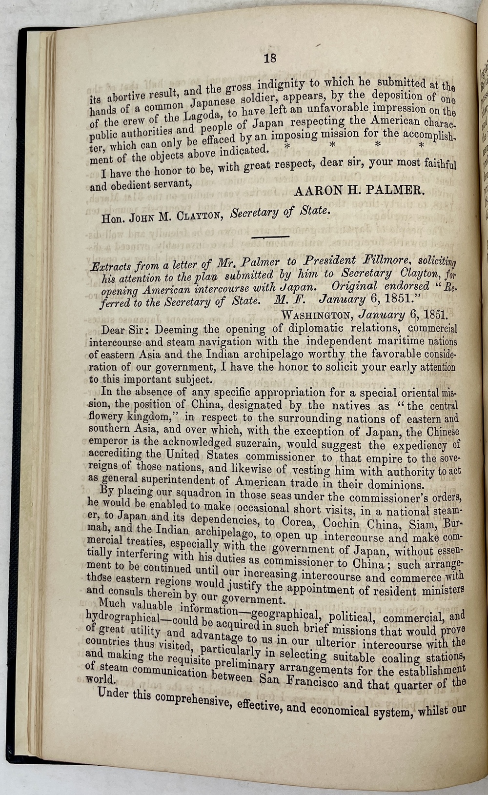 本書は、ペリー(Matthew Carlbarith Perry, 1794 -1858)による日本遠征隊の実現に向けて活躍したロビイストであったパーマー(Aaron Haight Palmer, 1785? - ?)によって1855年に刊行された作品で、日本遠征隊を成功に導くにあたって自身が多大な貢献を成したことを証明するために、1840年代半ばから実際に提出していた各種報告書、書簡、提言書などをまとめたものです。日本遠征隊の成功における功労者として、何らかの恩賞を得ることを目的として刊行された作品ですが、パーマーの活動全体がまとめられた内容となっていて、結果的にアメリカの対日交渉史研究に資するところ極めて大きい重要な書物となっています。