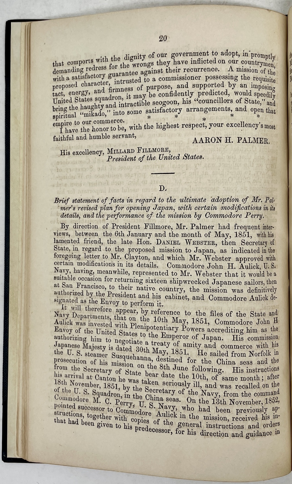 C) の後半に収録されているもう一つの記事は、1851年1月付でフィルモア大統領(当時、Millard Fillmore, 1800 - 1874))に宛ててパーマが送った書簡で、「日本開国計画改訂版」を踏まえつつ、アメリカによる中国沿岸への艦隊派遣によって中国のみならず、その近郊のアジア諸国との通商交渉も進められ、サンフランシスコと東アジアとを結ぶ太平洋航路を開くことで大きな貿易利益を得らることを改めて強調し、日本との条約交渉のための艦隊派遣をいち早く実現すべきことを説く内容となっています。また、これに続くD) (pp.20-21)は、先に見た「日本開国計画改訂版」が実際にどのように活用されたかをまとめたもので、フィルモア大統領や彼の主任顧問とも言える存在であったダニエル・ウェブスター(Daniel Webster, 1782 - 1852)、当初日本派遣団の指揮を命じられていたオーリック(John H. Aulick, ? - 1873)、そしてとりわけペリーその人によってパーマの「日本開国計画改訂版」が大いに参照されただけでなく、1849年から1852年にかけてパーマーとペリーが何度も日本遠征に関する会談の機会を設けていたことが報告されていて、日本遠征の成功にパーマーが大きく貢献したことが改めて強調されています。