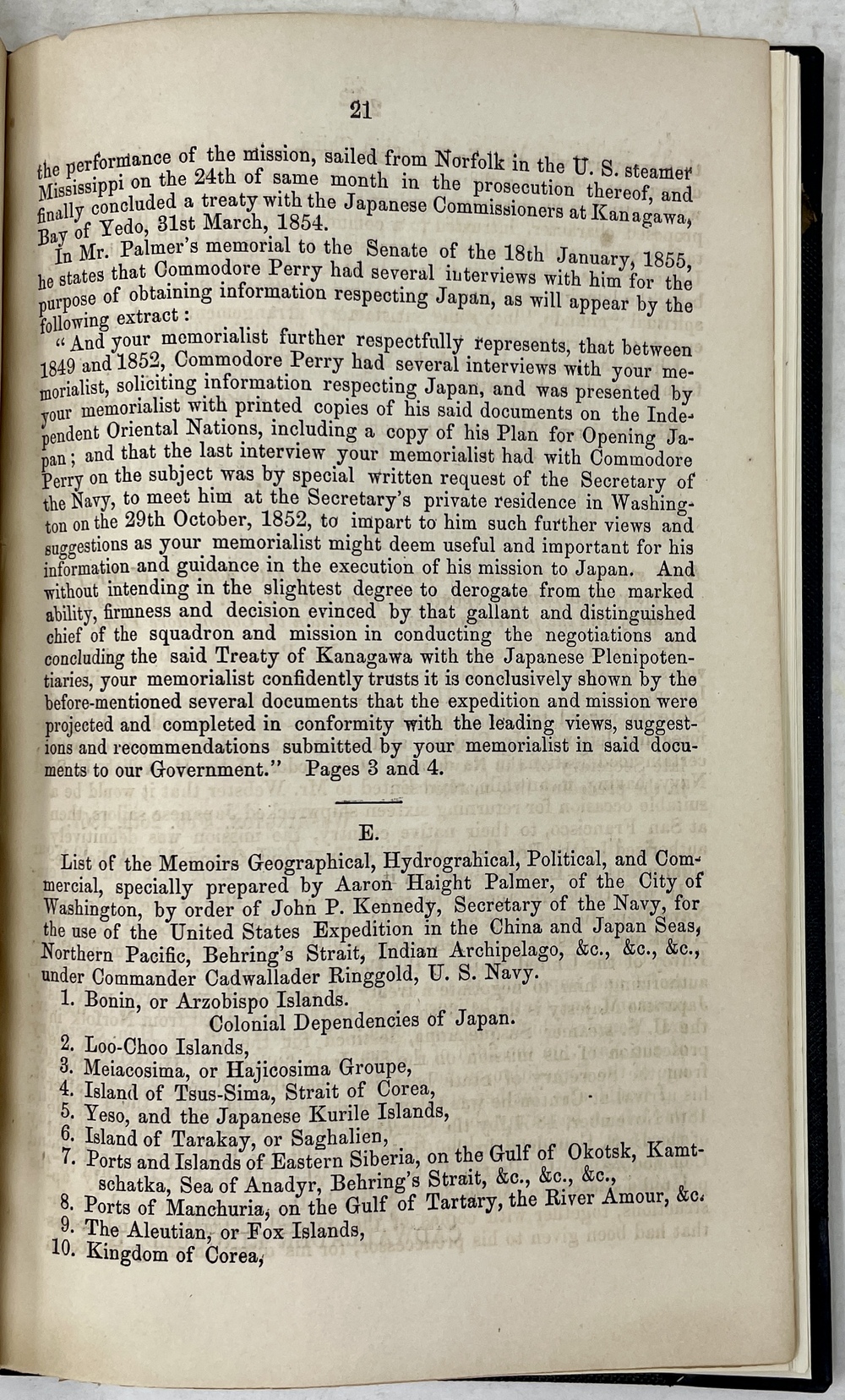 E) List of certain Memoirs, &c., prepared in 1853 by Mr. Palmer by order of the Hon. John P. Kennedy, Secretary of the Navy, for the use of the projected United States Exploring Expedition to Behring’s Strait, &c., under Commander Cadwallader Ringgold, U. S. Navy.