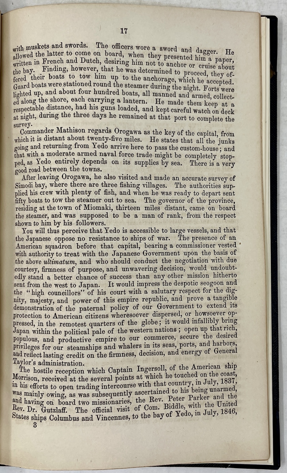 本書はその存在については早くから知られていたものと思われ、何度か複製版の刊行がなされていますが、その一方で原著は発行部数が著しく限られていたのか極めて稀少となっていて、店主の知る限りでは国内研究機関には1点も所蔵されていないように見受けられます。「日本開国」を巡る第一級史料でありながら、その原著が国内に1点も所蔵されていないというのは不可解としか言いようがありませんが、いずれにせよ本書は極めて貴重な1冊と言えるでしょう。