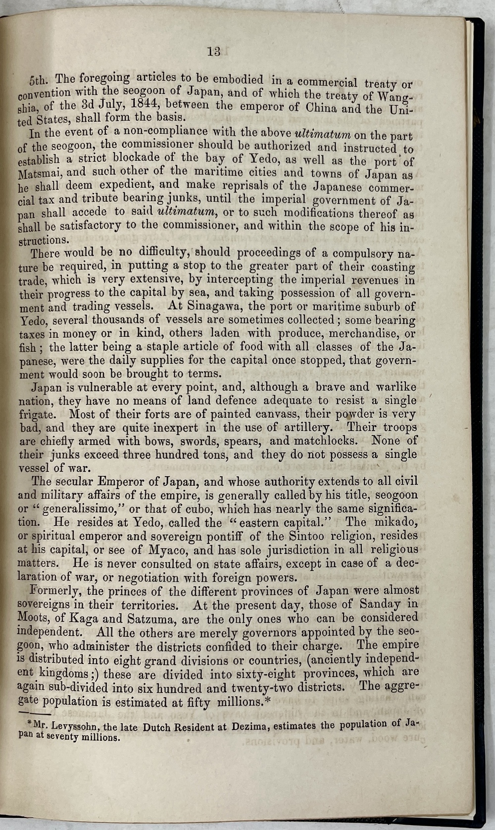 C) の後半(pp.10-)は、特に重要と思われる興味深いパーマーによる2つの提言(書簡)の全文が掲載されています。最初のものは「日本開国計画改訂版」(Revised Plan for opening Japan)と題されたもので、上で見た1849年4月にクレイトン国務長官に提出した報告書の中に含まれていた日本開国計画を、その後に入手した最新情報を反映させてさらに完全なものにするために急いで改訂したもので、1849年9月17日付でクレイトン国務長官に提出されました。この計画書では、日本沿岸に漂着したアメリカ水夫の非人道的扱いに対する補償と再発防止、沿岸での必要物資の補給や、松前や琉球に補給拠点を設立し、それ以外にも通商のための開港を認めることを「最後通牒」(ultimatum)として要求することが提言されています。ここでは、日本は戦闘的な民族ではあるものの、たった1隻のフリゲート艦に対してさえも防御できない脆弱な軍事力しかなく、たとえば江戸近郊の品川をアメリカの艦隊によって封鎖すれば首都への必要物資の供給を停止させることができ(交渉を有利に進められ)るとまで述べており、かなり強硬な主張が展開されているように見受けられます。また、日本との交渉を進めるに際して重要となる日本の統治構造についての解説も含まれていて、世俗の皇帝(secular emperor)である「将軍」(seogoon)は、日本の東部の首都である江戸(Yedo)に在住し、あらゆる政治的な権限を有していること、その一方で「京都」(Myaco)に住む精神的な皇帝(spiritual emperor)である「帝」(mikado)は、基本的に政治に関与しないが、宣戦布告と外国勢力との交渉(in case of a declaration of war, or negotiation with foreign powers)に関してだけは例外であるとして、以下幕府の統治システムなどの解説がなされています。また、江戸に入るための航路や水路情報、日本の防御体制についてもアメリカや他国からの最新情報を踏まえてかなり詳しく報告されており、その結論として、かなり大型の艦隊であっても江戸湾に侵入することは十分可能で、日本の海軍力は問題にならず、首都の眼前に艦隊を迫らせ、「揺るぎない決意」(unwavering decision)を持って交渉に臨めば、アメリカによる日本遠征派遣団は、過去の西洋諸国によるあらゆる試みよりも大きな成功を収める機会を得られるであろうとしています。