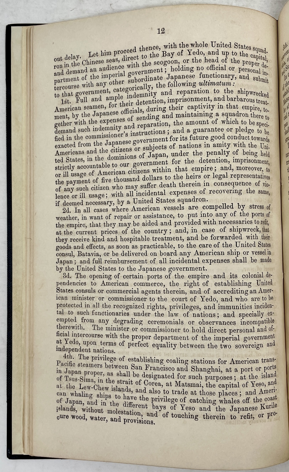 さらに、太平洋を介して中国にいたる航路を開設することを求め、そのために、ロシアと外交交渉をおこなって、アリューシャン列島やカムチャッカなど、北太平洋海域のロシア領にアメリカ船が入港できるようにすべきだと述べている。また、清朝とも交渉し、アムール川近辺でも貿易がおこなえるようになれば、日本や朝鮮へ通商を求める足がかりにもなることを示唆している。(中略)