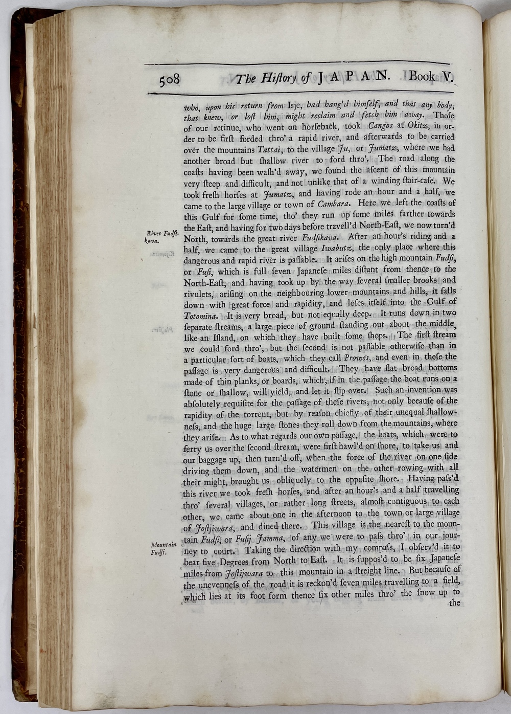 また、江戸参府道中で簡易測量を行っていたケンペル自身の測量データやスケッチに基づいて製作された、道中近隣地域の地図も多数収録されており、「富士山」に代表されるような特筆すべき自然についてもこれらの地図には描き込まれています。本書で描かれた富士山の姿は、江戸参府に際して富士山を実見したケンペルによる詳細で印象的な記述とともに、多くの西洋人読者に大きな影響を与えました。