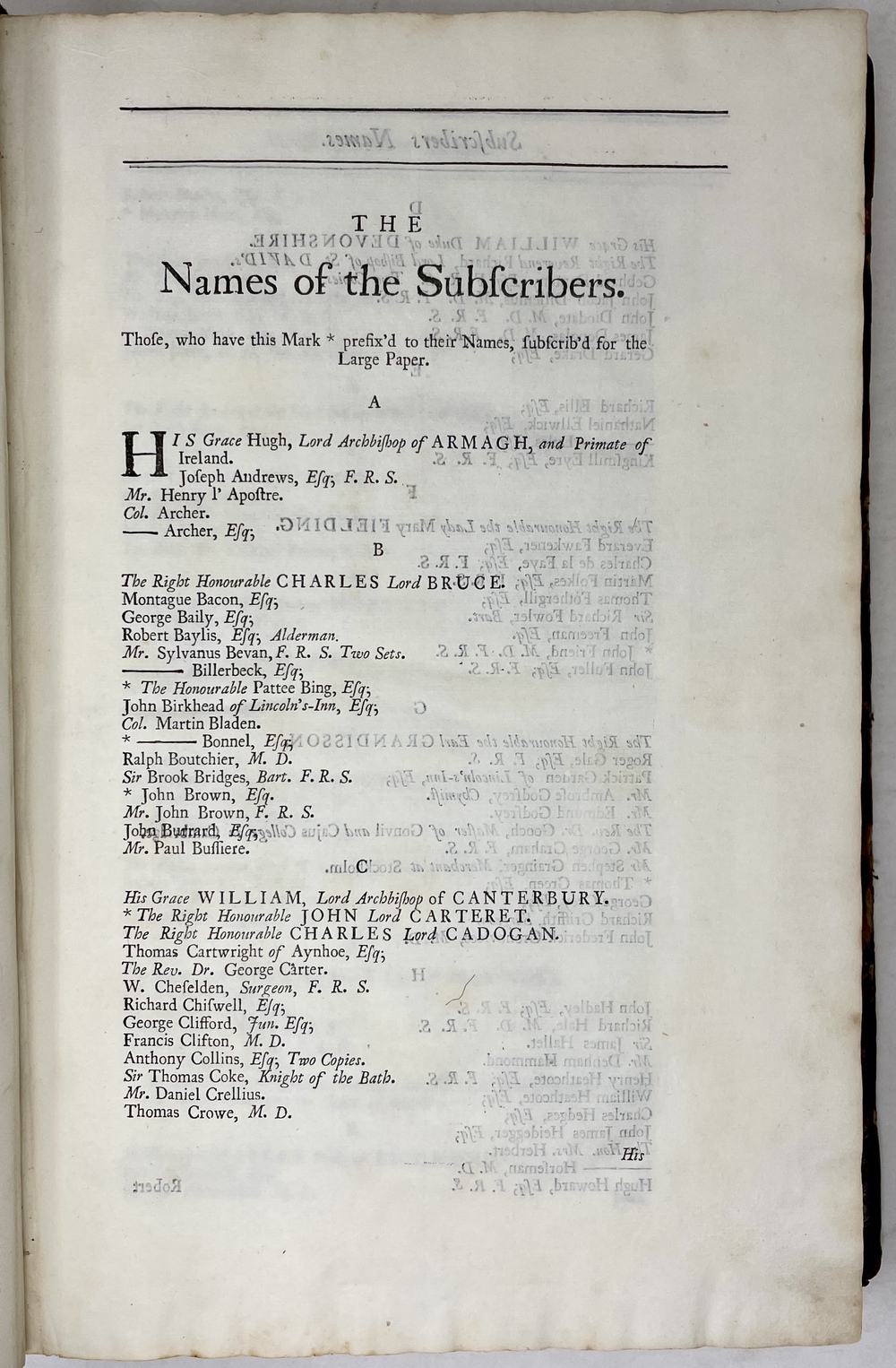 ラテン語のタイトルページは1727年の刊年表記で英語のタイトルページは1728年の刊年表記がなされている。通常はフォリオ判2巻本だが、極小部数のみ余白部分が極端に大きい通称「Large Paper Edition」が極小部数のみ刊行された(http://www.aobane.com/books/71)。