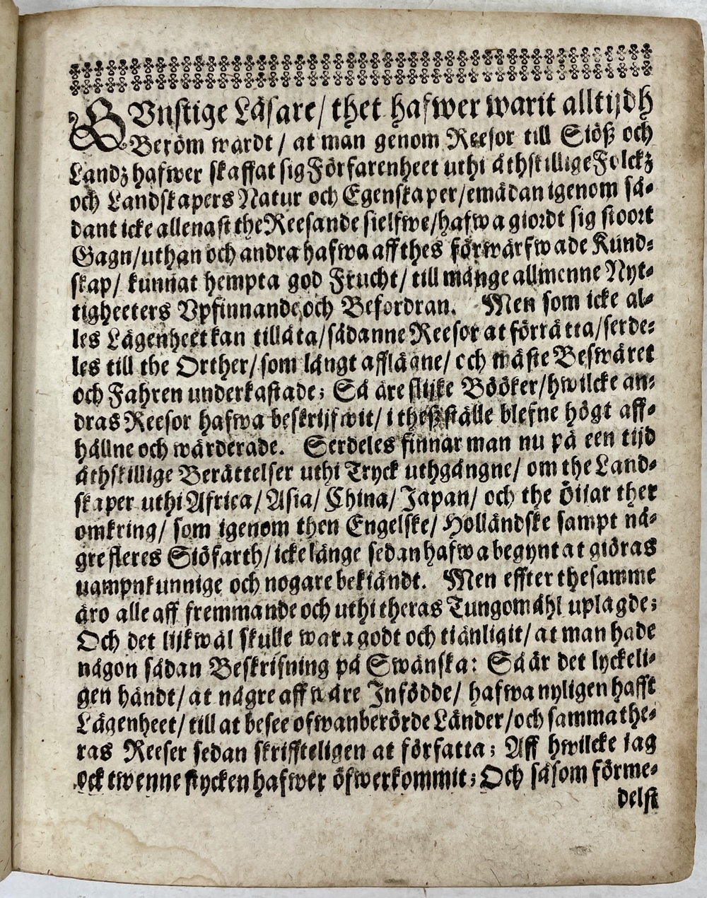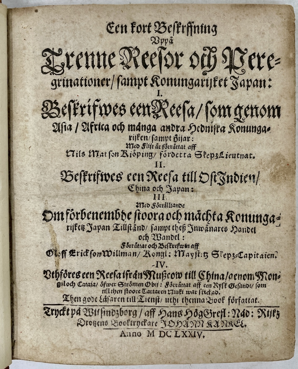 Een kort Beskrffning uppå trenne Reesor och Peregrinationer / sampt Konungarijket Japan: ... II. Beskrifwes een reesa till Ost Indien / China och Japan: III. Med fortålliande om forbenembde stoora och måchta Konungarijketz Japan tillstånd...