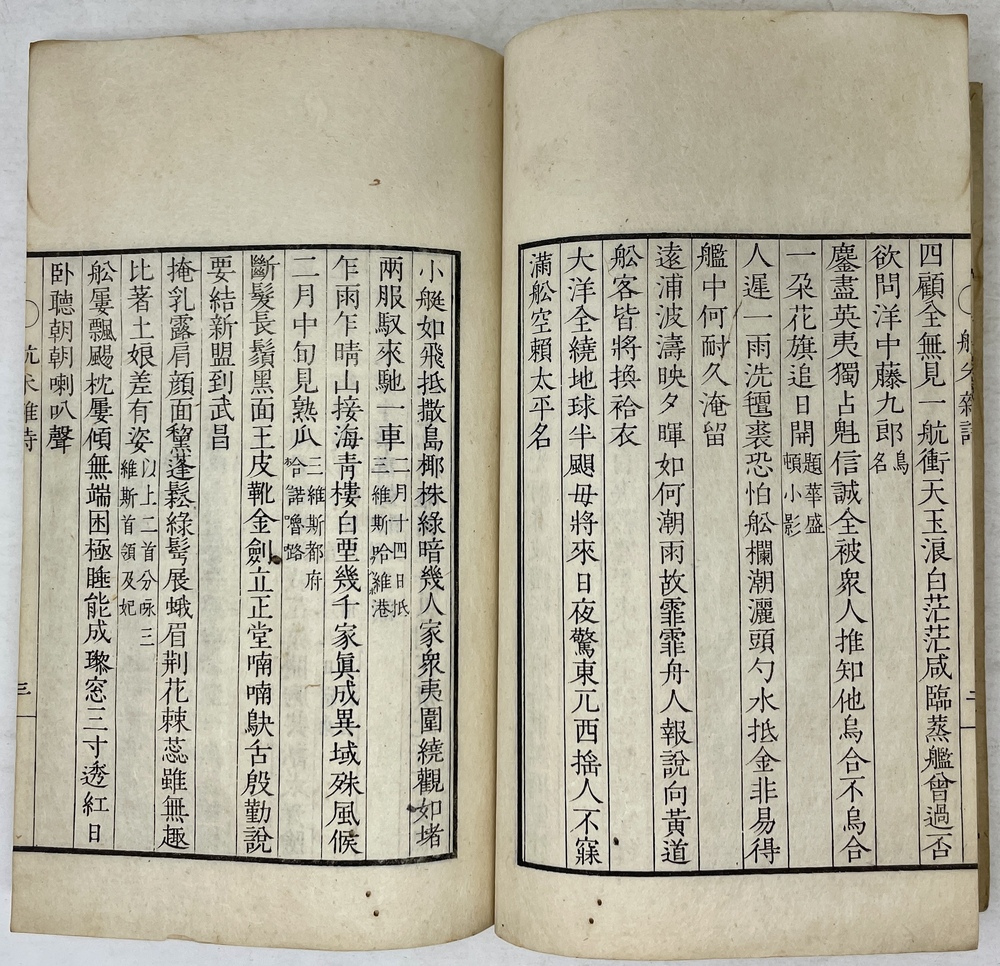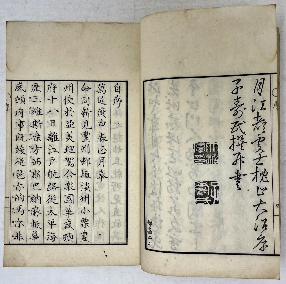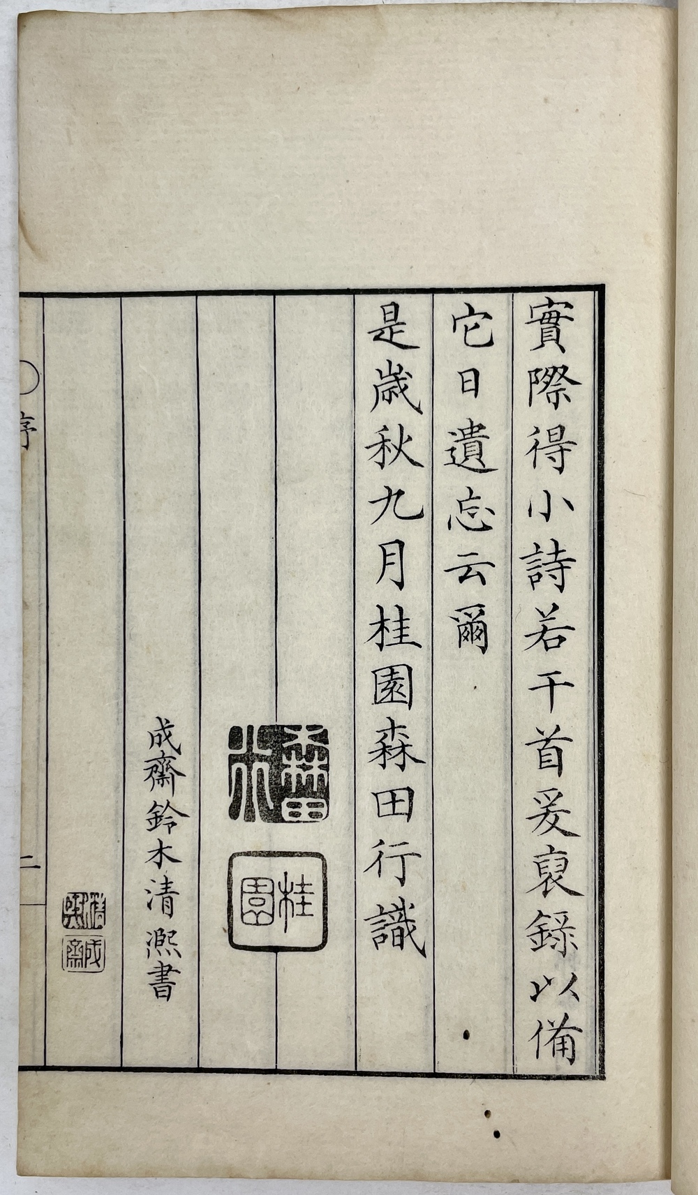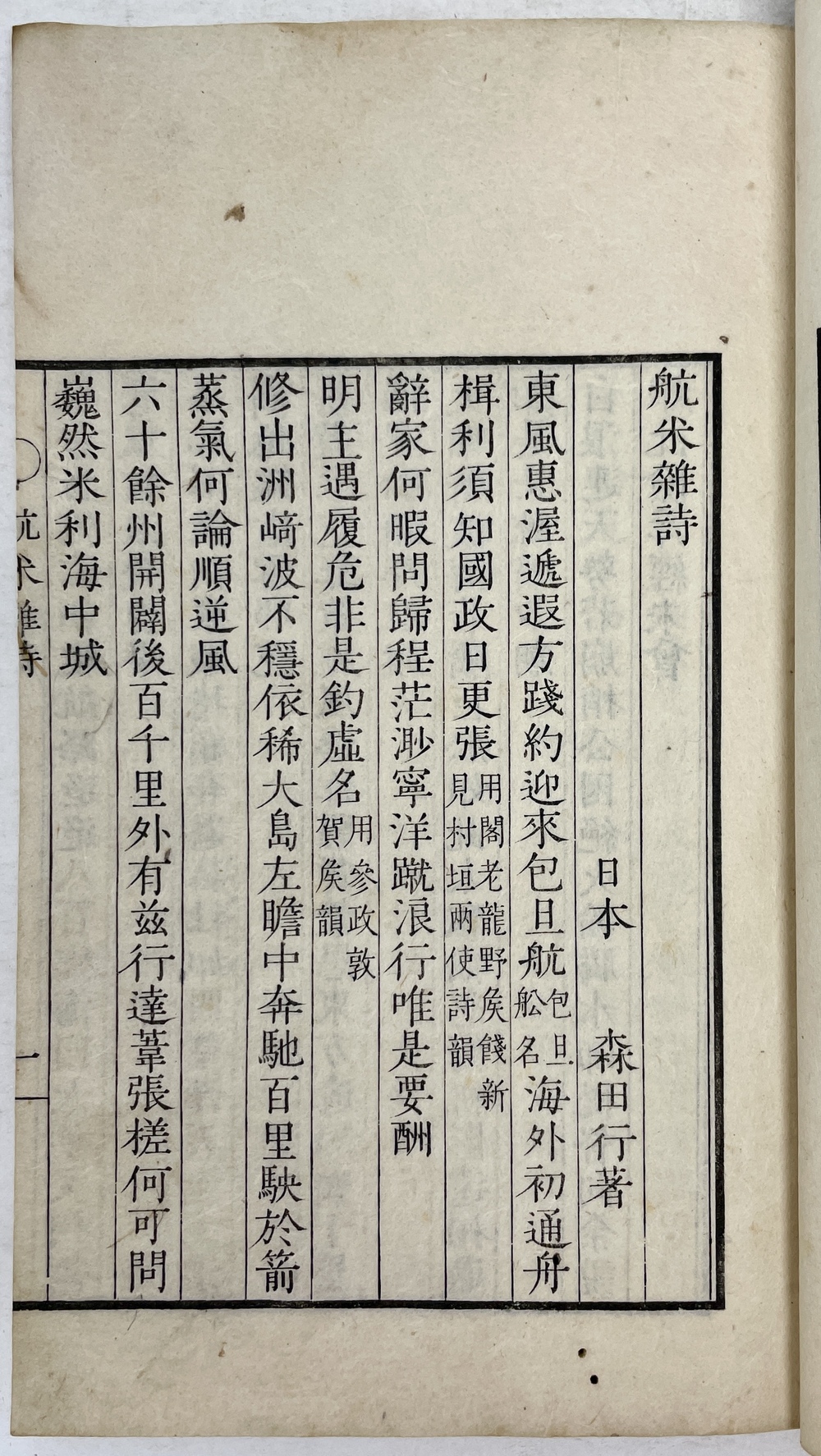 ただいま解題準備中です。今しばらくお待ちくださいませ。 「江戸幕府が初めて欧米世界に派遣した使節である万延元年の遣米使節は、安政5年(1858)に締結した日米修好通商条約の批准書を米国ワシントンで交換するのを第一の目的とし、併せて米国の諸事情を視察・調査するものであった。正使として外国奉行兼神奈川奉行の新見豊前守正興、副使として同じく外国奉行兼箱館奉行・神奈川奉行の村垣淡路守乃範正が任ぜられ、目付として小栗豊後守忠順が同行、これら三使を含めて一行17名がアメリカ海軍のポーハタン号に乗ってアメリカへ向かった。軍艦奉行木村喜毅(芥舟)・艦長勝麟太郎(海舟)が乗り組み、日本の船として初めて太平洋横断に成功した咸臨丸は、この時の随行鑑である。福沢諭吉も木村喜毅の従者としてこの咸臨丸に乗り組んでいた。 幕府勘定組頭の職にあった森田清行(号を桂園)は使節の会計方を務めていた。使節の中では三使に次ぐ地位にあり、年齢的にも49歳ということもあって、森田は一行における裏方の要として大きな役割を果たした。正使新見正興には、『亜行詠』という紀行歌文集が残されているが、その中には(中略)、行き届いた気配りを見せた森田に対する感謝の言葉が記されている。篤実な森田は、使節の随員として『亜行日記』『亜米利加航海出入簿』などの数種な貴重な記録も残している。 しかし、森田は役人として有能なだけの人物ではなかった。森田は勘定組頭に就く以前に、学問所教授方出役や学問所勤番を勤めたこともあり、また妻は幕府の御儒者で漢詩人として知られた友野霞舟の娘であったことからも分かるように、漢詩文の素養を十分に備える知識人でもあった。この森田桂園の使節随員としての紀行漢詩集が『航米雑詩』である。桂園はアメリカから帰国した翌年の文久元年、不運にも50歳で病没するが、遺言にしたがって息子が草稿を整理し、関係者に序跋を依頼して、その年のうちに出版されている。 板本『航米雑詩』には百首の詩が収められ、帰国直後に書かれた桂園の自序も付されている(後略)」 (揖斐高「幕末の欧米見聞詩集:『航米雑詩』と『環海詩誌』」『江戸文学』第32号、ペリカン社、2005年所収論文、178-179ページより)