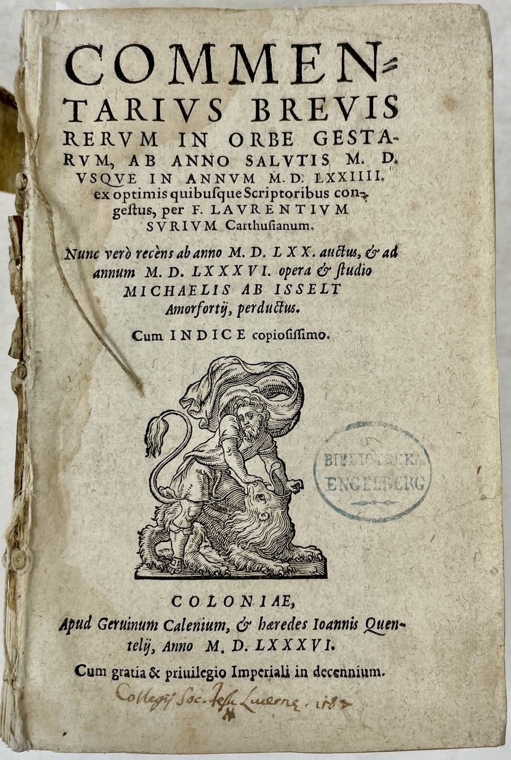 COMMENTARIVS BREVIS RERVM IN ORBE GESTARVM, AB ANNO SALVTIS M. D. VSQVE IN ANNVM M.D. LXXIIII….Nunc verò recèns ab anno M.D. LXXX auctus, & ad annum M.D. LXXXVI. Opera & Studio…Cum INDICE copiosissimo.