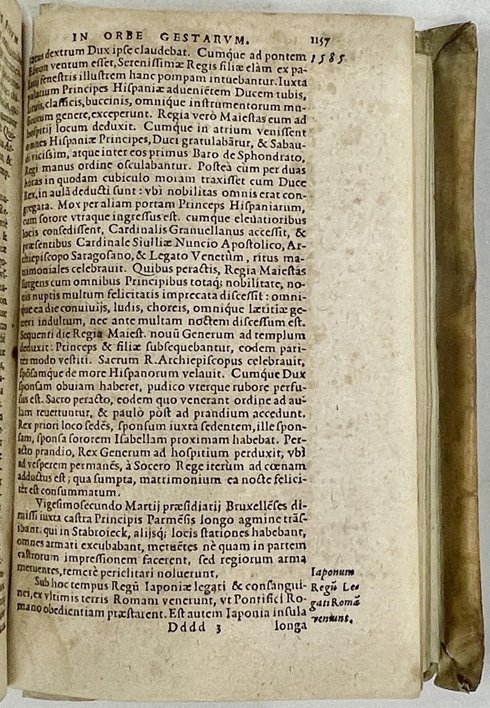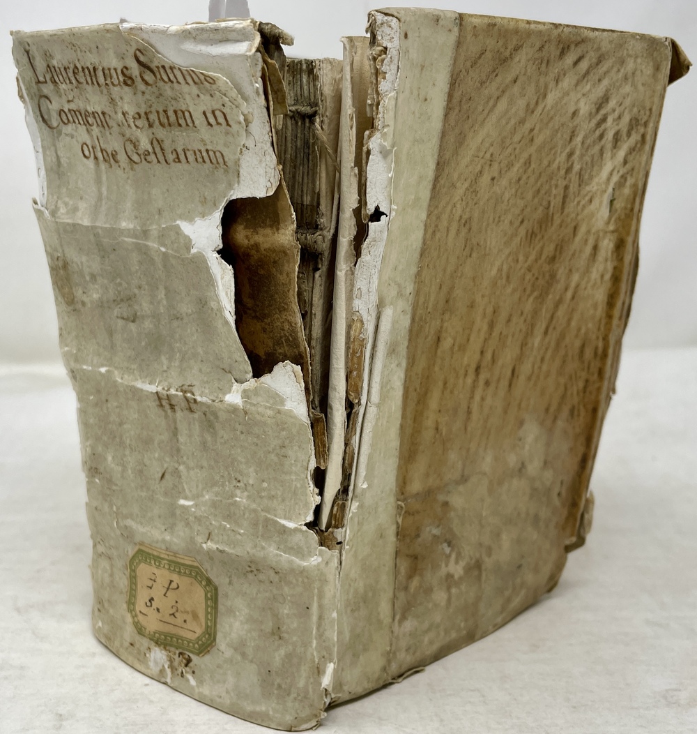 ヴェラムの原装丁に補修がなされており、背表紙と表表紙が完全に外れているが、本文自体は良好な状態。旧蔵機関による押印あり。