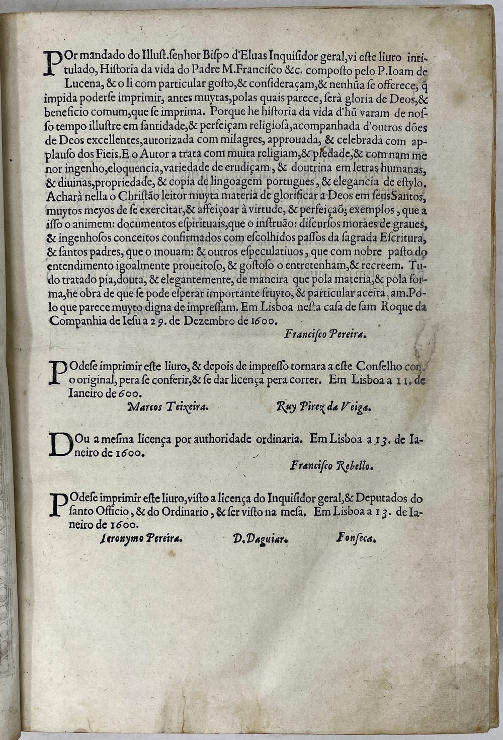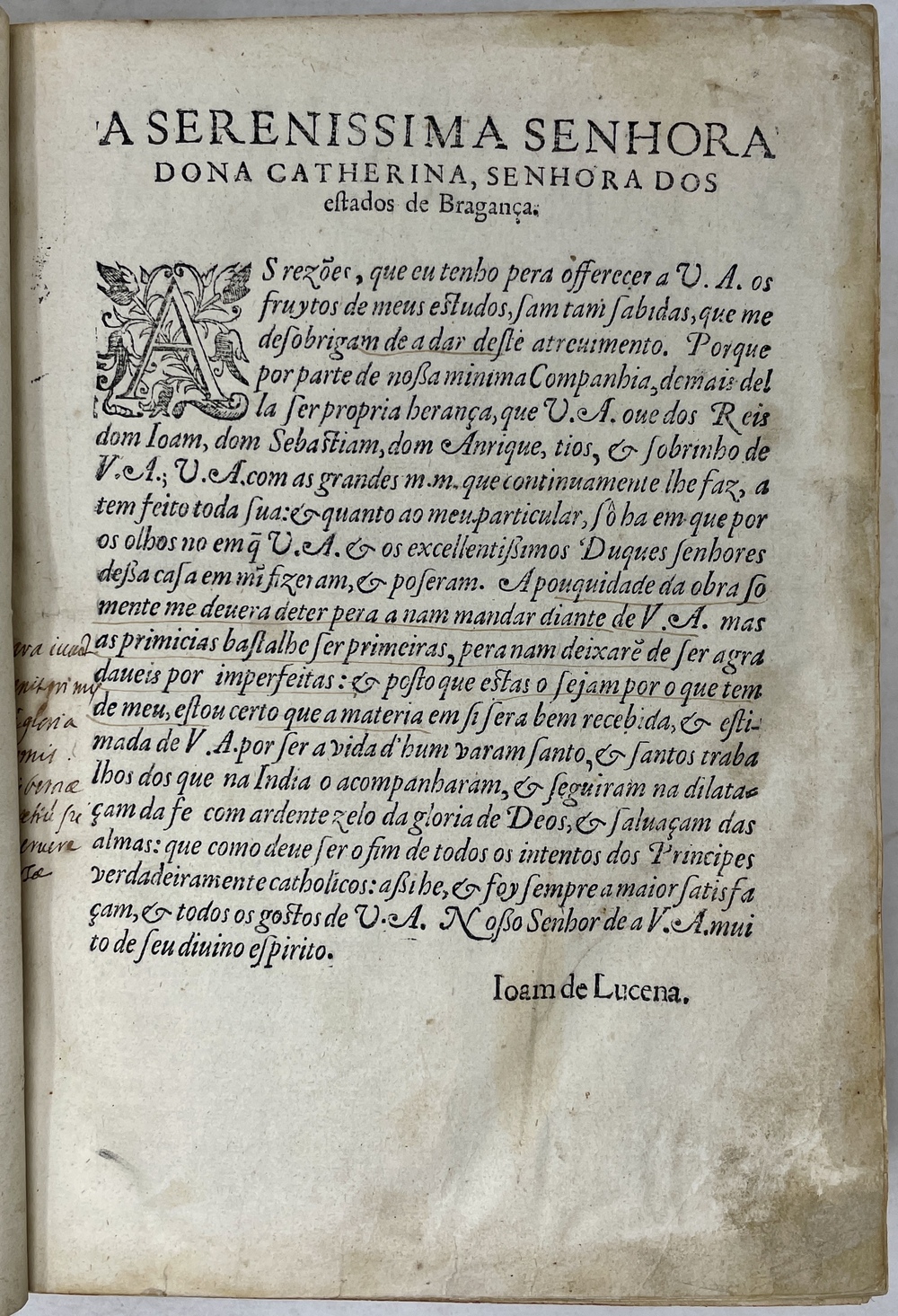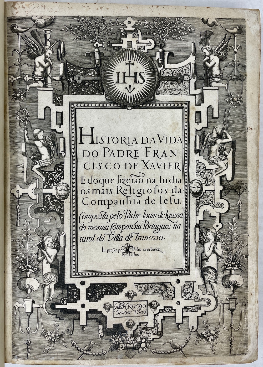 本書は、1619年にスペインのセビーリャで刊行されたフランシスコ・ザビエルの伝記です。ポルトガル人のイエズス会士であるルセナ(Joan de Lucena, ? - 1600)によって著された非常に貴重なポルトガル語原著版で、のちに刊行されたスペイン語、イタリア語など複数の翻訳版の底本となった作品です。本書は、ザビエルの伝記の名著として名高いトルセリーニ(Orazio Torsellino / Horatius Torsellinus, 1545 - 1599)による作品(De vita B. Francisci Xaverii,...Roma, 1594)と並んで、17世紀初めに刊行されたザビエルの古典的名著として高く評価されています。本書には、ザビエルによる日本宣教だけでなく、当時の日本の状況、特に鹿児島や山口、京都といったザビエルが実際に訪ね歩いた各地の状況も詳しく記されており、日本関係欧文資料としても大変重要な書物です。