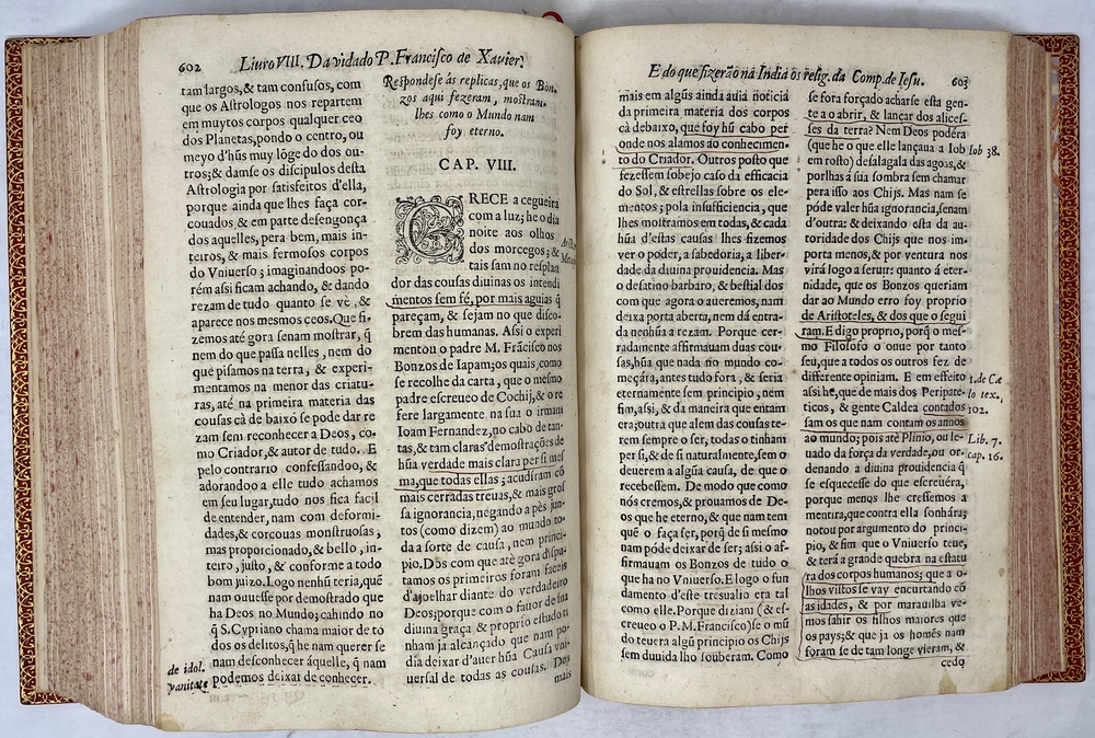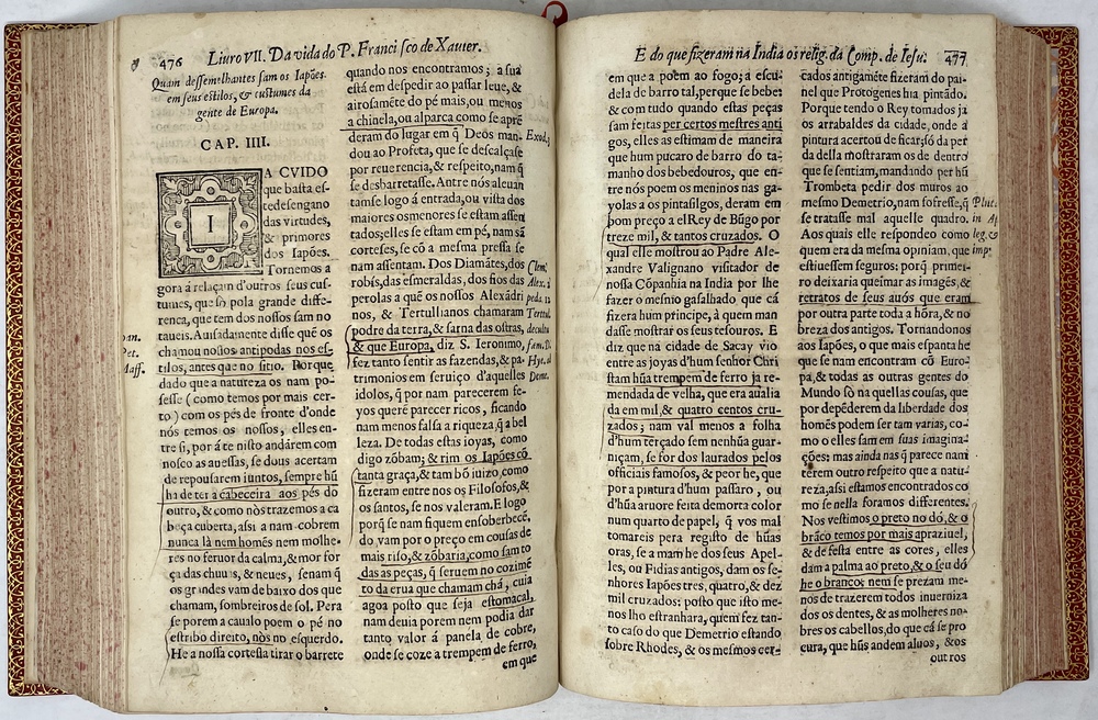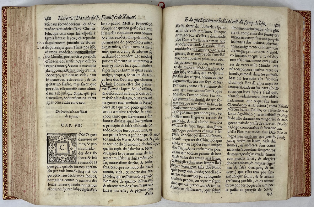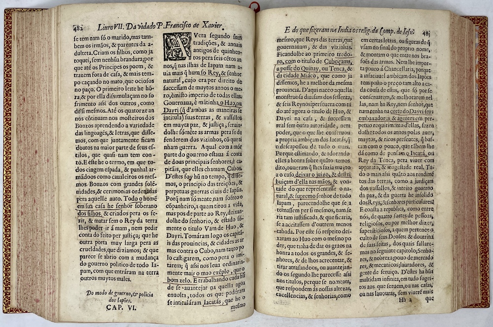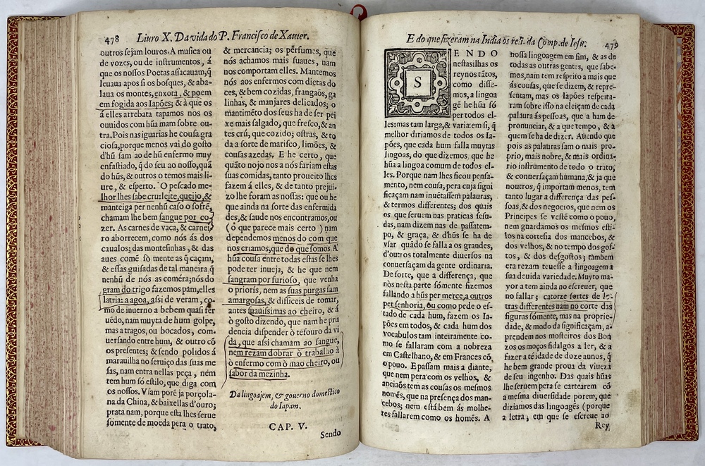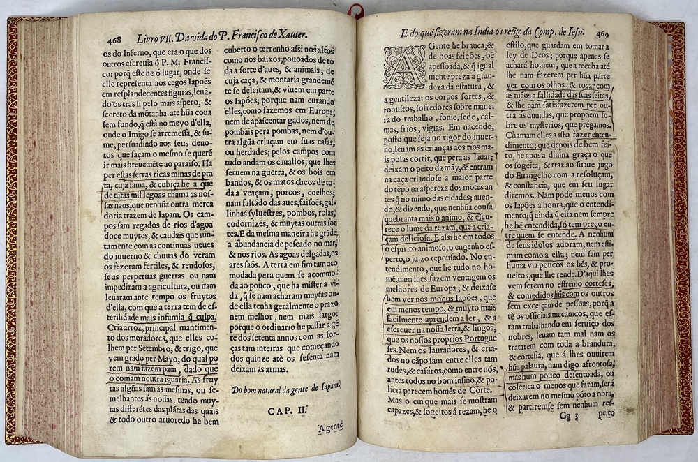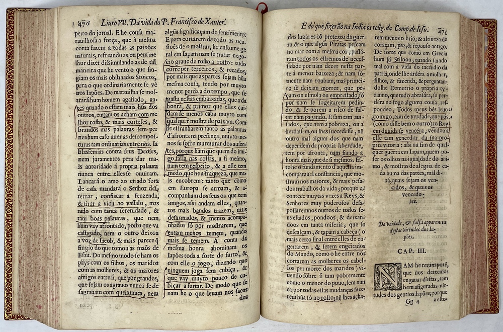 また、第7章はこの冒頭部分に続いて、日本の風習や人々の性質、言語、統治機構、社会状況、宗教事情、さまざまな産出物など、実に様々な角度から日本のことについて論じられていて、これらの記述もザビエルの書簡に依拠しつつ、それ以外のさまざまな史料も駆使してルセナが大きく補強したもので、ルセナ独自の「日本論」が随所で展開されている内容とも言えます。こうした本書独自の記述は、本書が単なるザビエルの伝記という範疇を超えて優れた欧文日本関係資料として高く評価される要素となっています。さらに、本書のテキストには刊行当時に近いものと思われるインクによる書き込みが多数なされていて、この「日本論」にあたる箇所にも全面に渡って下線引きがなされており、当時の読者の関心の諸相を垣間見ることができる、大変興味深い1冊となっています。