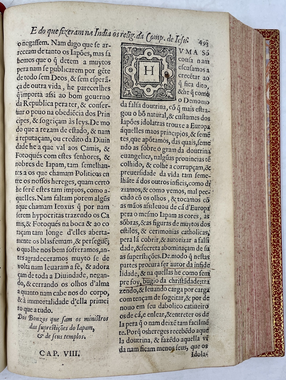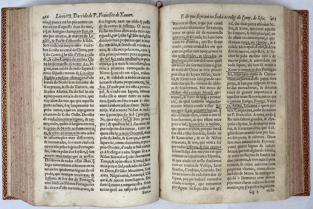 第7章の冒頭は、「多くの王国と島々からなる日本諸島について」(Do Sistio das Ilhas de Iapam, numero dos reynos, & calidades da terra)と題されていて、西洋における日本認識がいつから始まったのかや、その名称、位置、どのような島々で構成されているのかなどが解説されています。日本の名称については、マルコ・ポーロに由来する「ジパング(Zipangu)」に始り、「Nipongi」、「Iapam」、「Gipou」など、様々な名称があることが述べられ、ポルトガル人が漂着したことで本格的な交流が始まるまでの歴史が概観されています。多くの島々からなる日本列島は、主に大きな3つの島に集約されていて、首都である「京都(Meacò)」を擁し、「天下(tenca)」あるいは「機内(Quinay)」と呼ばれる地域を中心とする最も大きな島である「日本(Nifon、本州のこと)」、次いで「土佐(Tonça)」を中心とする「四国(Xicocó)」、そして「五島(Gotto)」、「平戸(Firãndo)」、「天草(Amacuçá))、「上津浦(Cózurá)」などの島々を含み、「豊後」(Bungo)、「日向(Fiunga)」、「大村(Vomura)」、「有馬(Arima)」、「薩摩(Saccumá, Cangoxima)」といった国々で構成されている「下(Ximo、九州のこと」によって、日本が構成されていると述べられています。こうした日本の地理についての詳細な情報は、ザビエル来日当時にはここまで明らかになっていなかったため、著者ルセナが読者のために独自に設けた記述と考えられます。