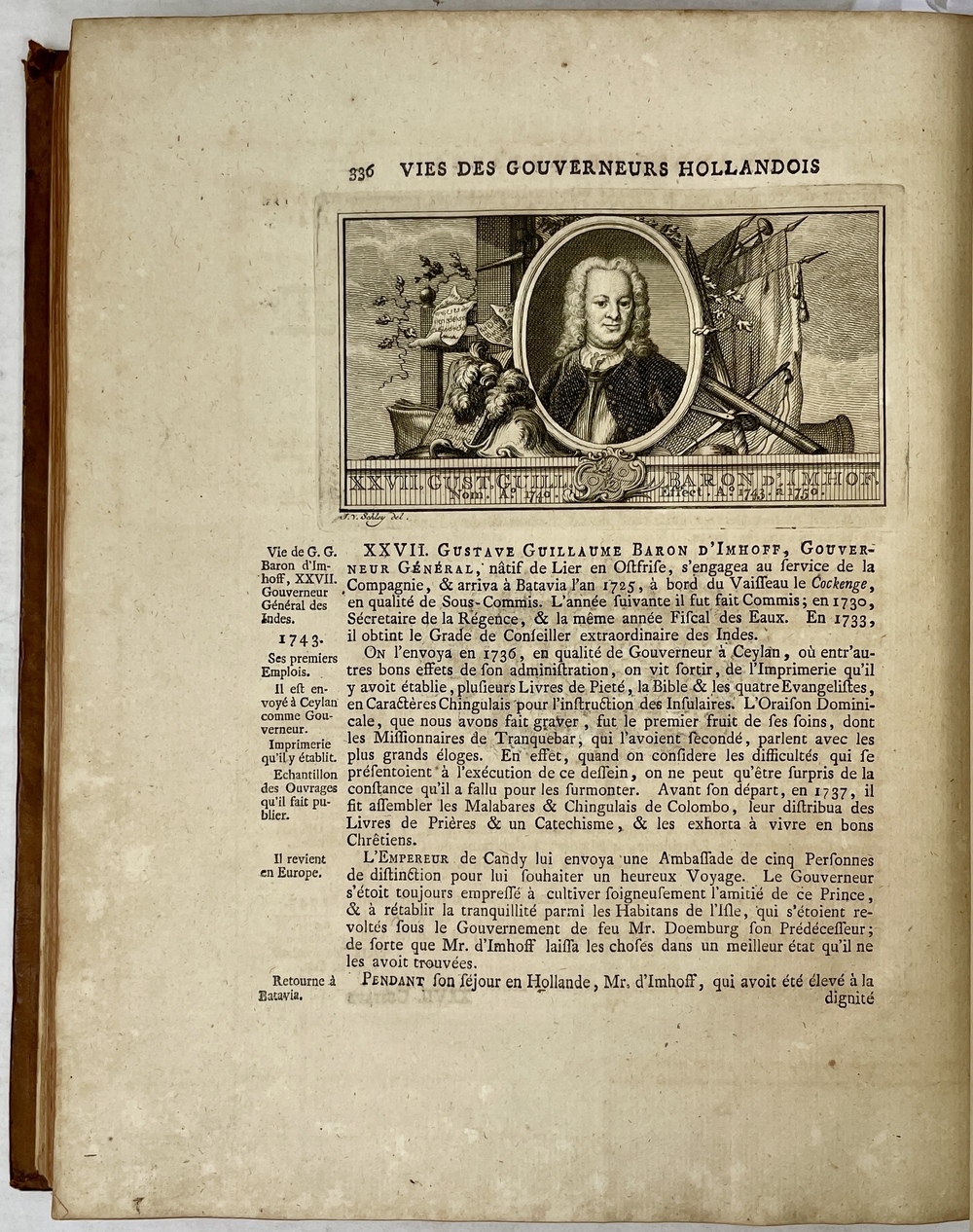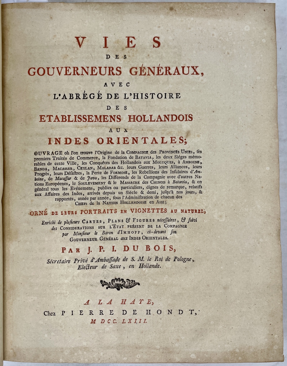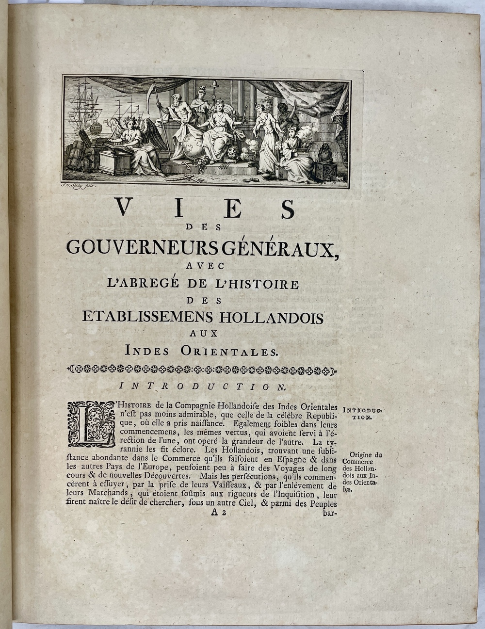 VIES DES GOUVERNEURS GÉNÉRAUX, AVEC L’ABRÉGÉ DE L’HISTOIRE DES ETABLISSEMENS HOLLANDOIS AUX INDES ORIENTALES;…ORNÉ DE LEURS PORTRAITS IN VIGNETTES AU NATUREL,…