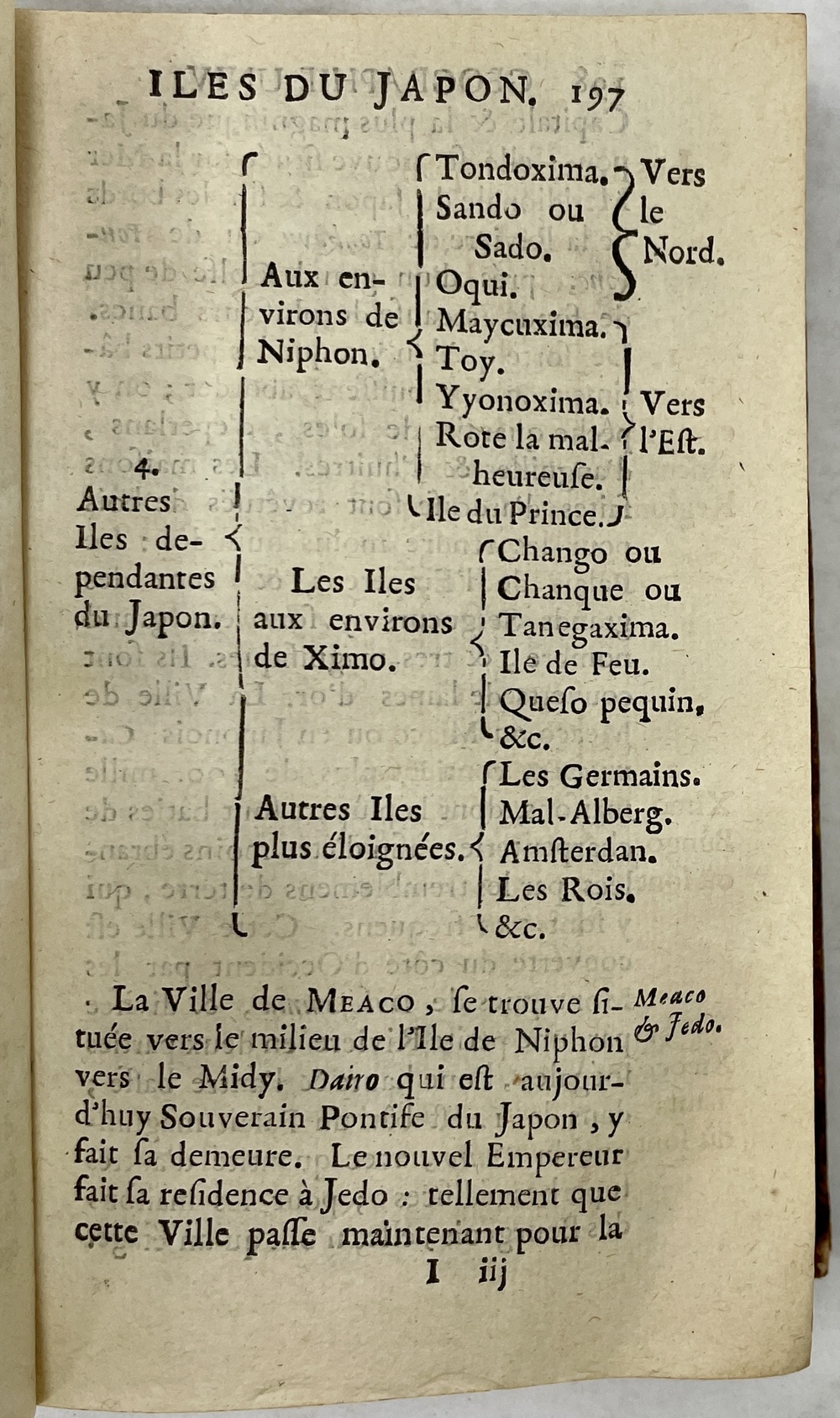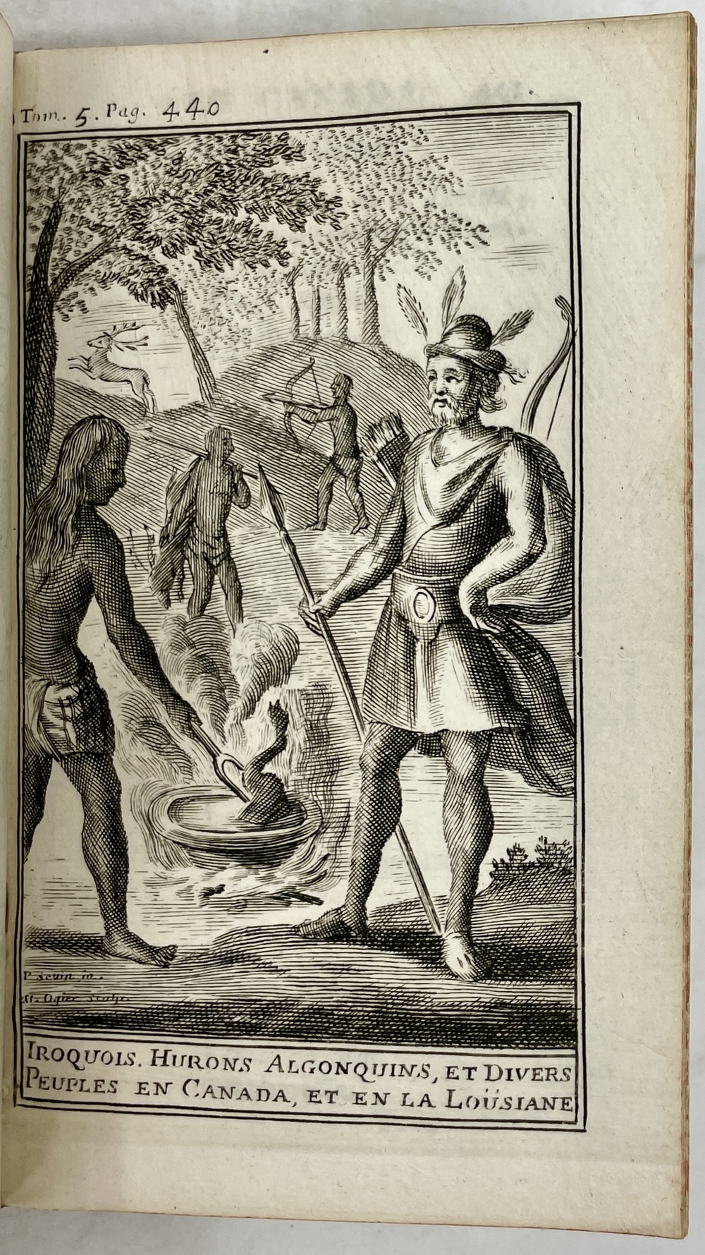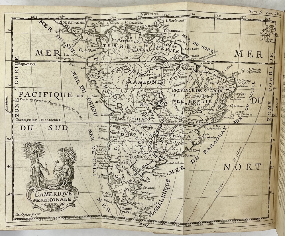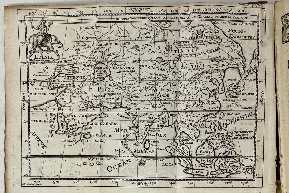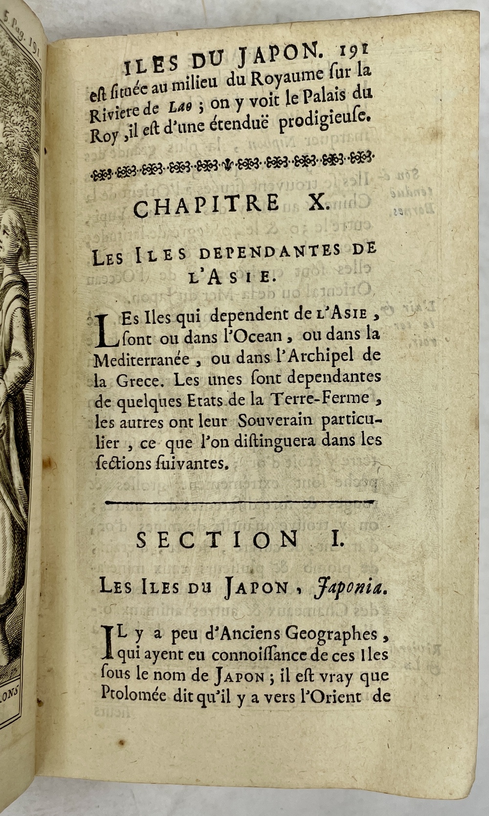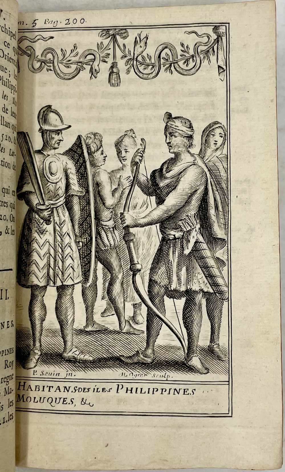 本書は1705年にリヨンで刊行された作品で、小型本ながら全5巻構成という非常にボリュームのある著作です。豊富な地図や図版を交えながら世界の地理や人々の文化をわかりやすく解説するという内容で、読み物としても楽しめるような作品です。アジア諸国を扱った第5巻では、日本についてもユニークな人物図を添えて解説されており、日本関係欧文図書としても大変興味深い著作と言えるものです。