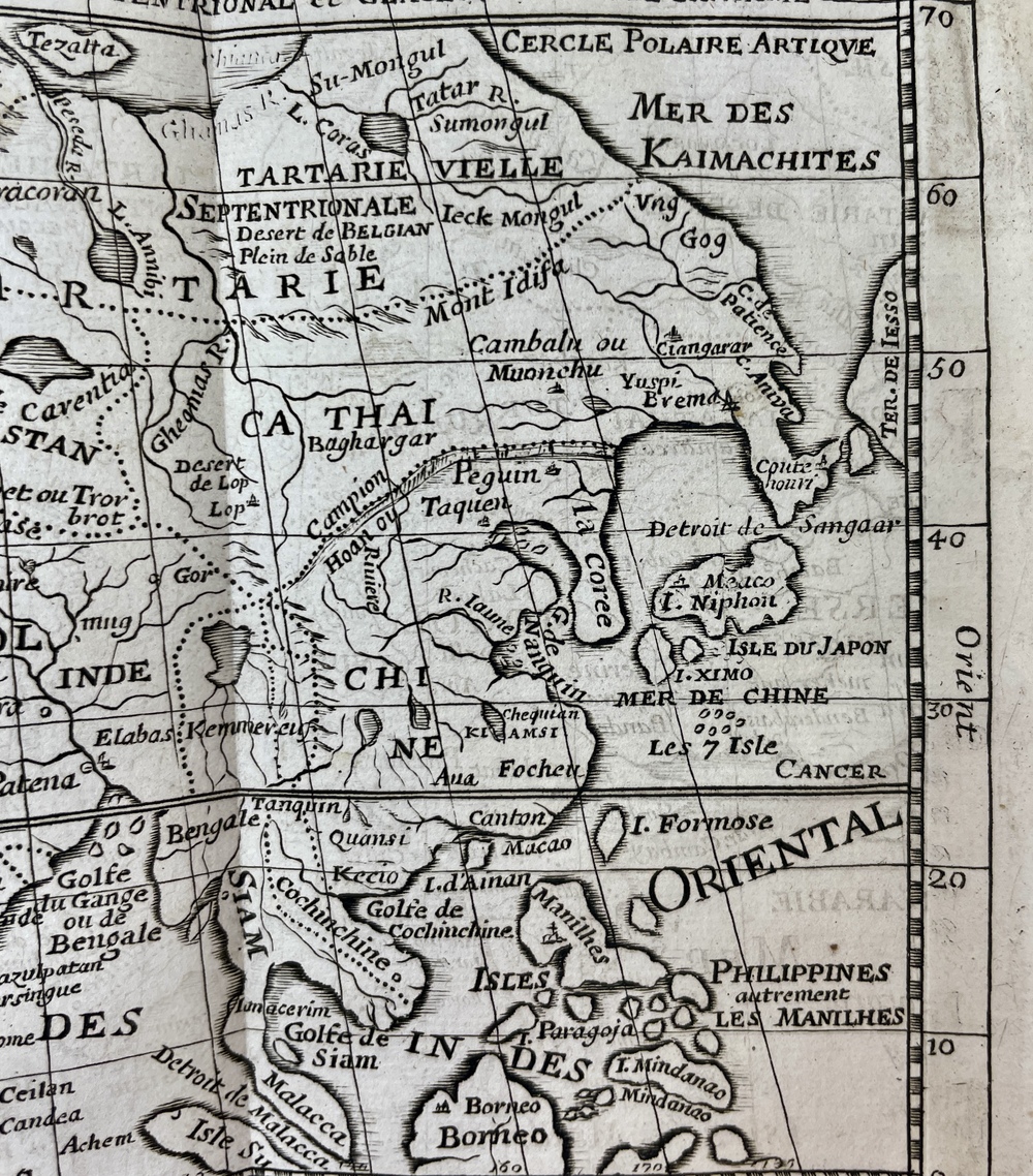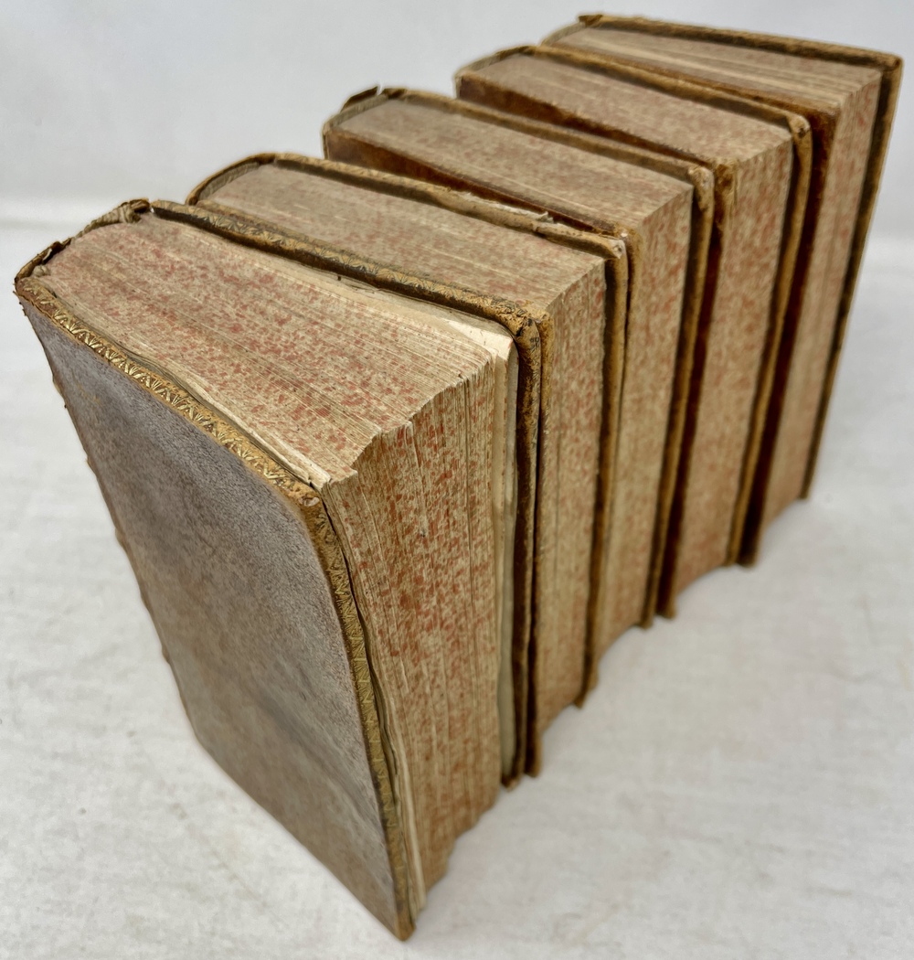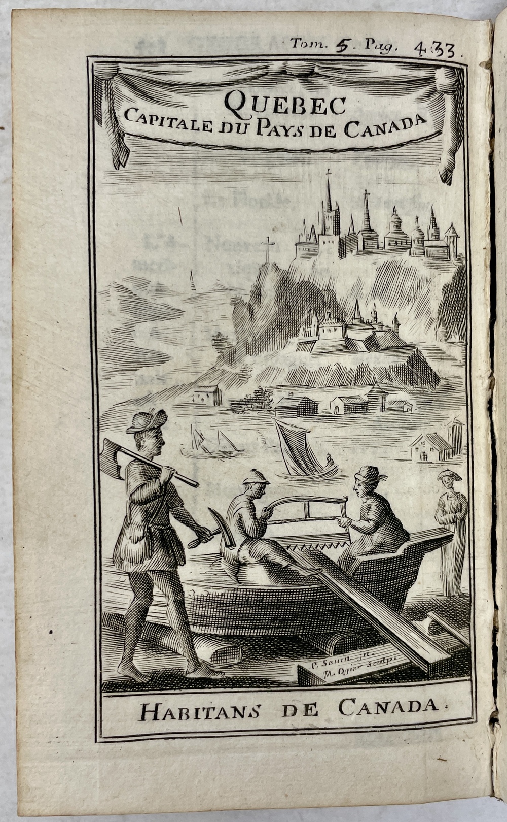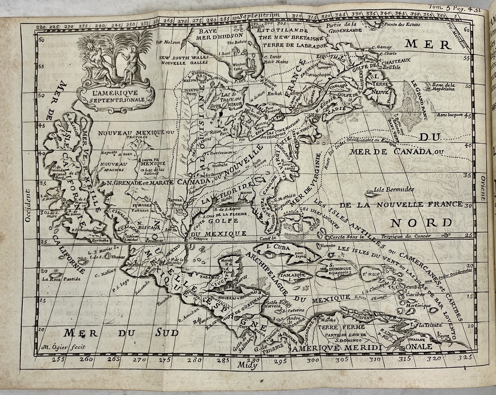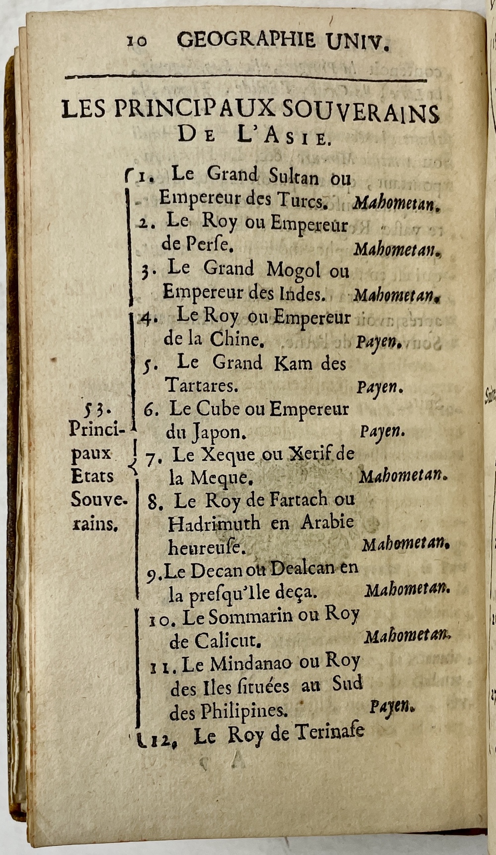本書は1705年にリヨンで刊行された作品で、小型本ながら全5巻構成という非常にボリュームのある著作です。豊富な地図や図版を交えながら世界の地理や人々の文化をわかりやすく解説するという内容で、読み物としても楽しめるような作品です。アジア諸国を扱った第5巻では、日本についてもユニークな人物図を添えて解説されており、日本関係欧文図書としても大変興味深い著作と言えるものです。