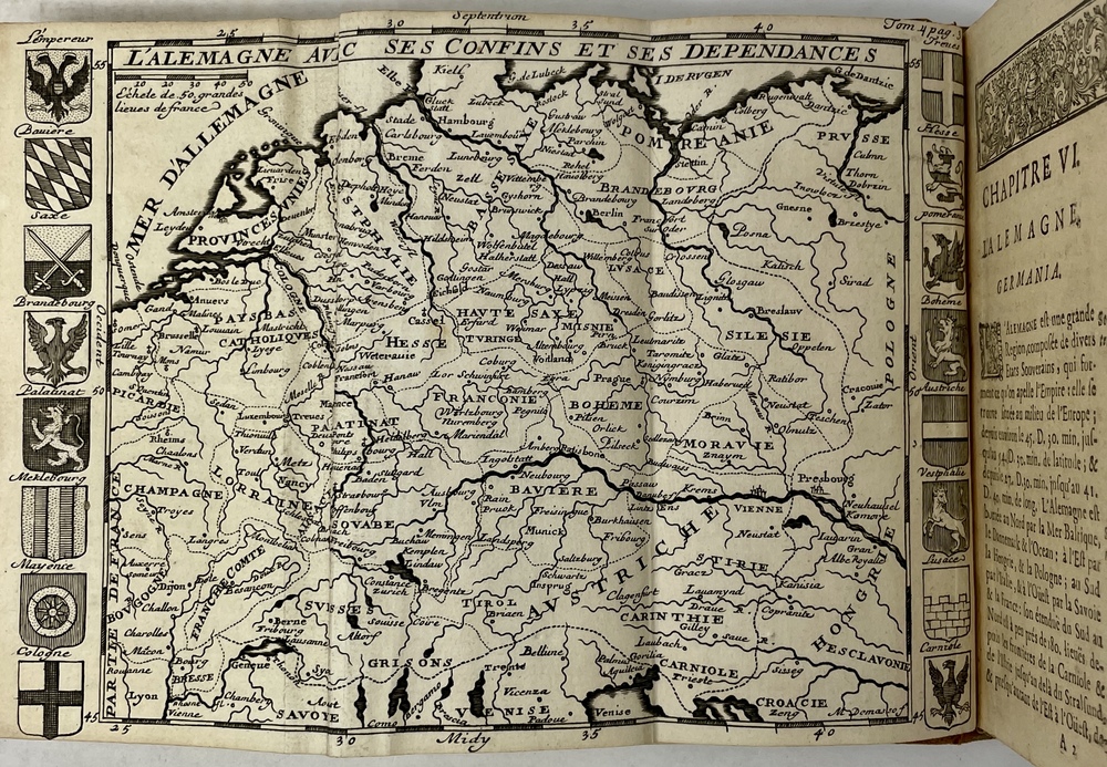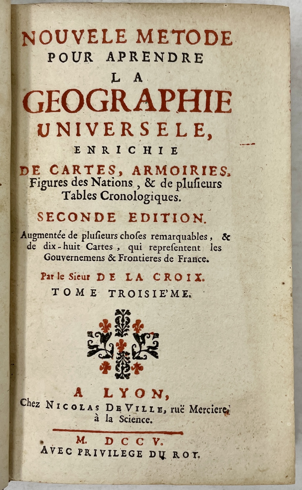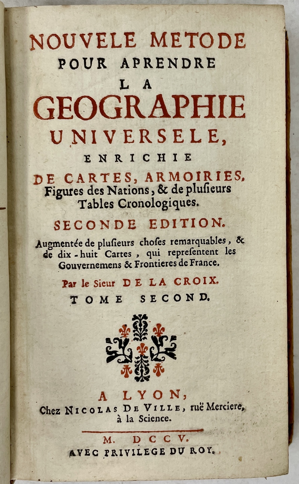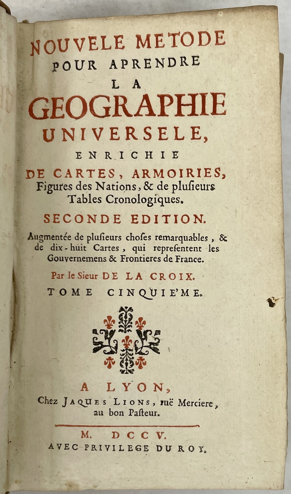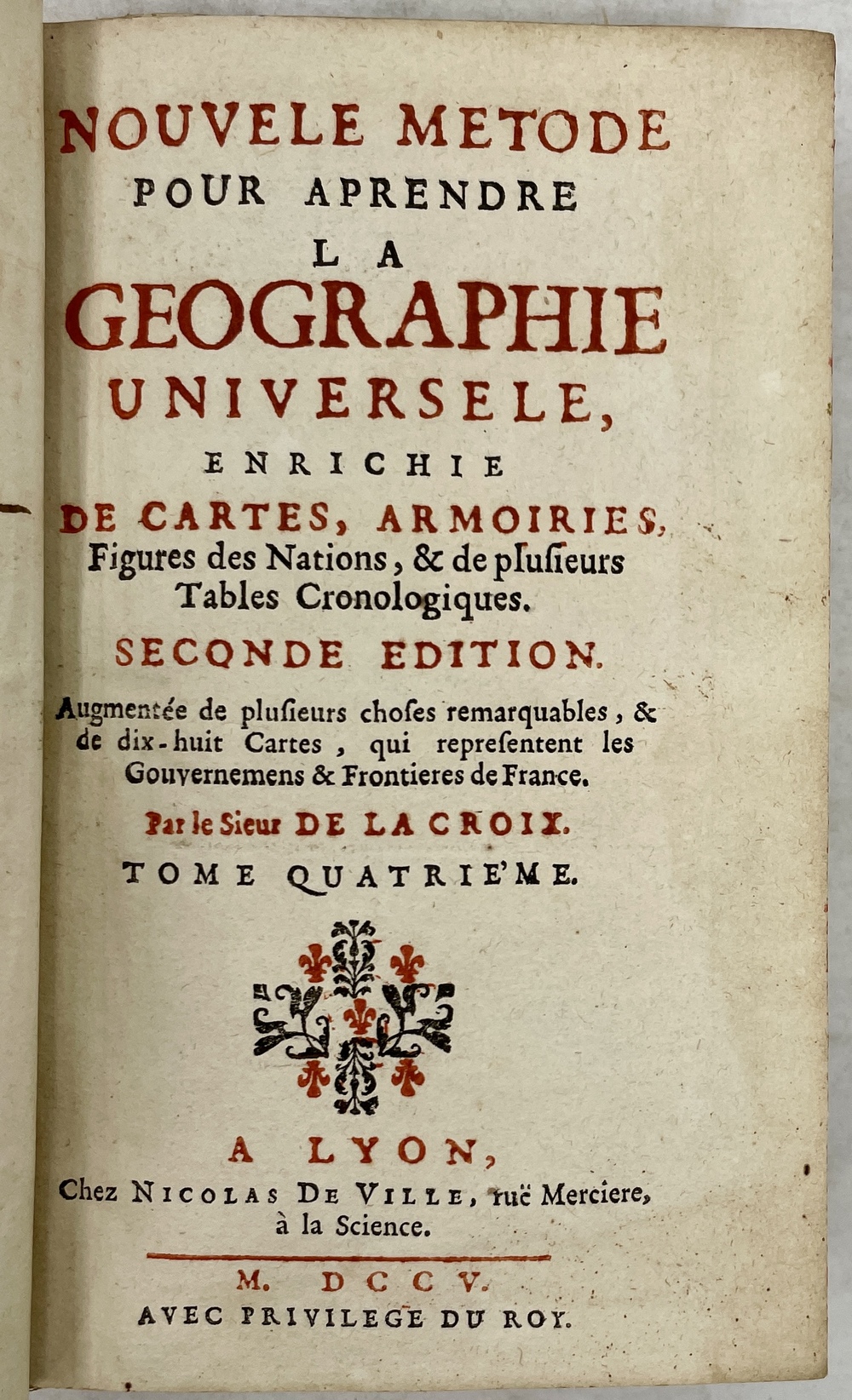 著者ラクロア (ean-François de La Croix, 1640?- 1715?)についての詳しい情報は、ほとんどありませんが、本書の他にもアフリカ論をはじめとしたいくつかの著作を残していることが確認できることから、地理学や歴史学について一定の教養とネットワークを備えた人物であったと推測されます。本書は、タイトルに明記されているように数多くの図版、地図を収録していることが本書の大きな特徴で、両半球、ヨーロッパ、アジア、アフリカといった地域全体を収めた地図に加え、ヨーロッパについては各国、地方の図版も収録しています。本書は、1690年に刊行された初版に続いて1705年に刊行された第2版で、当初は全4巻構成でしたがこの第2版では新たに第5巻が加わり、その内容に増補改訂が加えられています。