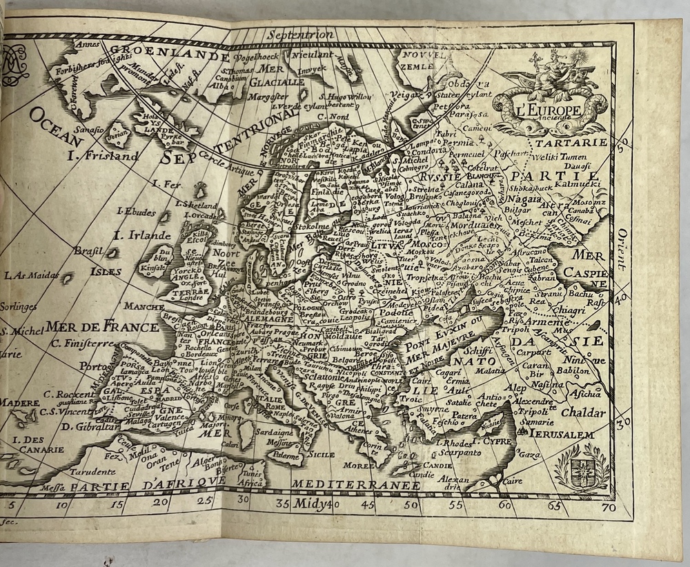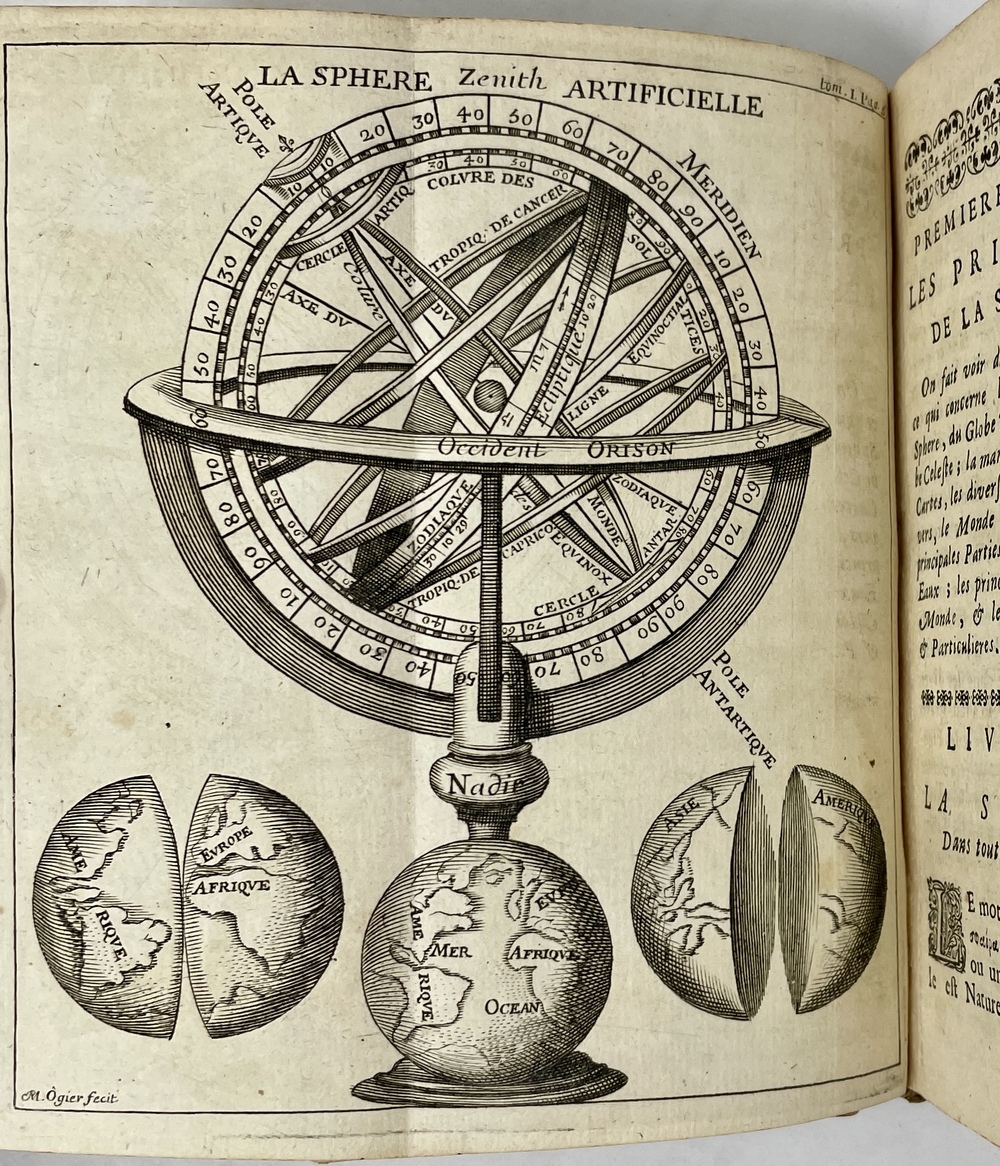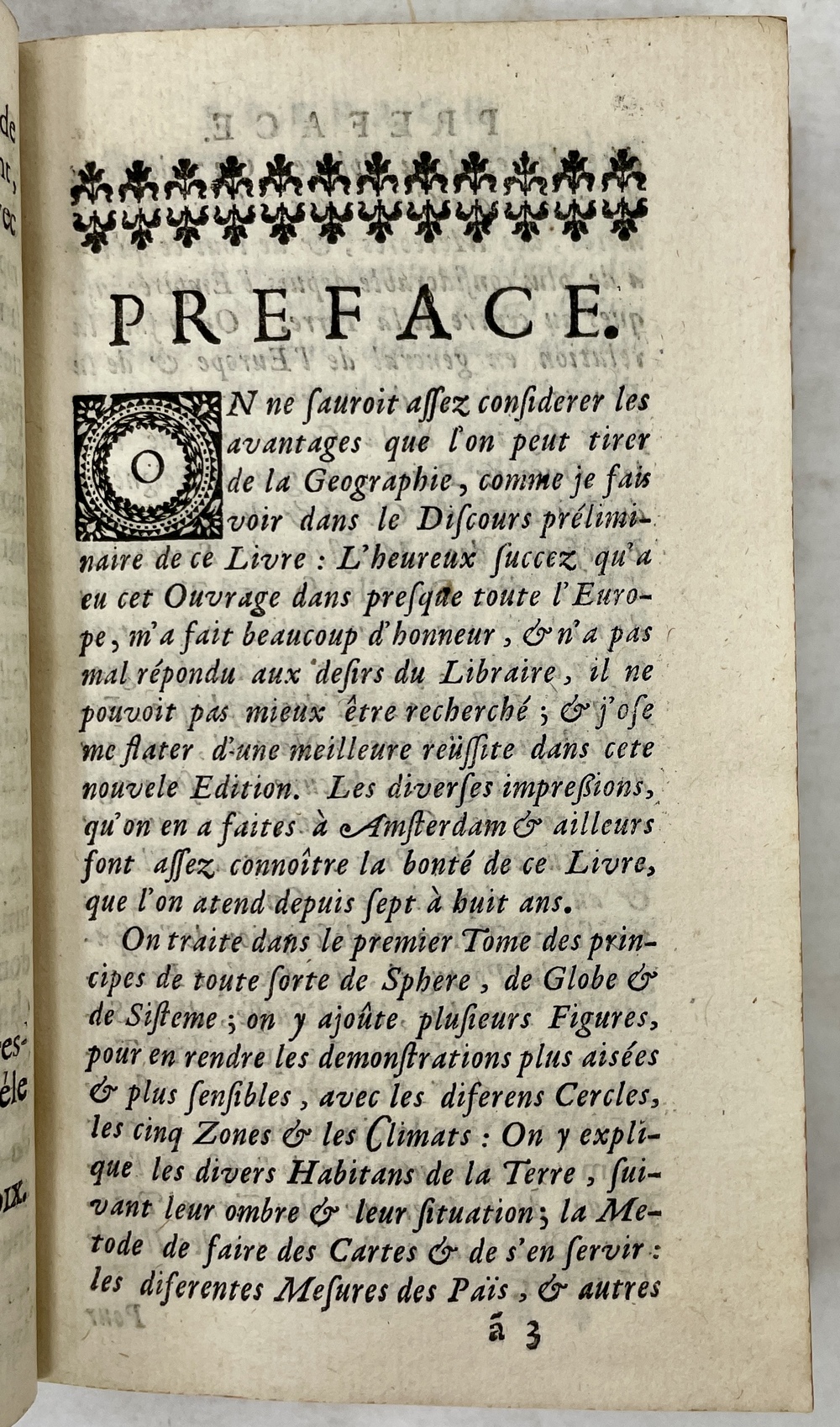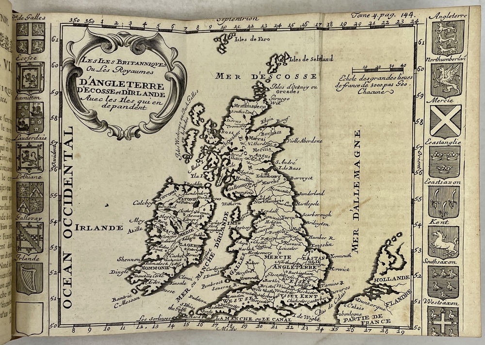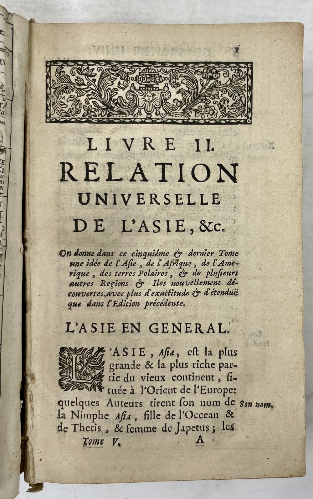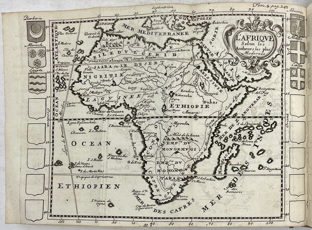 著者ラクロア (ean-François de La Croix, 1640?- 1715?)についての詳しい情報は、ほとんどありませんが、本書の他にもアフリカ論をはじめとしたいくつかの著作を残していることが確認できることから、地理学や歴史学について一定の教養とネットワークを備えた人物であったと推測されます。本書は、タイトルに明記されているように数多くの図版、地図を収録していることが本書の大きな特徴で、両半球、ヨーロッパ、アジア、アフリカといった地域全体を収めた地図に加え、ヨーロッパについては各国、地方の図版も収録しています。本書は、1690年に刊行された初版に続いて1705年に刊行された第2版で、当初は全4巻構成でしたがこの第2版では新たに第5巻が加わり、その内容に増補改訂が加えられています。