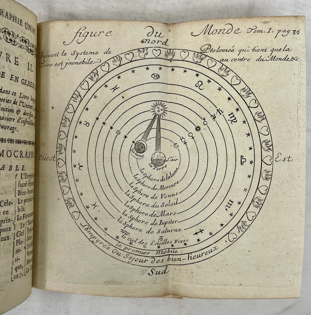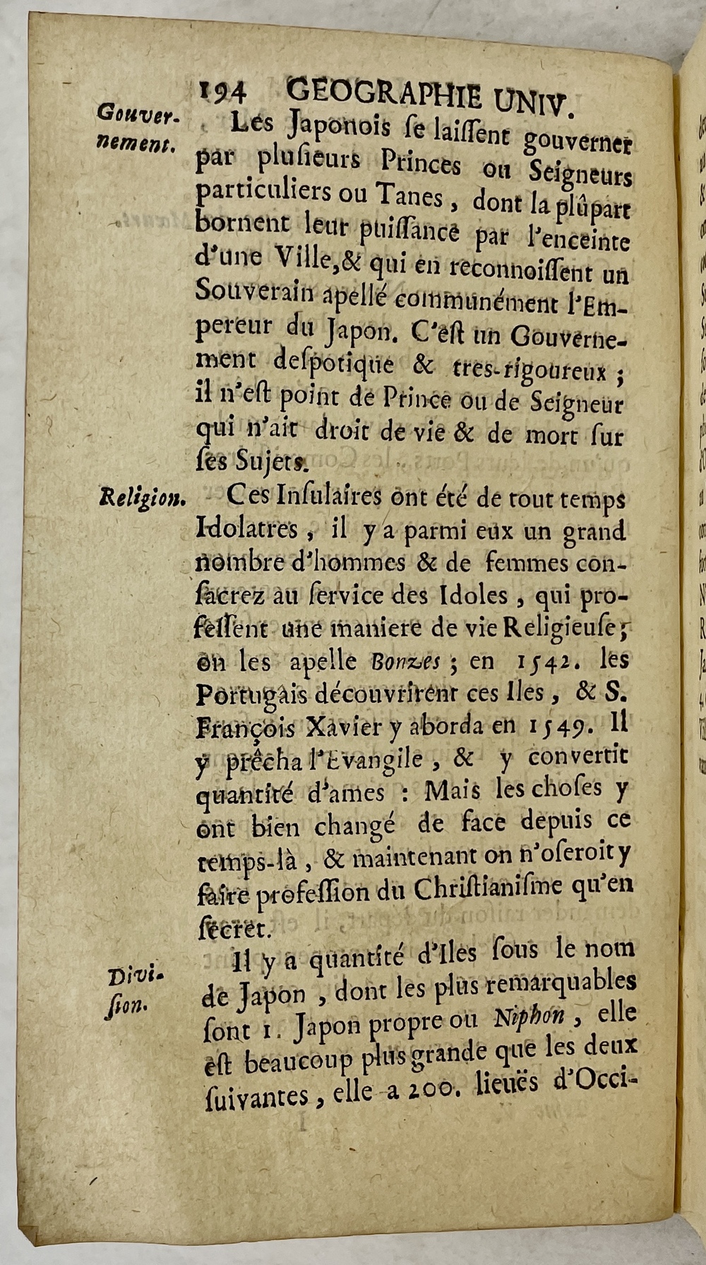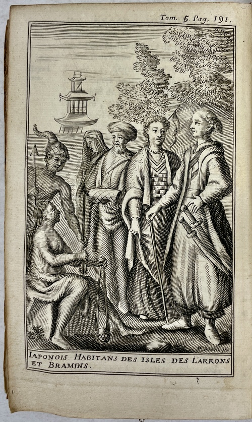 第1巻は地理学概論とヨーロッパ全体の概論となっています。ここでは地理学だけでなく天文学も含めて解説がなされており、天球図や、地動説、天動説それぞれの各論とそれを表した図版も収録されています。第2巻は、本書がフランス語で執筆された著作であることを反映して、全てがフランスの記述に費やされています。第3巻、第4巻はスペインほかフランスを除くヨーロッパの各国、地域が扱われています。第5巻は最もボリュームのある巻で、アジア、アフリカ、アメリカを扱っています。この第5巻全体は、初版が全4巻構成であったことに鑑みると、この第2版において新たに追加された部分かと思われます。冒頭には日本を含むアジア各国地域全体を描いた折り込み地図や、アジアの国々、地域を宗教別に分類した一覧表が掲載されています。この第5巻では、中国や日本についての詳しい記述が掲載されていて、日本については第10章第1節(pp191-)]で集中的に論じられていて、その地理、歴史、政治体制、宗教、主要都市の解説などコンパクトながらも多彩なテーマを論じた記事が掲載されています。さらに日本の人々を描いたとする図版も収録されており、これはモンタヌスの『東インド会社遣日使節紀行』に収録された図版など何らかの先行文献を参照して描かれたものではないかと思われるのですが、ターバンを巻いた中東風の老人やアメリカの先住民を描いたと思われるような人々と一緒に描かれるというユニークな図版となっており、あまり他に類似の描き方の図が見当たらないユニークな日本の人物像となっています。
