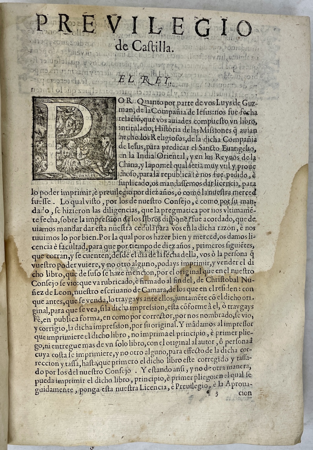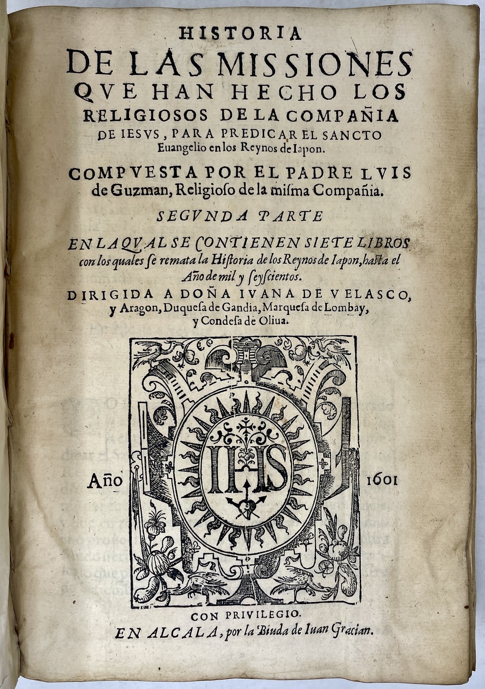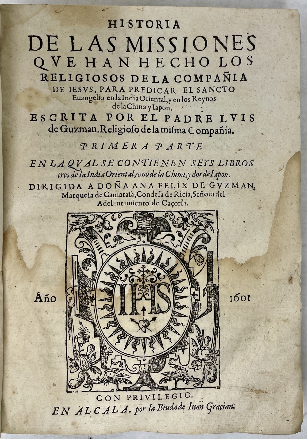 本書は、イエズス会の著作家であるグスマン(Luis de Guzman, 1544 - 1605)による、ザビエルの日本宣教開始から当時の現在(1598年頃)に至るまでのイエズス会宣教史を全2巻にまとめた著作で、1601年にスペインのマドリッドにほど近いアルカラで刊行されています。新井トシ氏による邦訳『東方伝道史』(天理時報社、1944年)によって「日本教会史」不朽の名著として現在に至るまで高く評価されている作品です。その一方で、現在では入手が難しく、また著しく高額な書物としても知られています。