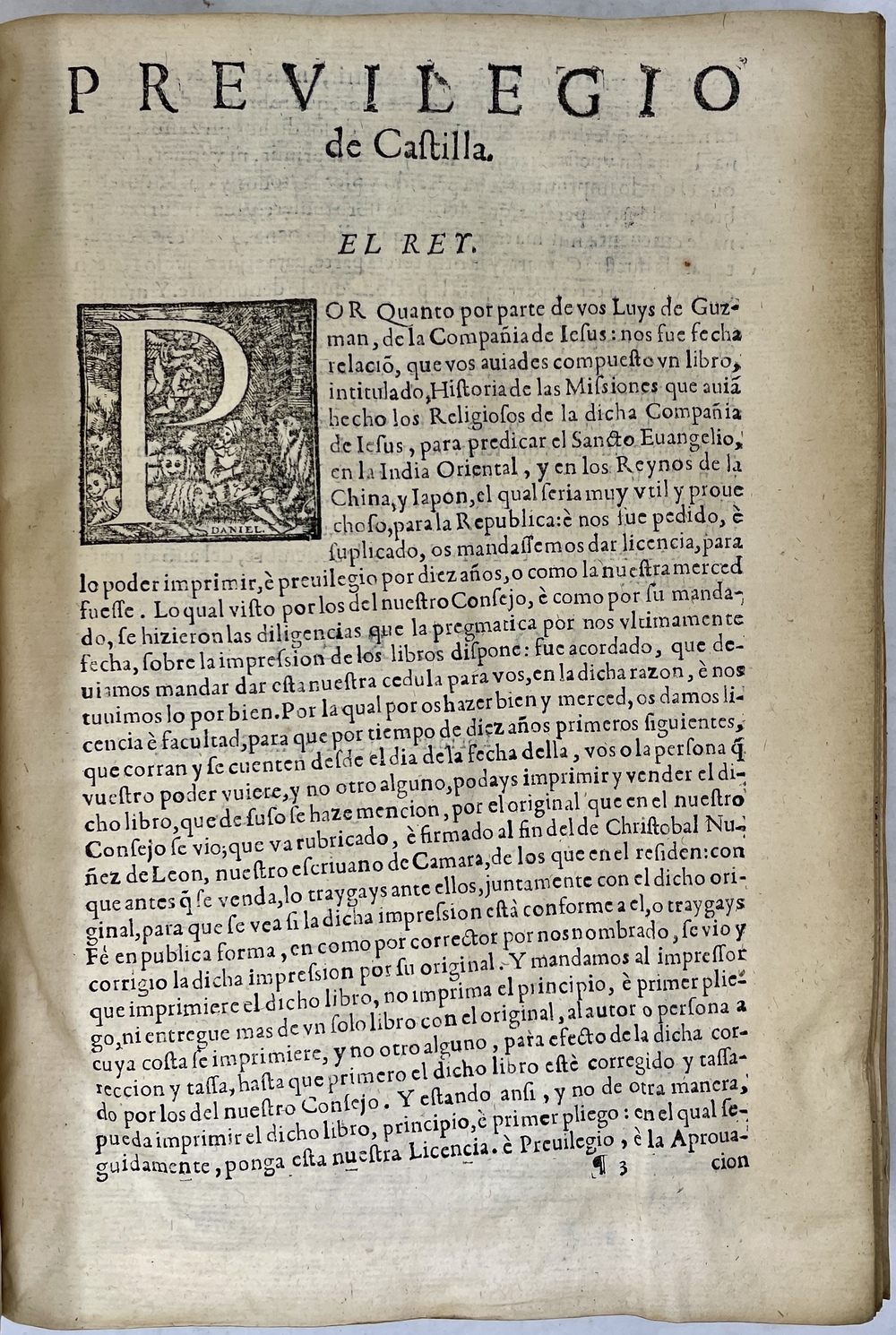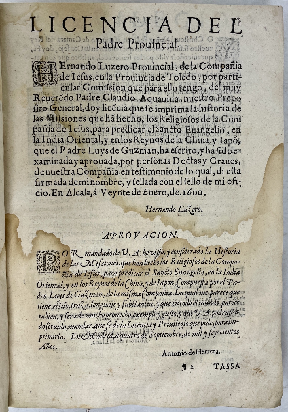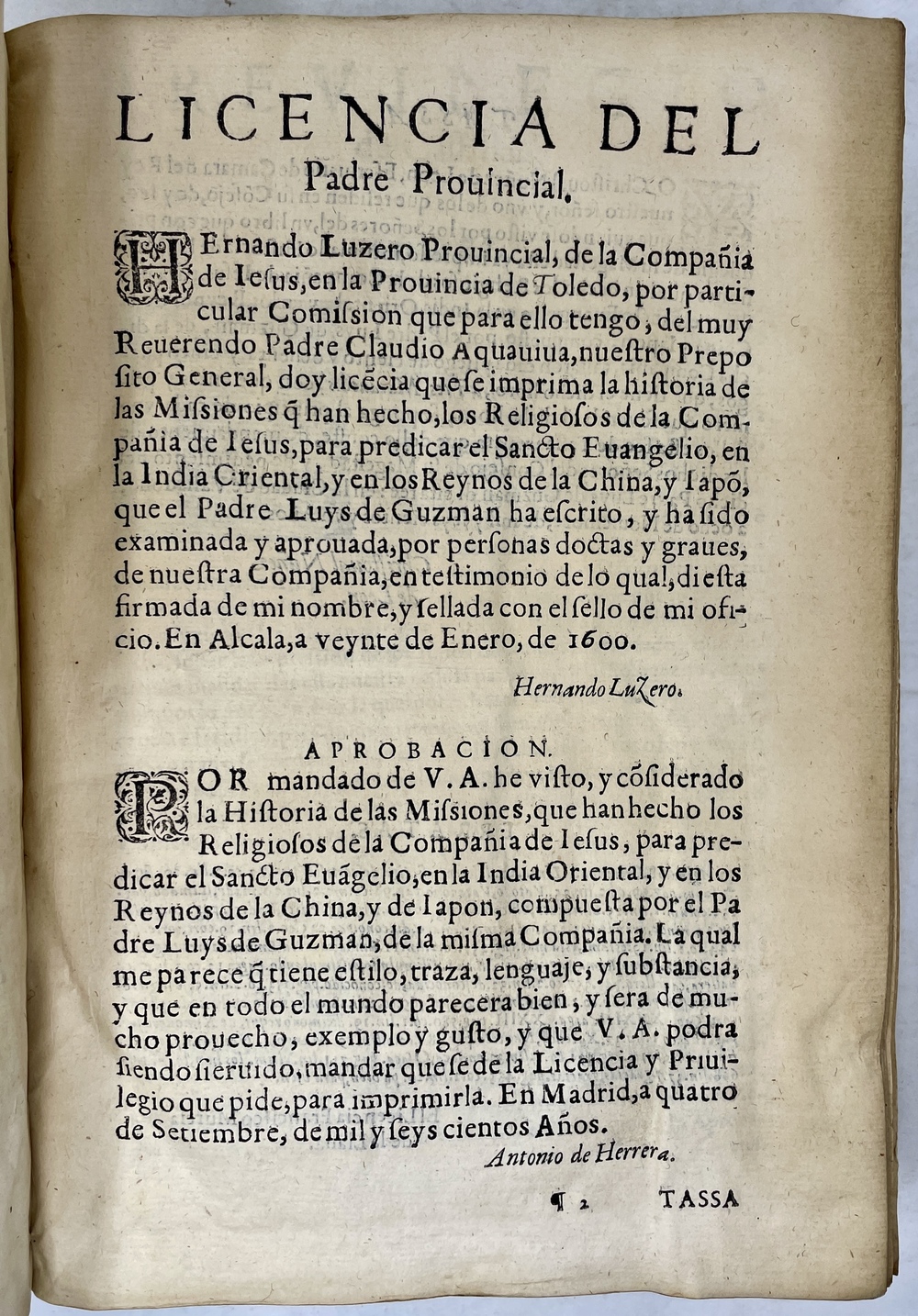 本書は、イエズス会の著作家であるグスマン(Luis de Guzman, 1544 - 1605)による、ザビエルの日本宣教開始から当時の現在(1598年頃)に至るまでのイエズス会宣教史を全2巻にまとめた著作で、1601年にスペインのマドリッドにほど近いアルカラで刊行されています。新井トシ氏による邦訳『東方伝道史』(天理時報社、1944年)によって「日本教会史」不朽の名著として現在に至るまで高く評価されている作品です。その一方で、現在では入手が難しく、また著しく高額な書物としても知られています。