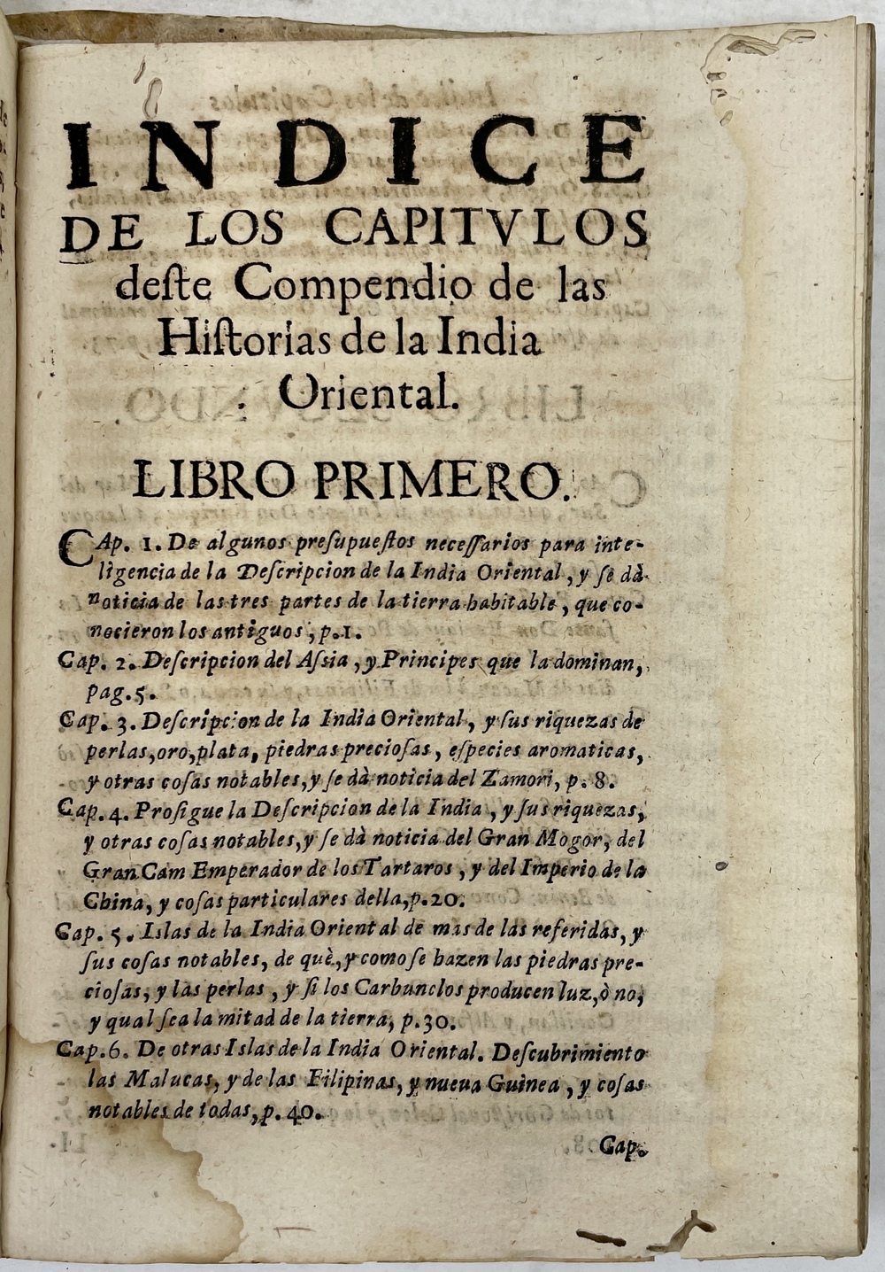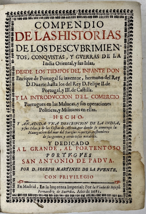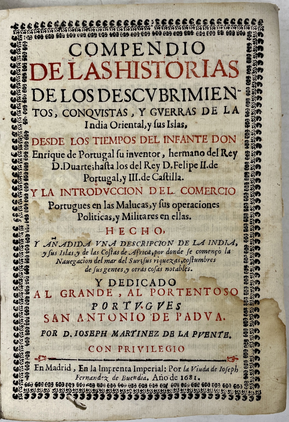 COMPENDIO DE LAS HISTORIAS DE LOS DESCVBRIMIENTOS, CONQVISTAS, Y GVERRAS DE LA India Oriental, y sus Islas, ...Y LA INTRODVCCION DEL COMERCIO Portugues en las Malucas, ...HECO Y AN ADIDA VNA DESCRIPCION DE LA INDIA...