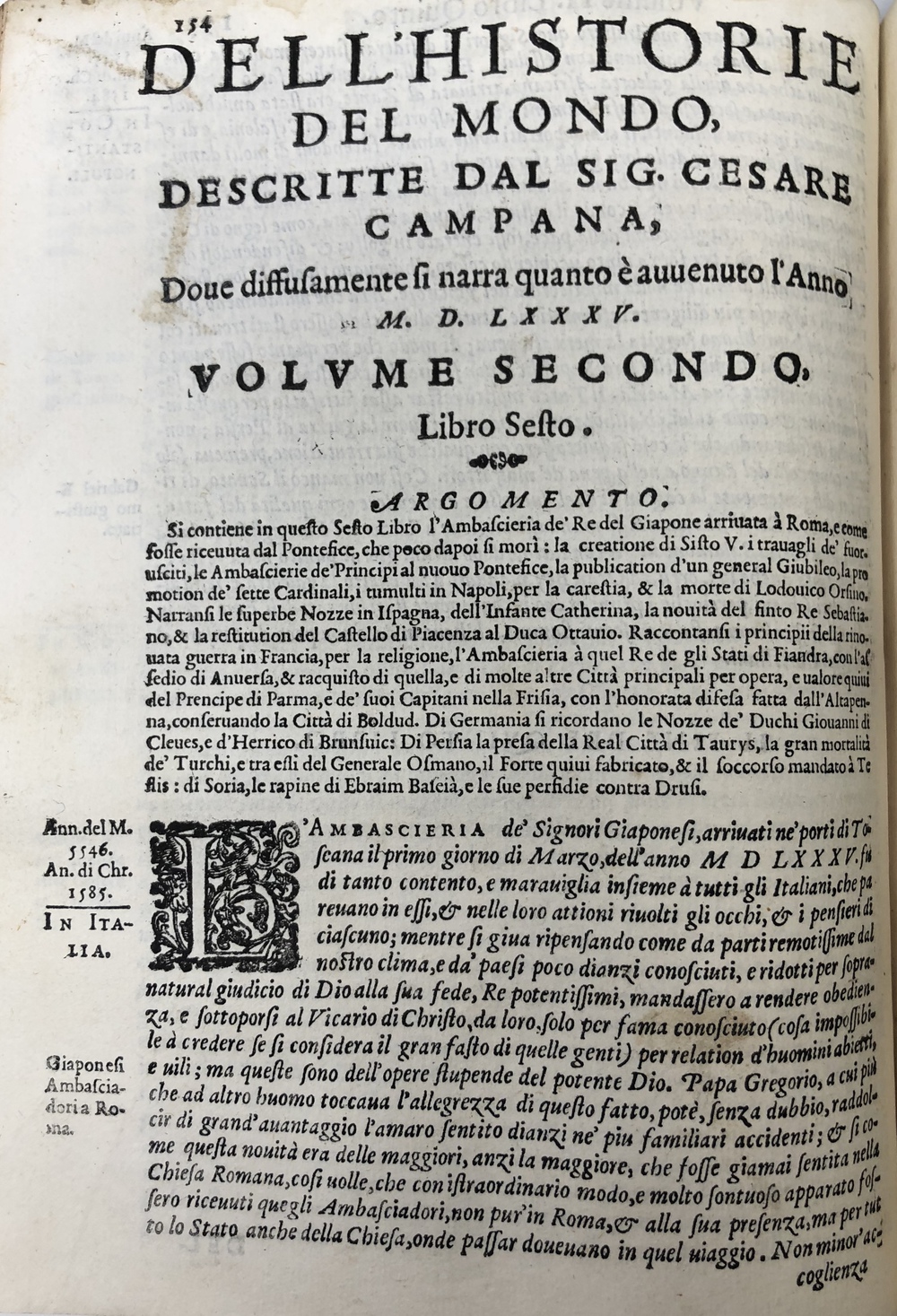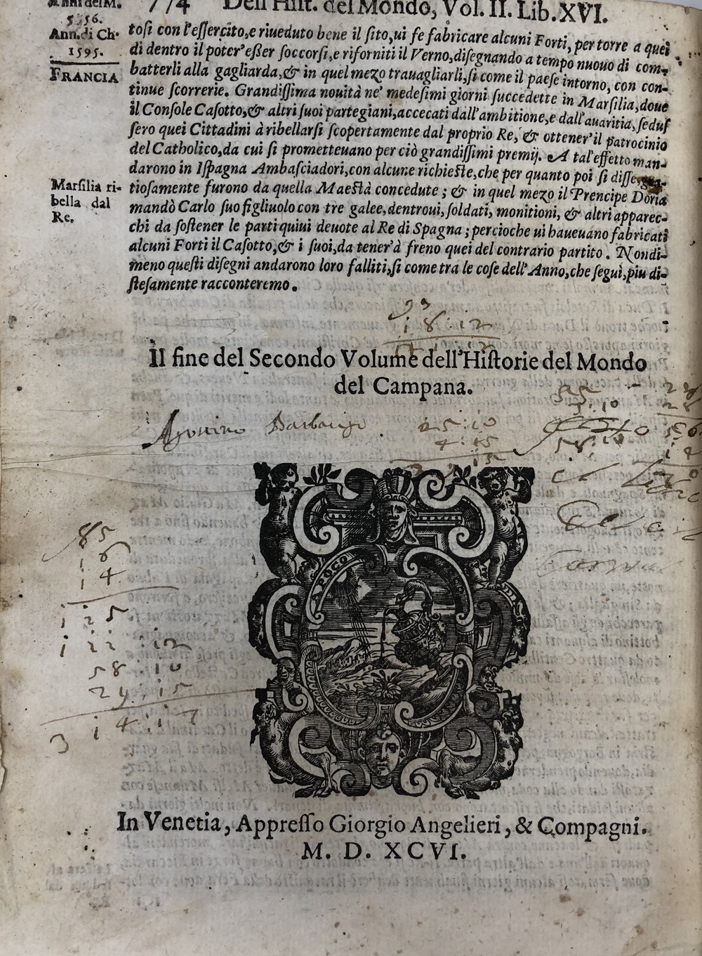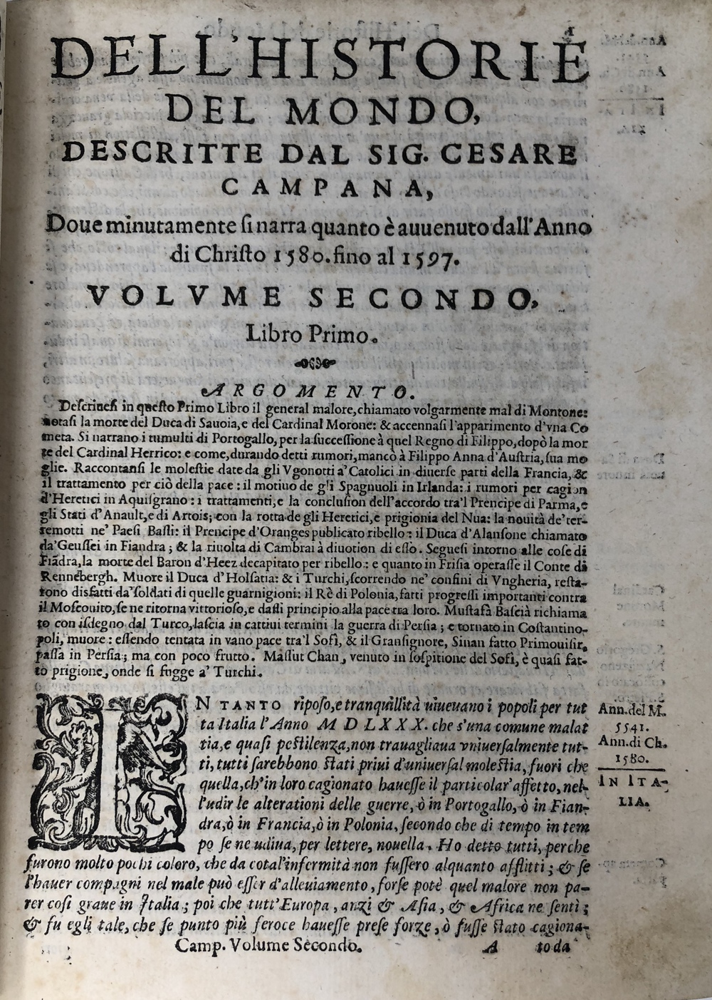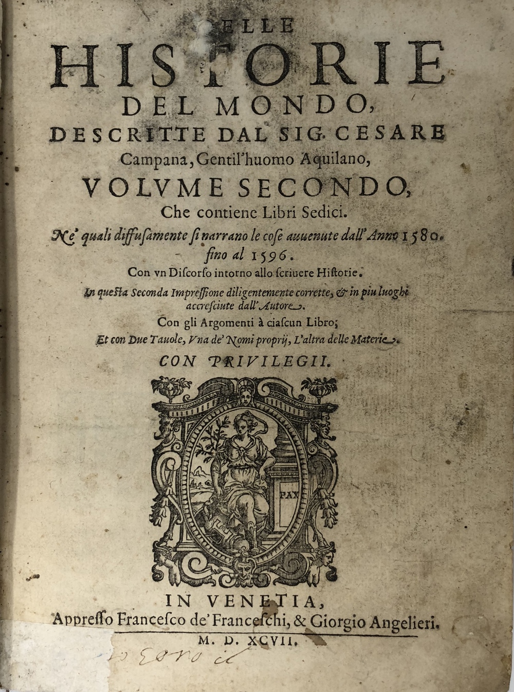 DELLE HISTORIE DEL MONDO, DESCRITTE DAL SIG. CESARE Campana, Gentil'huomo Aquilano, VOLVME SECONDO, Che contience Libri Sedici. ...dall' Anno 1580. fino al 1596....
