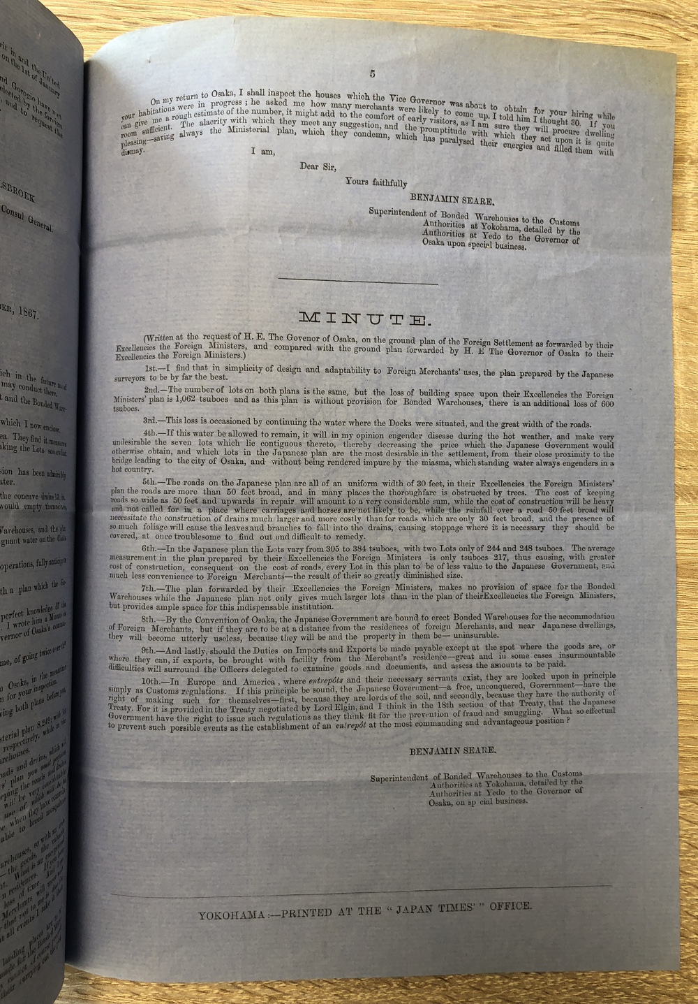 報告書末尾には、YOKOHAMAーPRINTED AT THE "JAPAN TIMES'" OFFICE とあり、このことから、1865年9月に横浜で『ジャパン・コマーシャル・ニュース』を買収して創刊した『ジャパン・タイムズ』社で印刷されたことがわかります。