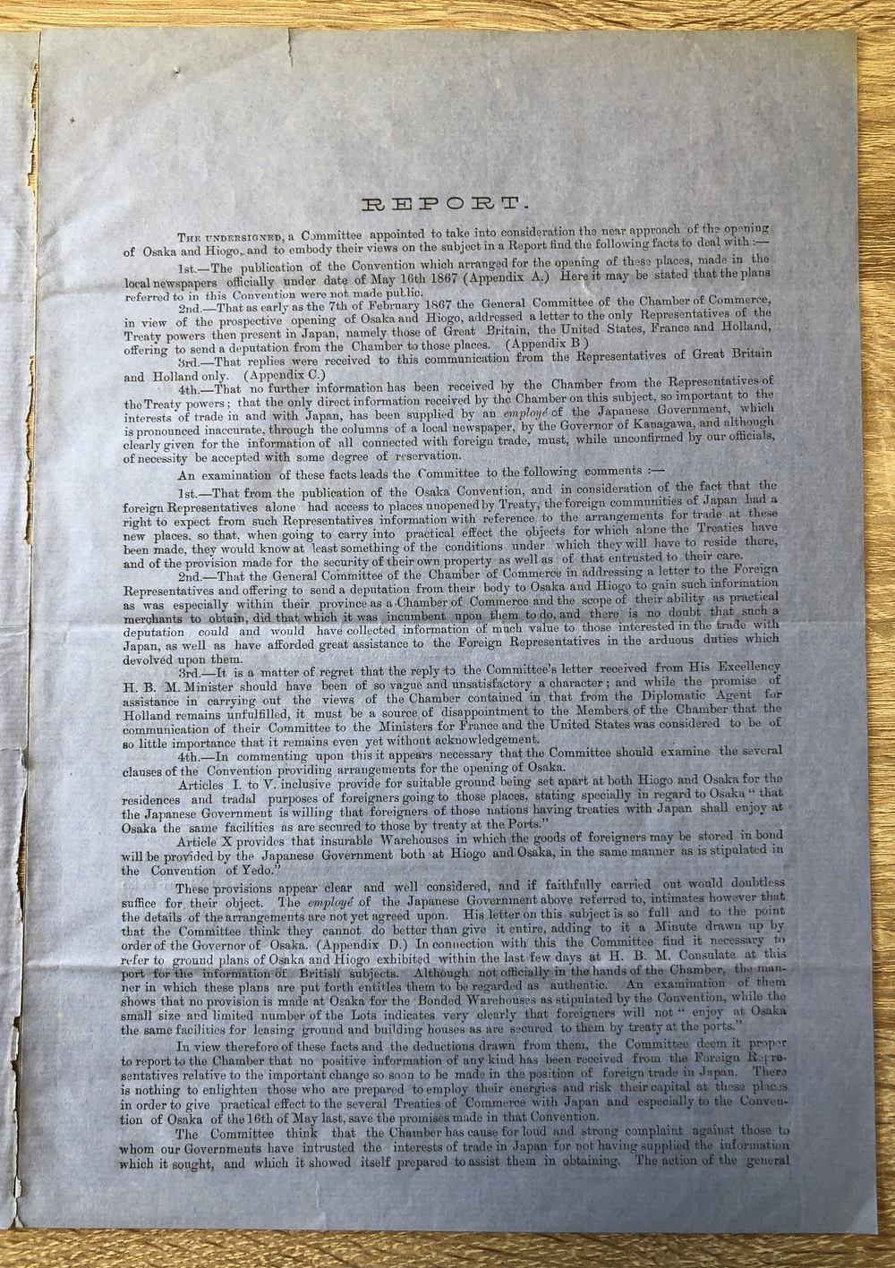 報告書はテキスト5ページからなる短い小冊子ですが、当時のアメリカ商人を中心とした民間人が、大阪、兵庫両港の開港をどのように捉えていたかを伝える大変貴重内容となっています。まず、冒頭に1ページ強ほどの基本報告書があり、その付論(APPENDIX)がAからDまで、そして最後に1ページ弱ほどの覚書き(MINUTE)が続きます。