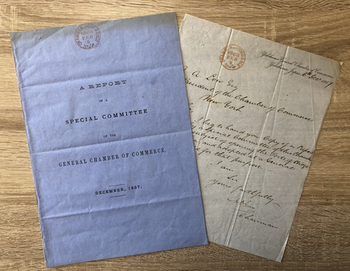 この報告書は、アメリカ総商業会議所の代表を務めていたゲイ(A.O. Gay, 生没年、詳細不明)によって、ニューヨークの総本部に送られました。その際に同封された手書きの書簡が、本資料には付属しています。書簡の日付は、1867年12月6日となっており、横浜アメリカ総商業会議所の書簡用紙に手書きで認められたものです。受け取り側であるニューヨーク総本部の受領印も押印されており、受取日は、書簡作成の2ヶ月後である1868年2月6日となっています。ニューヨーク総本部では、世界中から提出される報告書を編纂して定期的に年次報告として刊行しており、この報告も、1868年に刊行された第10次年次報告書(Tenth Annual Report of the Chamber of Commerce of the State of New-York, for the year 1867-'68. 1868. New-York: John W. American Printer)において、次のように掲載されています。