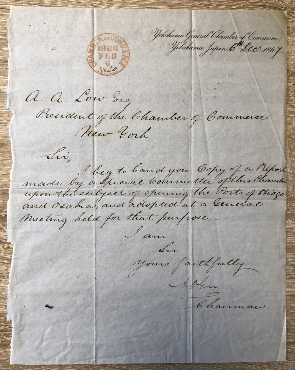 A communication was read from Mr. A. O. GAY, Chairman of the General Chamber of Commerce of Yokohama, Japan, dated December 6, 1867, and enclosing a copy of a report made by a special Committee upon the opening of the ports of Hioga and Osaca, which was ordered on file.