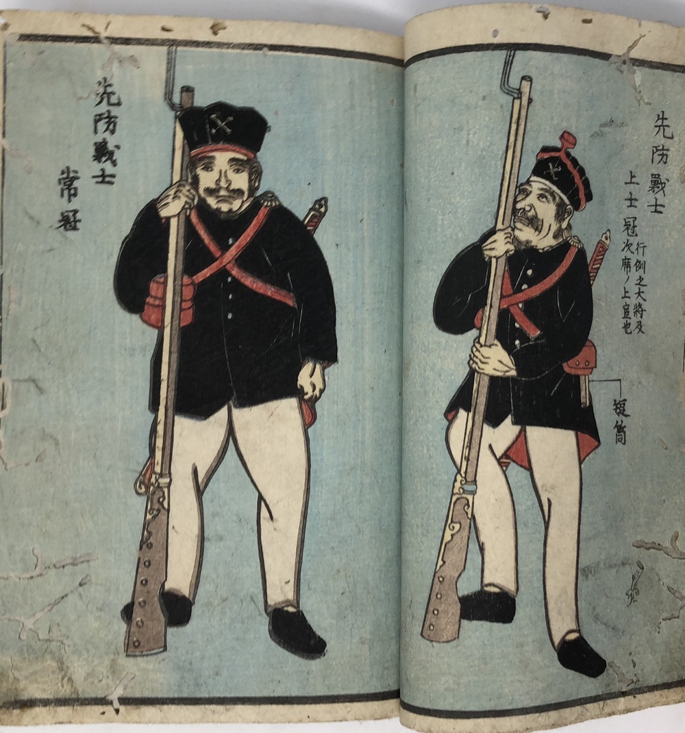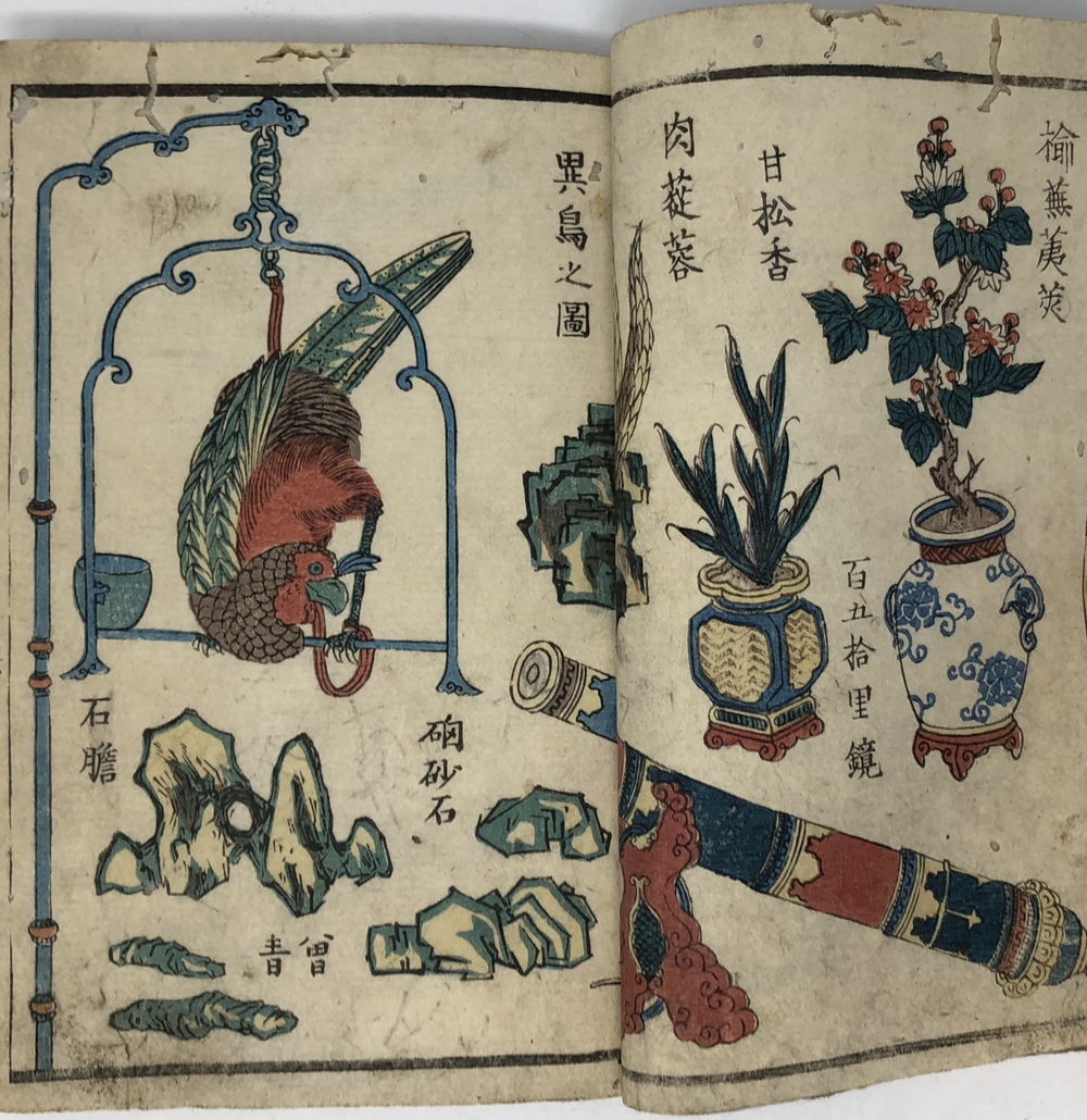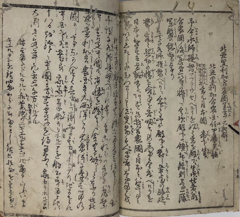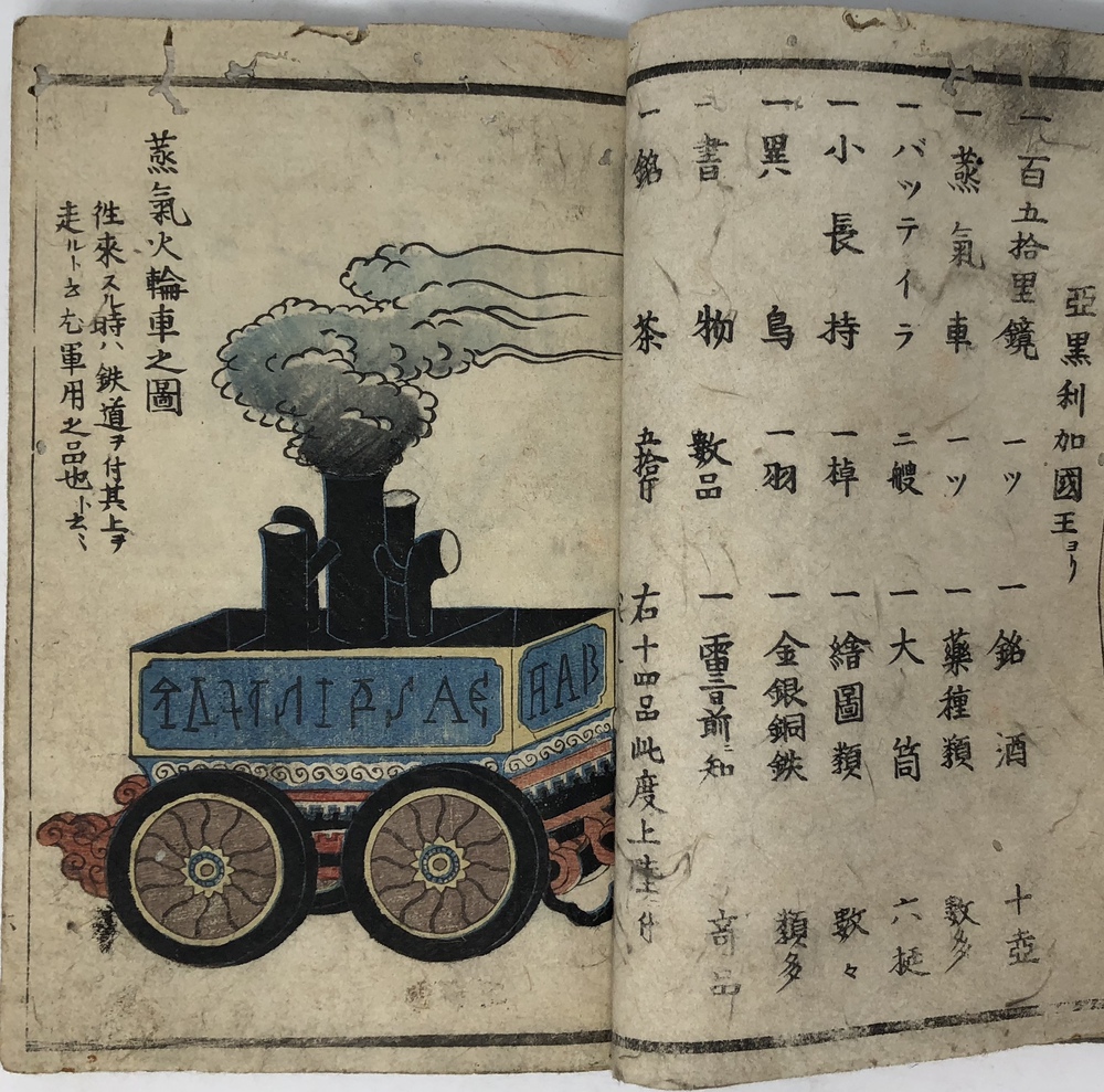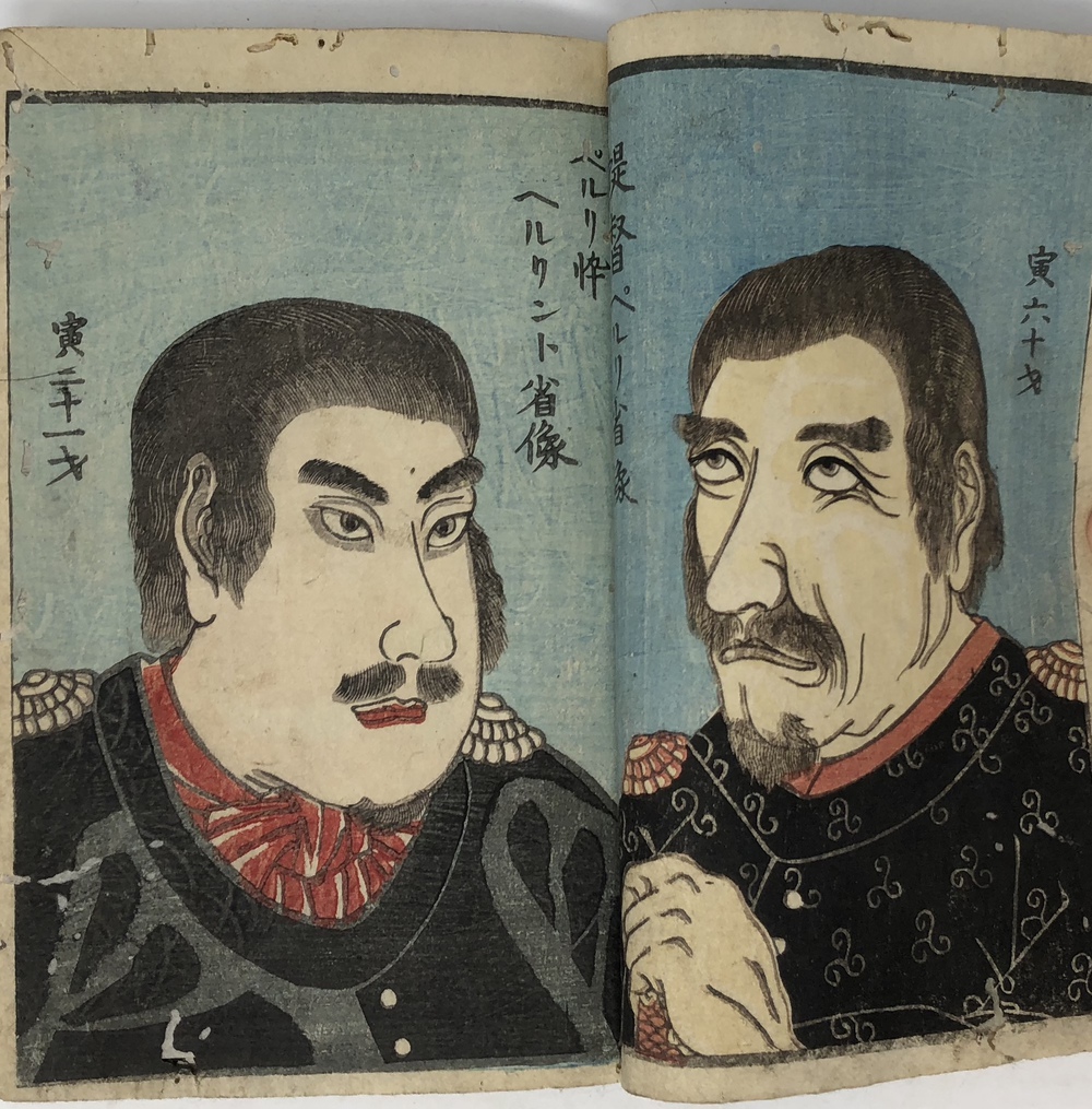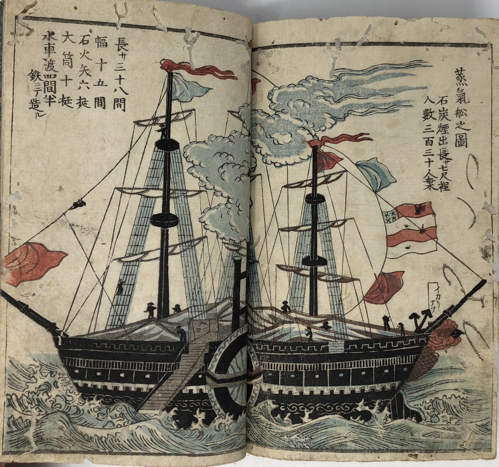 ペリー(Matthew Calbraith Perry, 1794-1858)による1853(嘉永6)年の浦賀来航と翌年の日米和親条約の締結は、江戸幕府が欧米諸国と近代的な外交条約を結んでいく端緒となった出来事としてあまりにも有名です。ペリーは、帰国後に議会への報告書として、俗に言う『日本遠征記(Narrative of the expedition of an American squadron to the China seas and Japan.1856)を刊行し、アメリカ側の最重要資料として広く流布しました。本書は、日本(幕府)側の公式文書の類ではありませんが、民衆も含めた当時の日本の人々がペリー来航をどのように捉えていたか、あるいは捉えようとしていたかを知ることができる貴重な資料です。 ペリー来航は、当時の一般の人々の関心を強く惹き、非合法出版物である「瓦版」と呼ばれる一枚ものの刷物や、絵巻物、写本が数多く作成されたことが知られています。作成された印刷物や写本や、それらがさらに筆写される形で流布してゆき、真贋問わず様々な形でペリー来航に関する情報が人々の間に伝播していきました。本書もまたこうした潮流に乗って作成されたと思われるものです。しかしながら、類似の資料の多くが読み捨て型の一枚ものや、諸藩役人の情報蒐集用としての巻物、あるいはそれらを筆写した写本だったのに対して、本書は多色木版刷りの刊本で書物一冊を費やした資料であることが非常に特徴的です。 本書は、その内容から見て二度目の来航を受けて作成された書物で、多色木版で印刷された多数の図版を主として、ペリー来航に備えた幕府の防備体制や、両国間で交わされた贈り物の数々、アメリカ側のペリーを中心とした使節の肖像や部隊の様子、装備などを紹介しています。 著者は不明ですが、冒頭の凡例において、アメリカという国がそもそもどのような国であるかを簡単に説明した上で、当時最大の注目を集めていた「黒船」すなわち蒸気船の驚くべき性能について触れており、「大海ヲ龍之渡ルガ如シ」と述べています。最初の図は、「両海岸略図」と題した江戸湾の警備体制を描いた図で、瓦版として発行された「柳都両岸略図」とほぼ同じ構図をとっています。テキストでは幕府によってペリー再来航に備えて組織された諸藩による警備分担を一覧の形で紹介しています。アメリカからの贈り物としては、特に印象的だったと思われる蒸気機関車の模型を筆頭に望遠鏡など数多くの珍しい品々を描いています。また、南北アメリカを描いた地図も収録しており、正確さはさておき各州名も記載しています。使節については、ペリーとその息子、アダムス提督などの主要人物の肖像画のほか、部隊兵士の装備や衣装も詳細に描いています。凡例でその高性能ぶりが強調されていた蒸気船が、見開き大でひときわ大きく描かれているのも、当時の人々が蒸気船から受けた衝撃の大きさが伝わってくるようです。最後にアメリカからの親書の和訳も掲載されており、当時の情報伝播の広さと素早さに驚かされます。 本書の際立った特徴である数多くの絵を作成したのは、浮世絵師の三木光斎(歌川芳盛, 1830-1885)で、彼は幕末期に数多くの横浜絵を手がけており、外国人を描くことに強い関心があった絵師のようです。 本書は、刊本であるにも関わらず、幕府の許可を受ける前に頒布に踏み切ったことから、すぐさま幕府によって摘発され、版木と刊本の没収、罰金等の処分がなされてしまったようです。その影響と思われますが、現存するものは非常に少ないようです。当時数多く作成されたペリー来航関係の印刷物、写本類は、外国の情報が初めて本格的に一般の人々の間に広く流布させることになりましたが、その中でも刊本として作成された異色の出来栄えである本書は、「開国」への兆しをもたらした大変貴重な文献と言うことができるものと思われます。