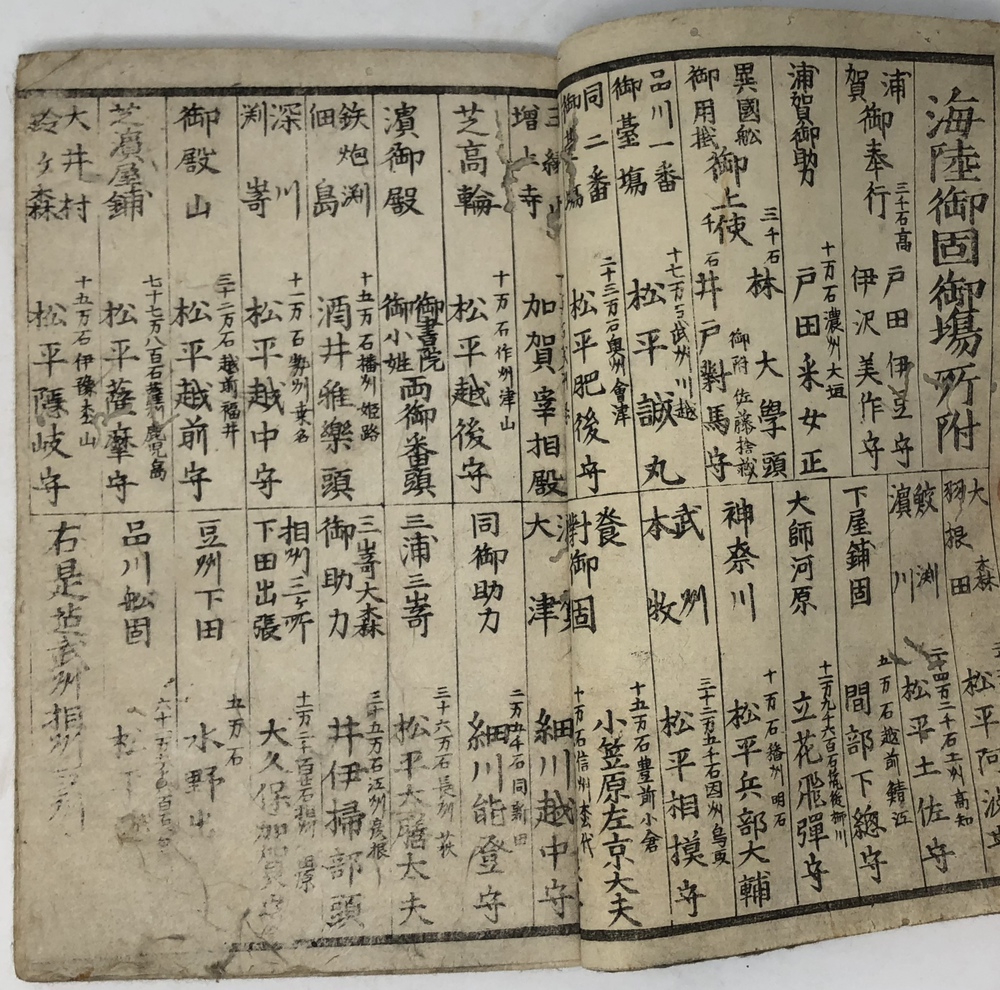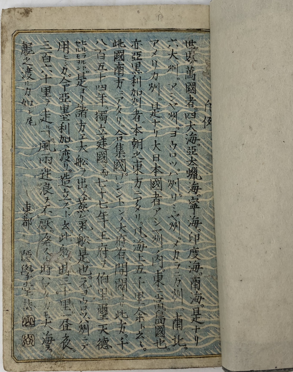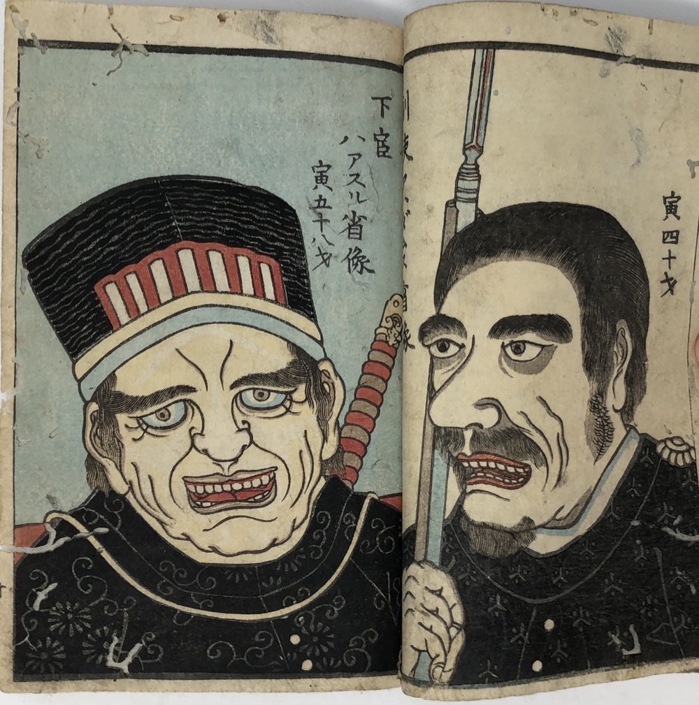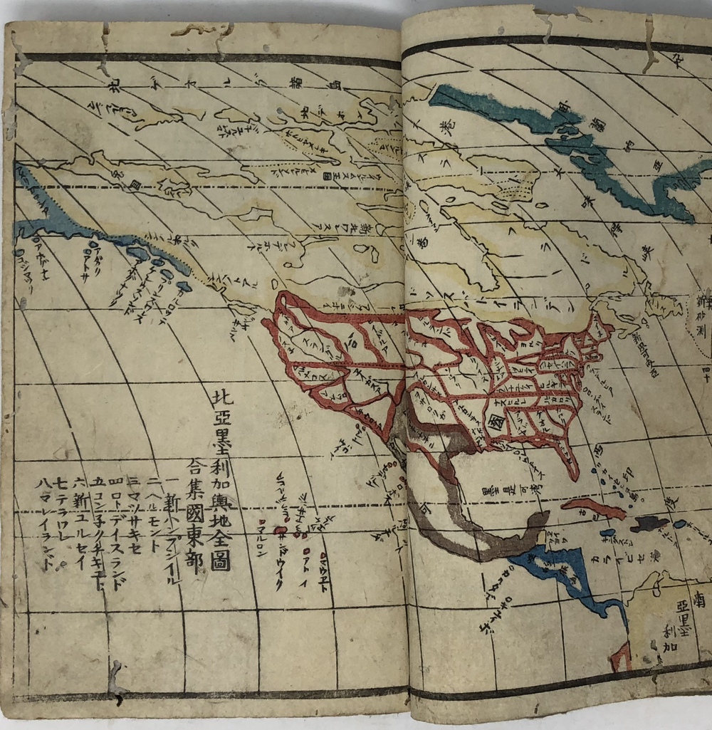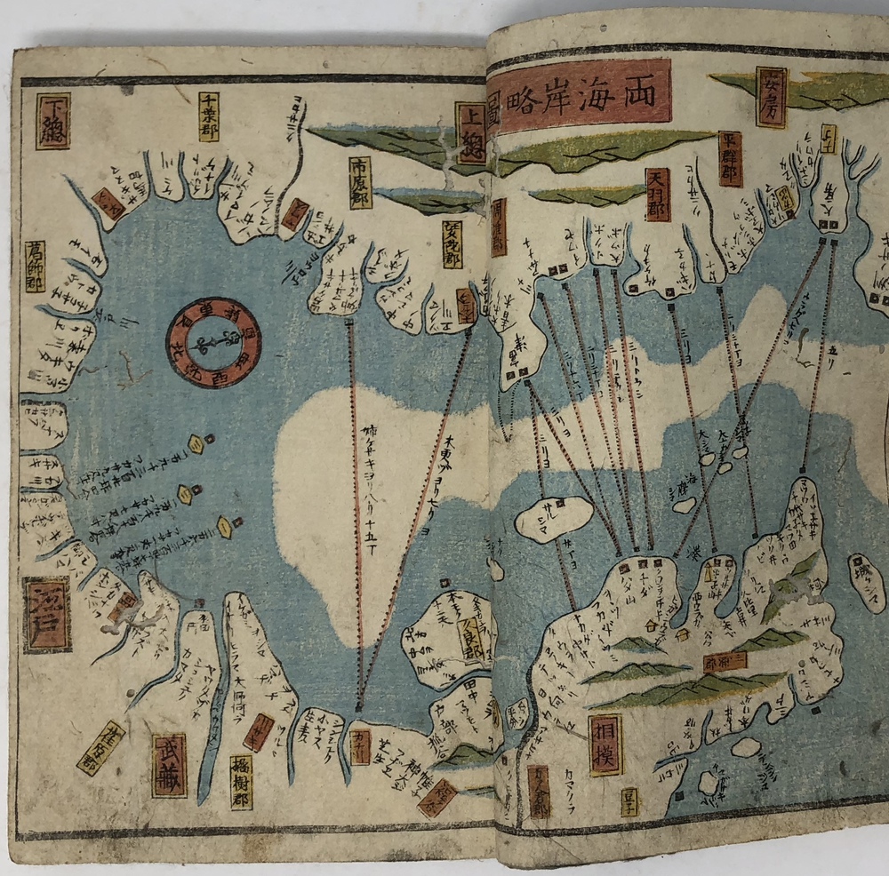 ペリー(Matthew Calbraith Perry, 1794-1858)による1853(嘉永6)年の浦賀来航と翌年の日米和親条約の締結は、江戸幕府が欧米諸国と近代的な外交条約を結んでいく端緒となった出来事としてあまりにも有名です。ペリーは、帰国後に議会への報告書として、俗に言う『日本遠征記(Narrative of the expedition of an American squadron to the China seas and Japan.1856)を刊行し、アメリカ側の最重要資料として広く流布しました。本書は、日本(幕府)側の公式文書の類ではありませんが、民衆も含めた当時の日本の人々がペリー来航をどのように捉えていたか、あるいは捉えようとしていたかを知ることができる貴重な資料です。 ペリー来航は、当時の一般の人々の関心を強く惹き、非合法出版物である「瓦版」と呼ばれる一枚ものの刷物や、絵巻物、写本が数多く作成されたことが知られています。作成された印刷物や写本や、それらがさらに筆写される形で流布してゆき、真贋問わず様々な形でペリー来航に関する情報が人々の間に伝播していきました。本書もまたこうした潮流に乗って作成されたと思われるものです。しかしながら、類似の資料の多くが読み捨て型の一枚ものや、諸藩役人の情報蒐集用としての巻物、あるいはそれらを筆写した写本だったのに対して、本書は多色木版刷りの刊本で書物一冊を費やした資料であることが非常に特徴的です。 本書は、その内容から見て二度目の来航を受けて作成された書物で、多色木版で印刷された多数の図版を主として、ペリー来航に備えた幕府の防備体制や、両国間で交わされた贈り物の数々、アメリカ側のペリーを中心とした使節の肖像や部隊の様子、装備などを紹介しています。 著者は不明ですが、冒頭の凡例において、アメリカという国がそもそもどのような国であるかを簡単に説明した上で、当時最大の注目を集めていた「黒船」すなわち蒸気船の驚くべき性能について触れており、「大海ヲ龍之渡ルガ如シ」と述べています。最初の図は、「両海岸略図」と題した江戸湾の警備体制を描いた図で、瓦版として発行された「柳都両岸略図」とほぼ同じ構図をとっています。テキストでは幕府によってペリー再来航に備えて組織された諸藩による警備分担を一覧の形で紹介しています。アメリカからの贈り物としては、特に印象的だったと思われる蒸気機関車の模型を筆頭に望遠鏡など数多くの珍しい品々を描いています。また、南北アメリカを描いた地図も収録しており、正確さはさておき各州名も記載しています。使節については、ペリーとその息子、アダムス提督などの主要人物の肖像画のほか、部隊兵士の装備や衣装も詳細に描いています。凡例でその高性能ぶりが強調されていた蒸気船が、見開き大でひときわ大きく描かれているのも、当時の人々が蒸気船から受けた衝撃の大きさが伝わってくるようです。最後にアメリカからの親書の和訳も掲載されており、当時の情報伝播の広さと素早さに驚かされます。 本書の際立った特徴である数多くの絵を作成したのは、浮世絵師の三木光斎(歌川芳盛, 1830-1885)で、彼は幕末期に数多くの横浜絵を手がけており、外国人を描くことに強い関心があった絵師のようです。 本書は、刊本であるにも関わらず、幕府の許可を受ける前に頒布に踏み切ったことから、すぐさま幕府によって摘発され、版木と刊本の没収、罰金等の処分がなされてしまったようです。その影響と思われますが、現存するものは非常に少ないようです。当時数多く作成されたペリー来航関係の印刷物、写本類は、外国の情報が初めて本格的に一般の人々の間に広く流布させることになりましたが、その中でも刊本として作成された異色の出来栄えである本書は、「開国」への兆しをもたらした大変貴重な文献と言うことができるものと思われます。